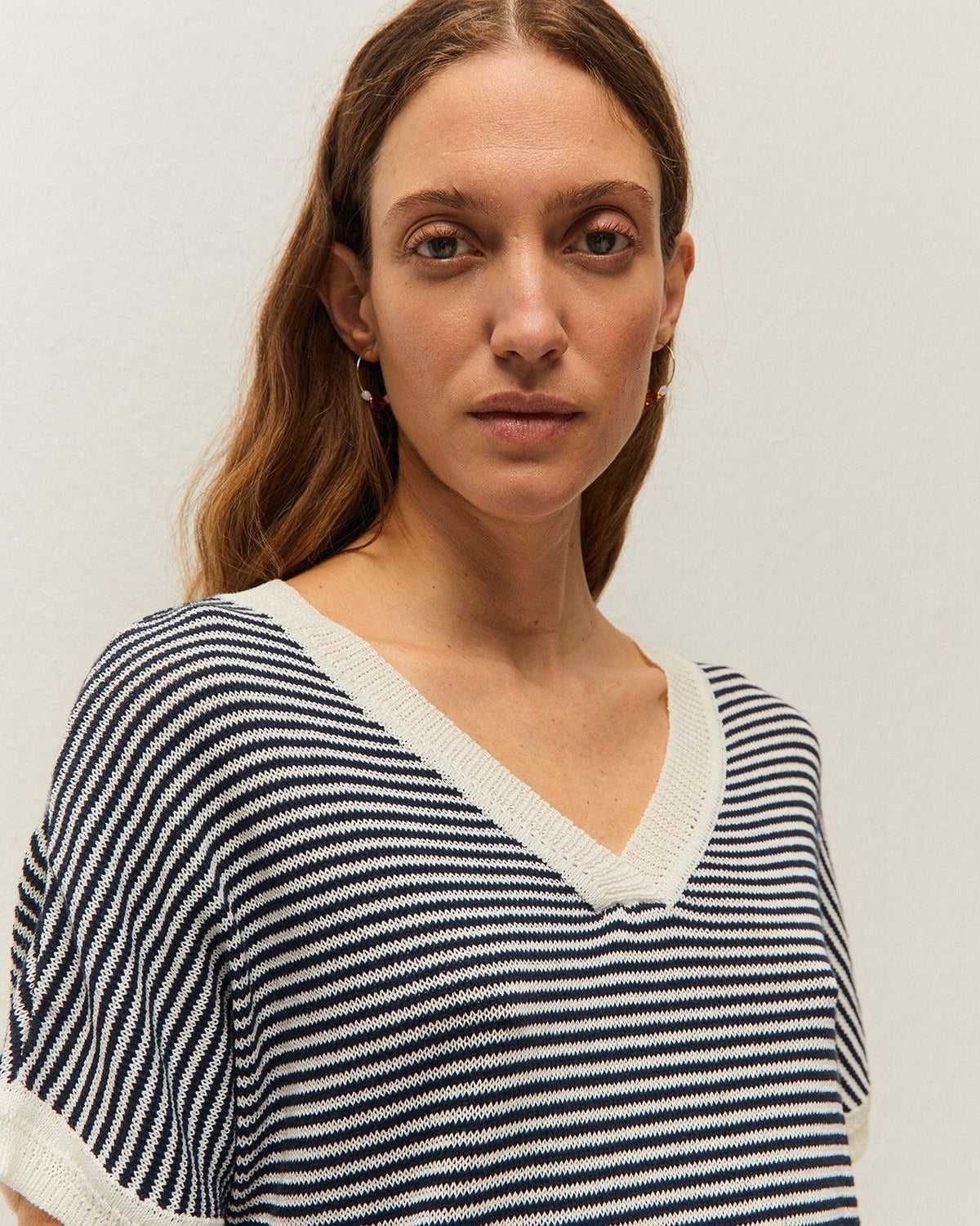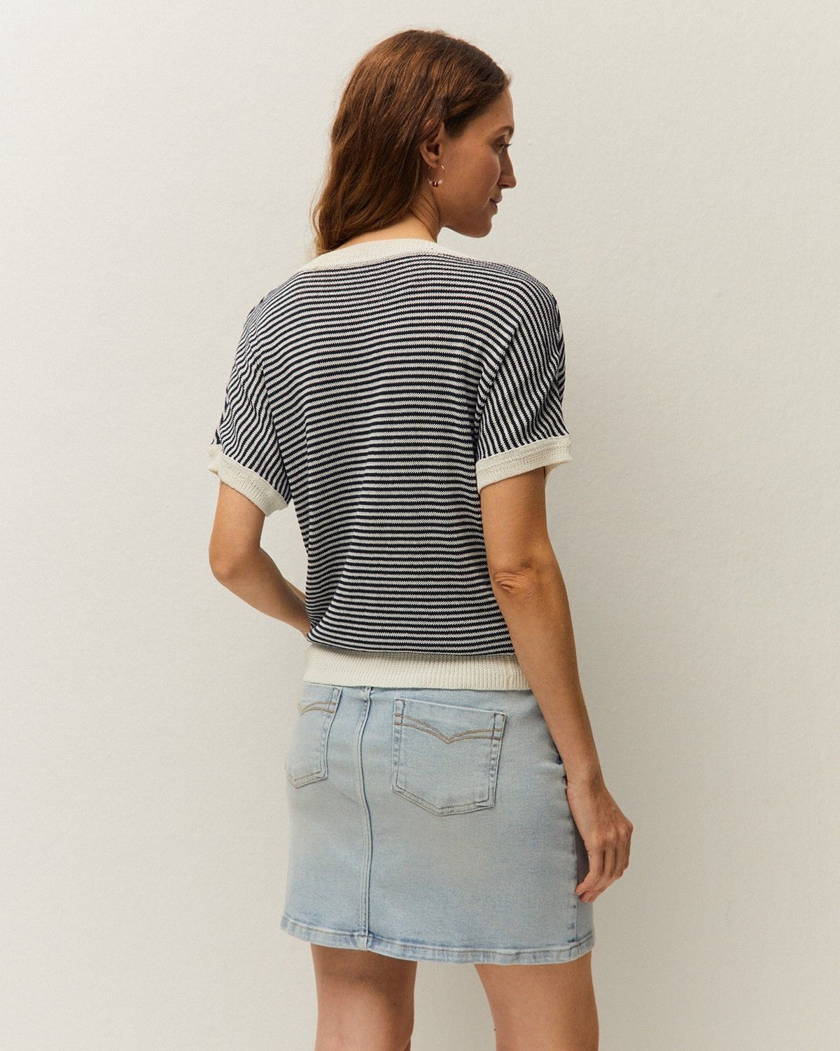 Jersey de rayas con cuello pico y manga corta. Detalle en escote, bajo y puños a contraste.
