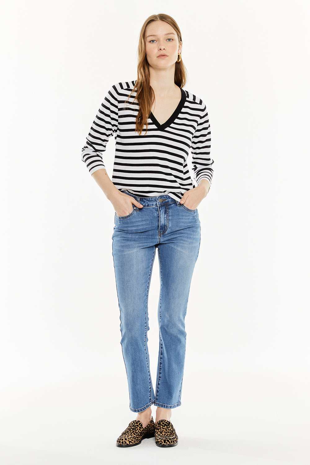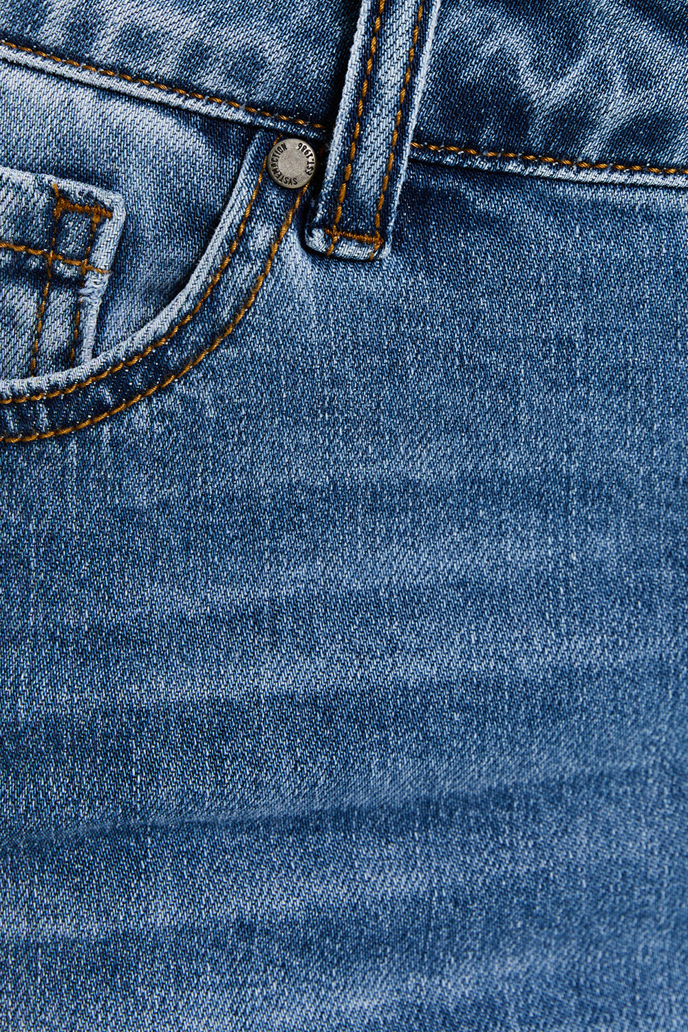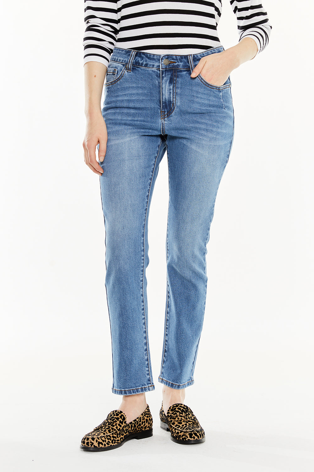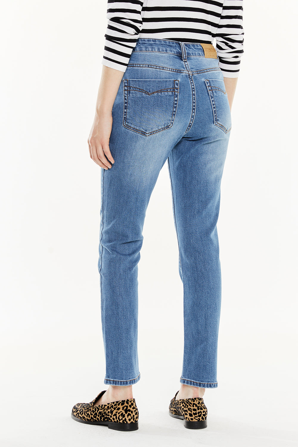 Pantalon en denim bleu ajusté à cinq poches pour femme.