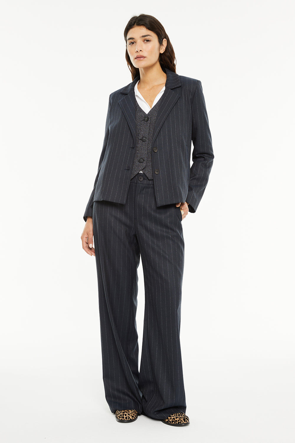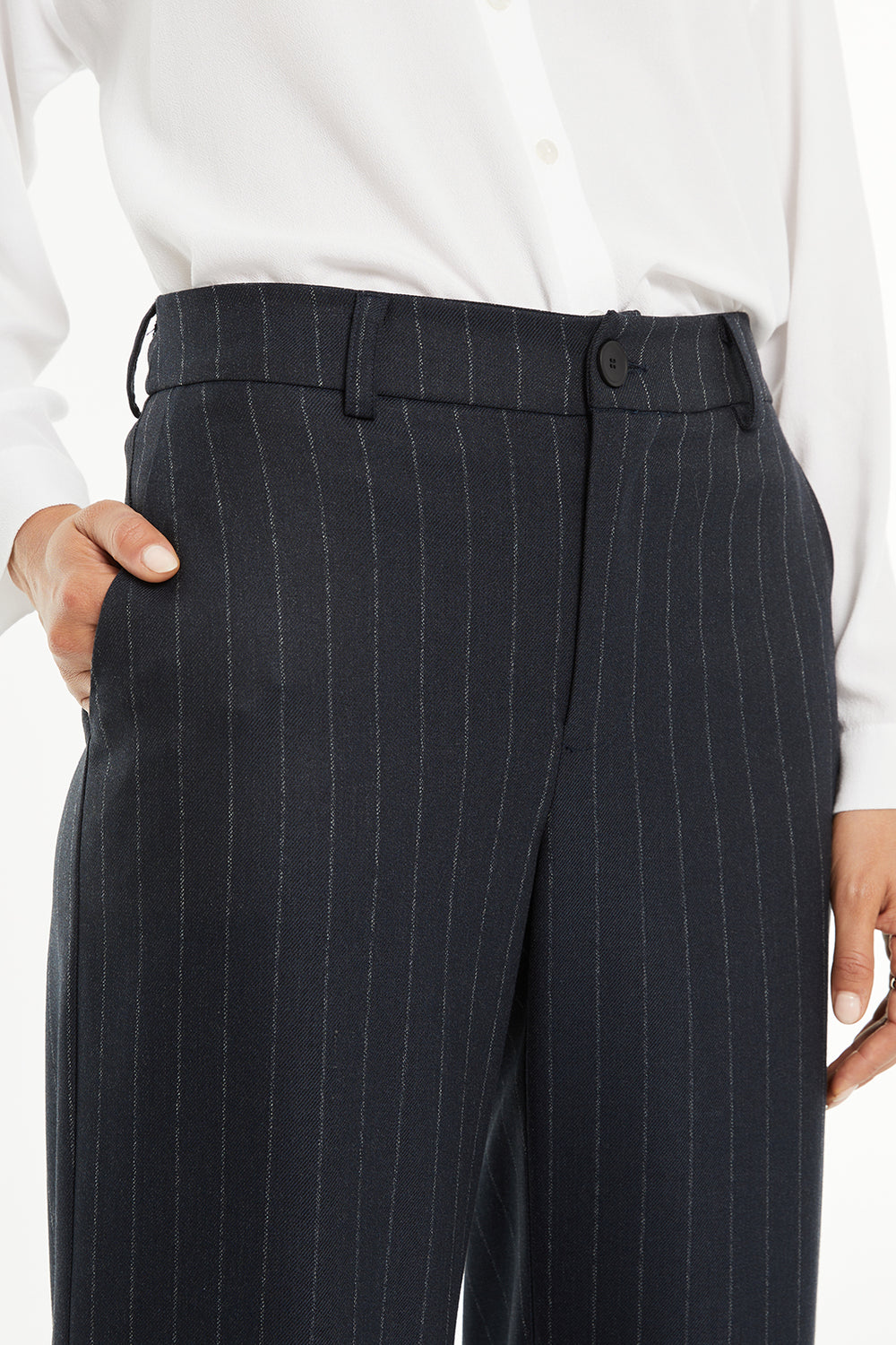 Pantalon pour femme à fines rayures, poches latérales et fermeture intérieure par crochet.