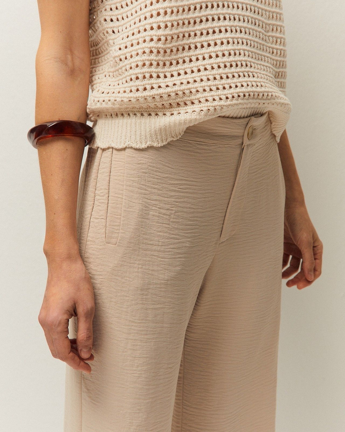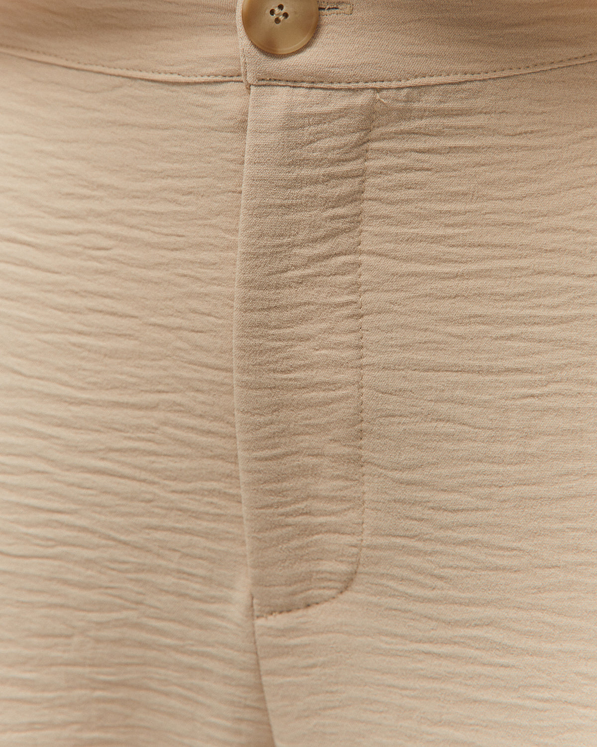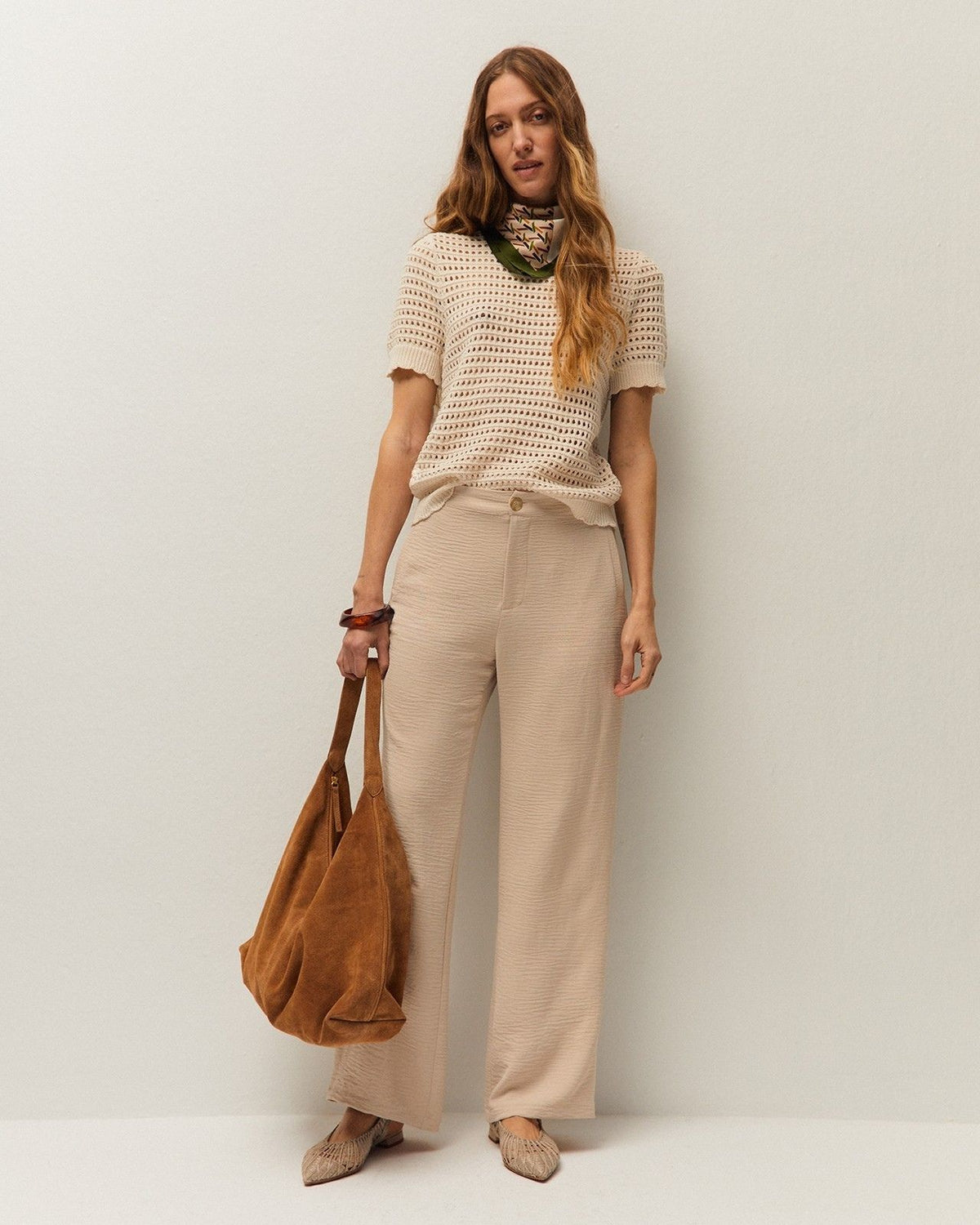 Pantalón recto con goma en la espalda y bolsillos laterales. Cierre con cremallera y botón. Prenda sostenible.