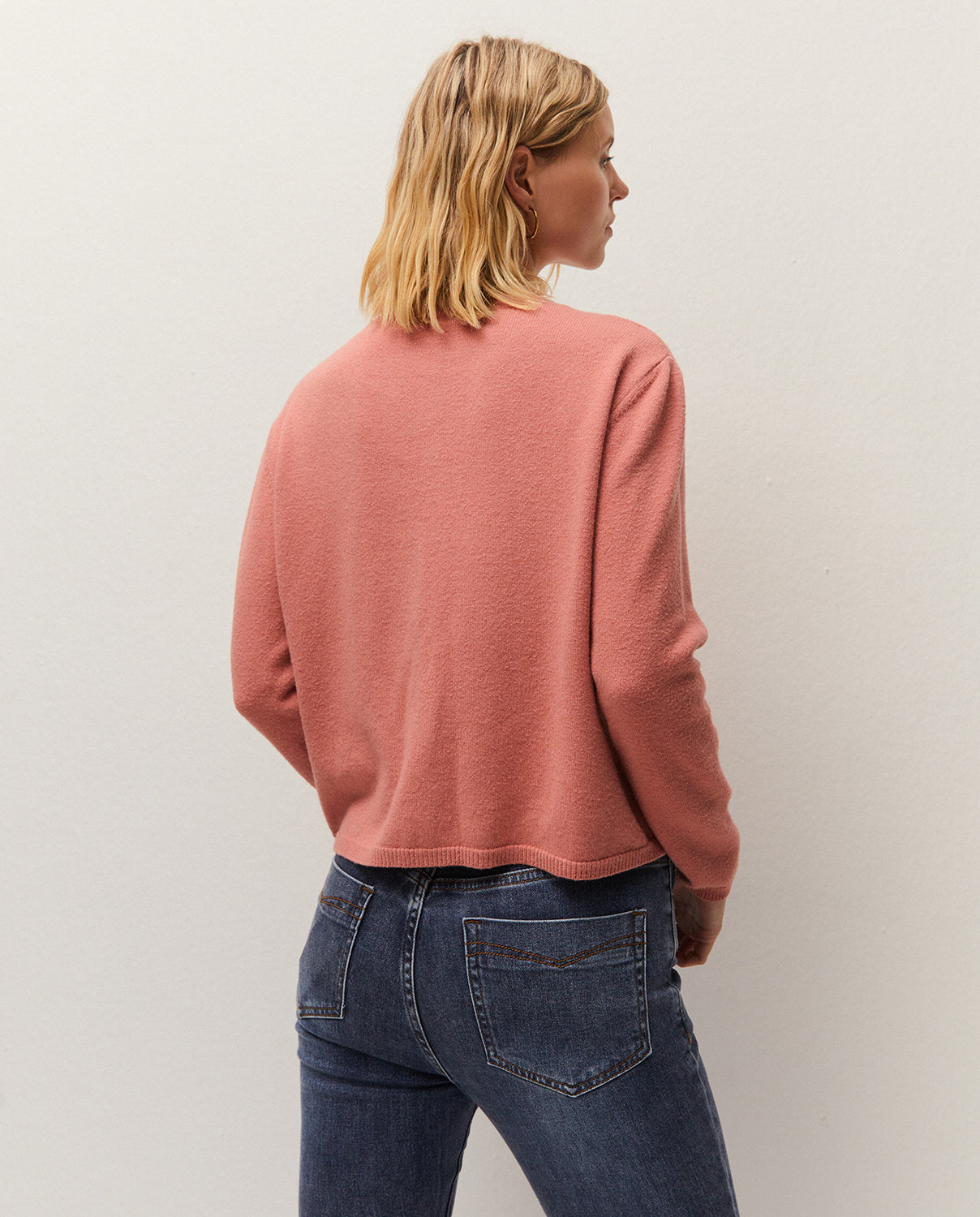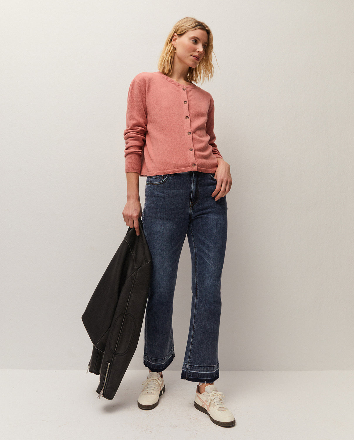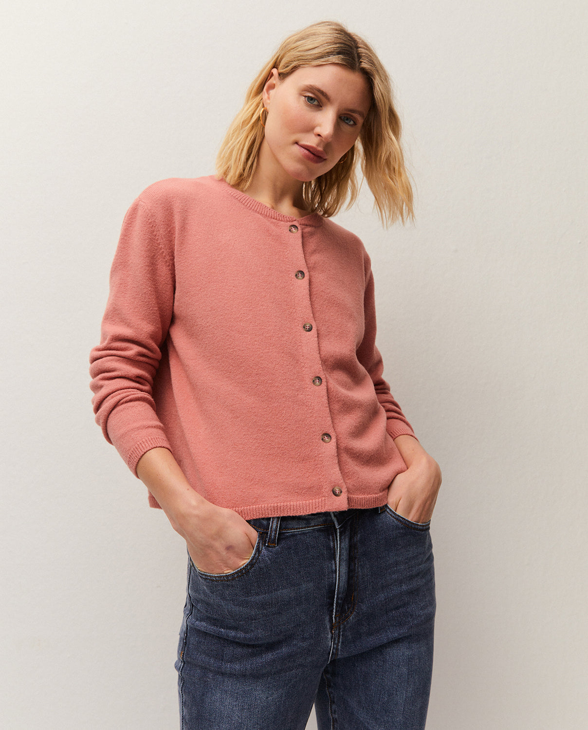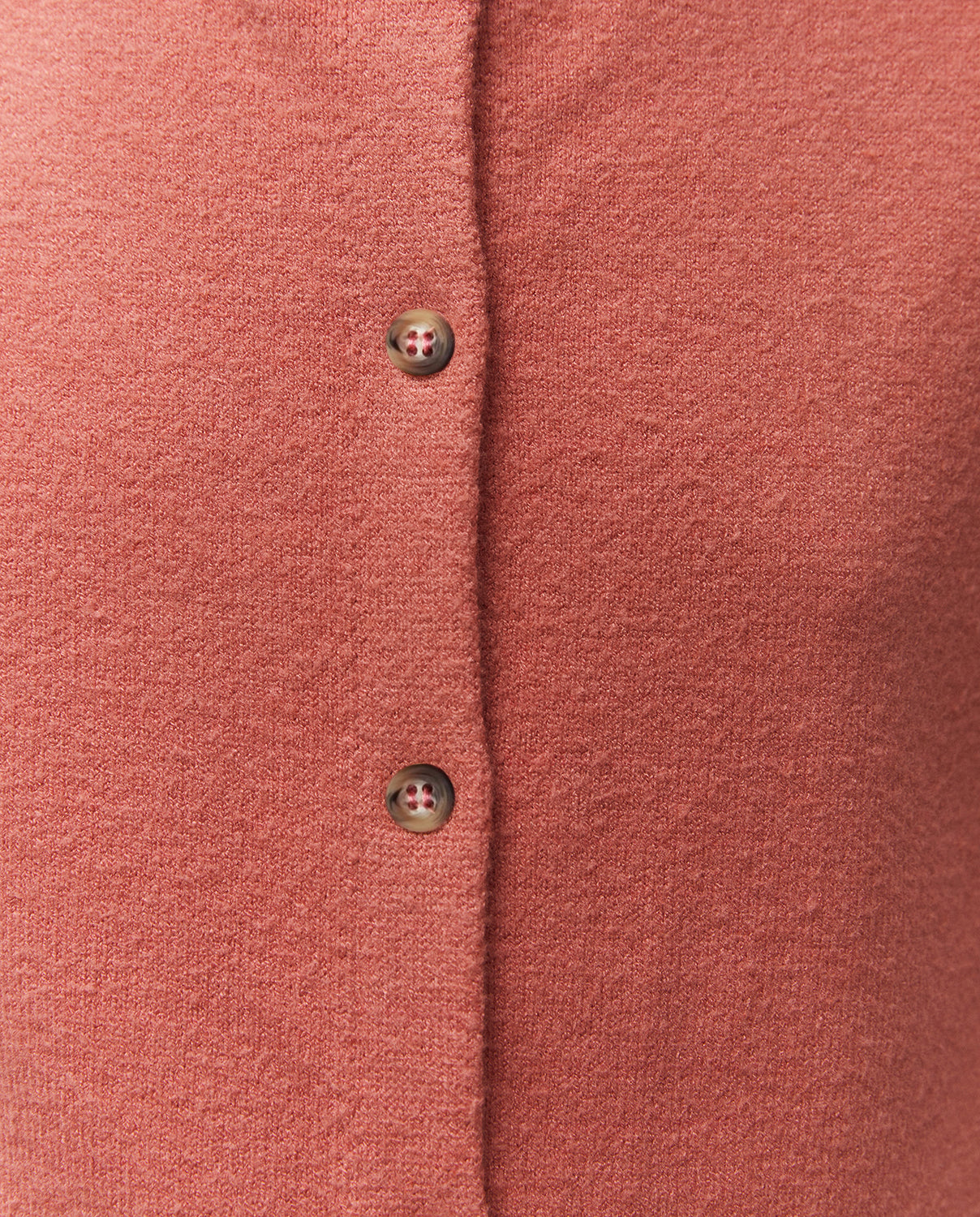 Rebeca de cuello redondo y manga larga. Cierre delantero con botones.