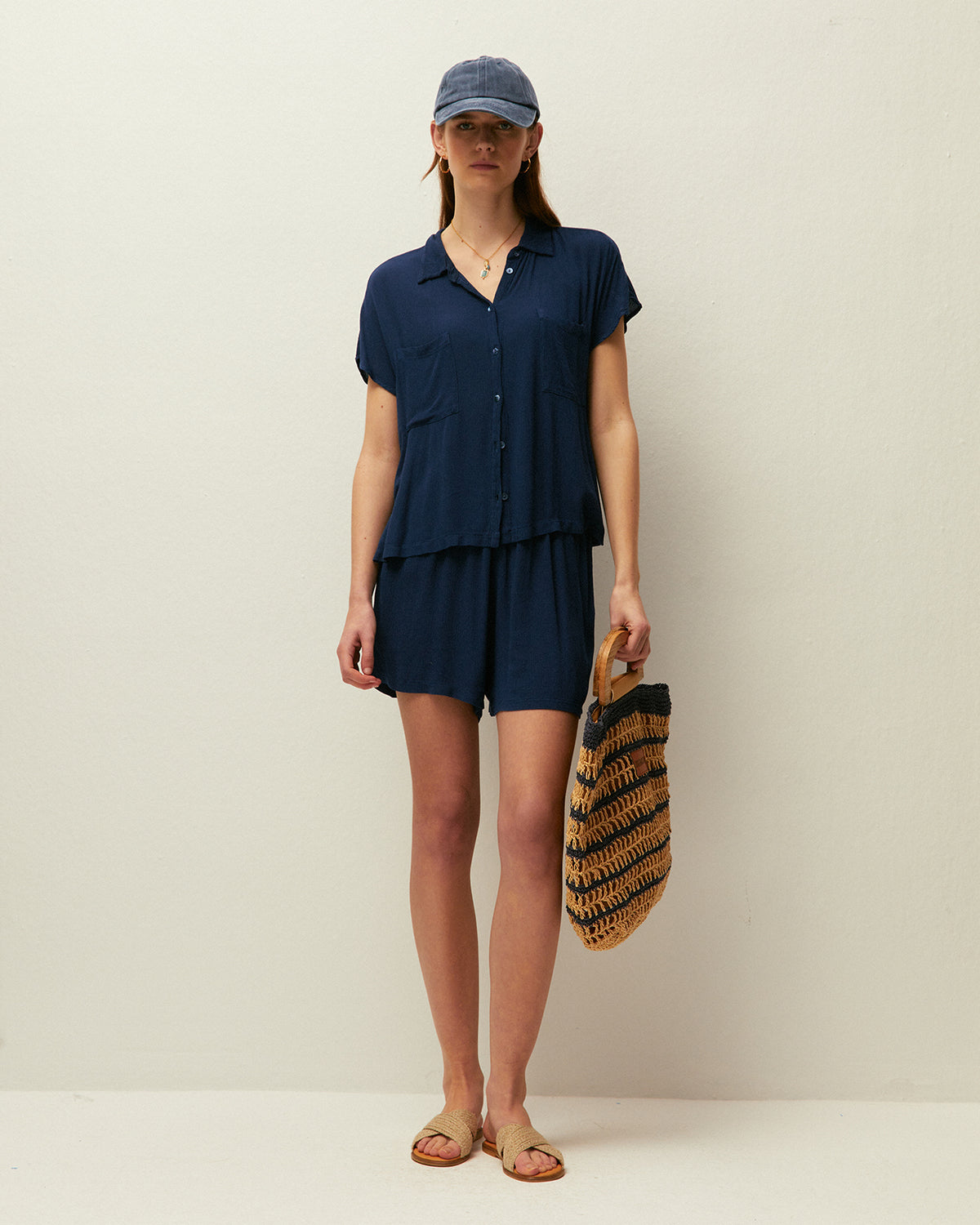 Short fluido con goma en la cintura y bolsillos laterales. Prenda sostenible.
