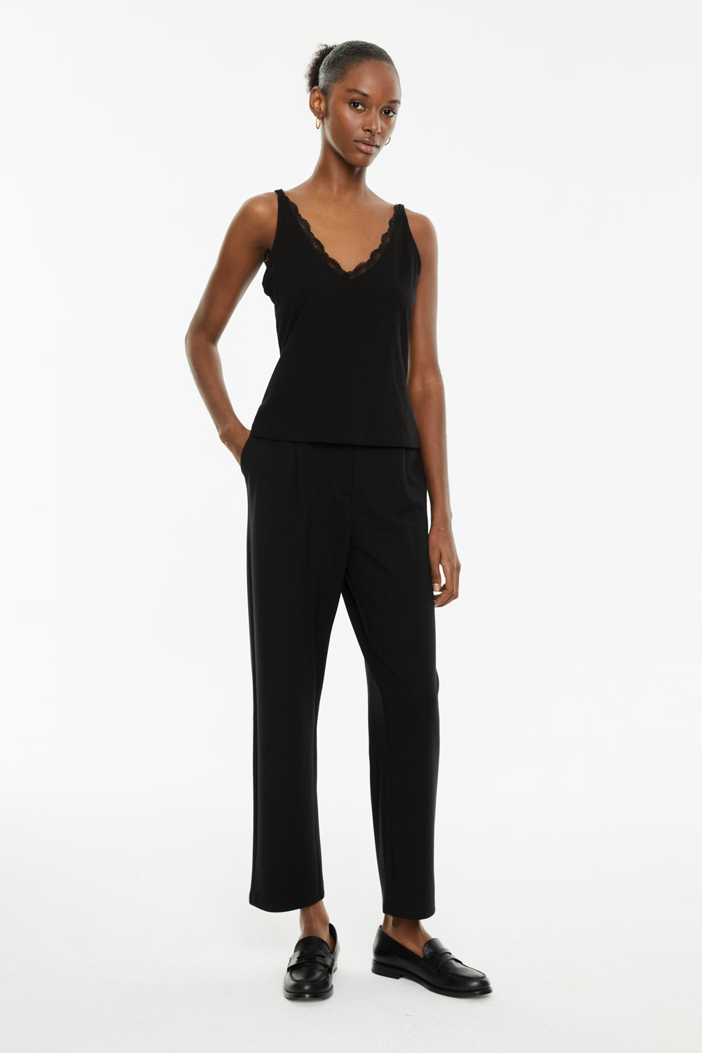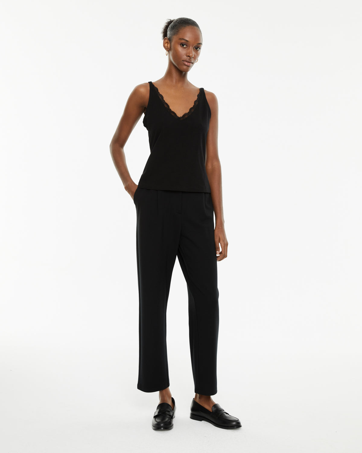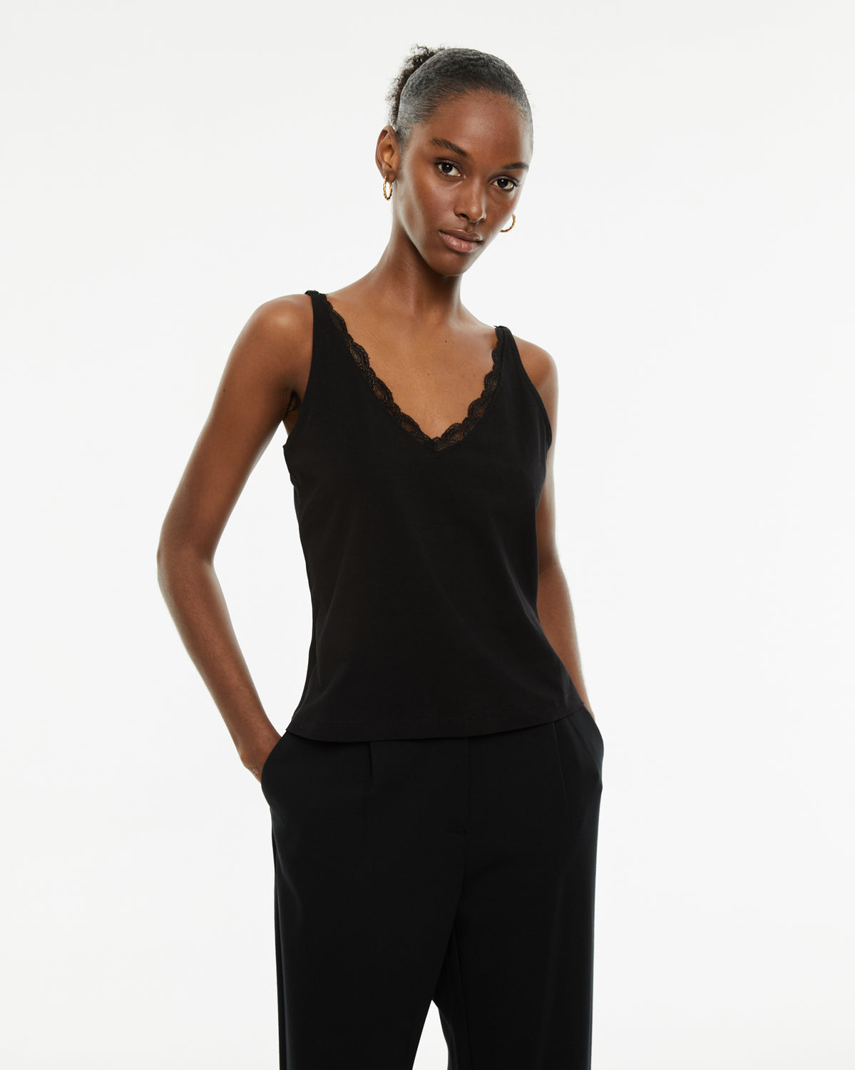 Haut ajusté basique pour femme avec bretelles, décolleté en V et bordure en dentelle. Tissu en coton