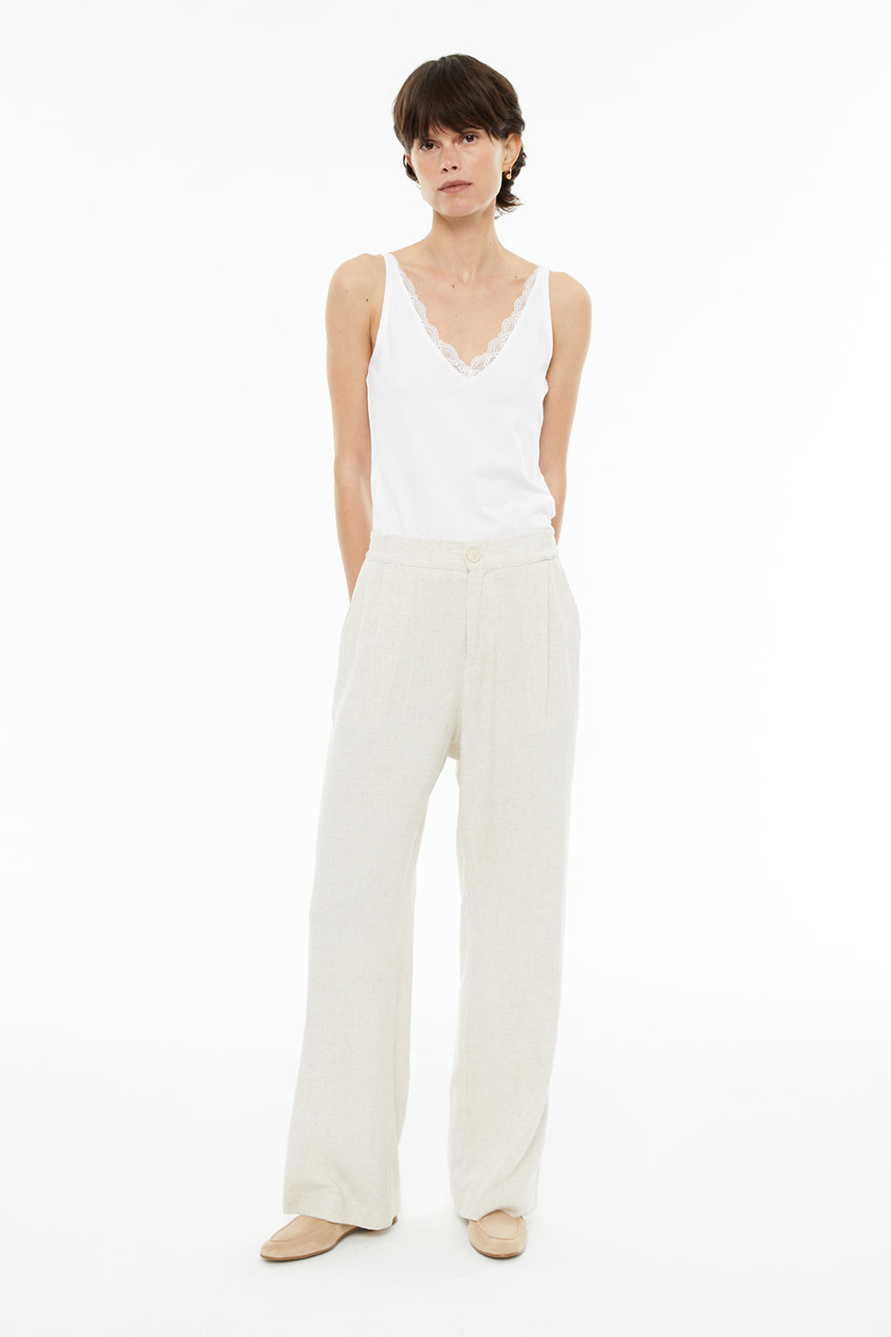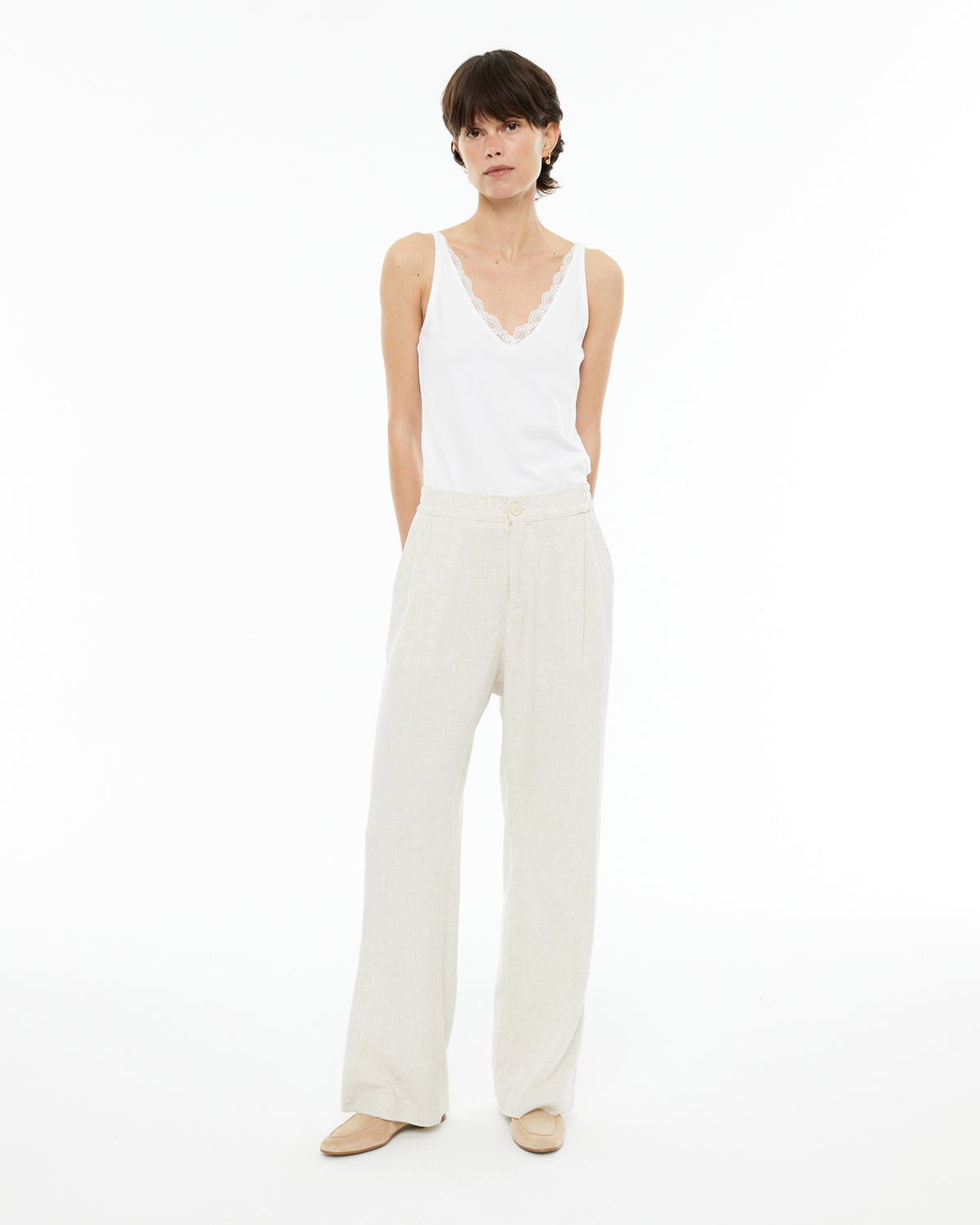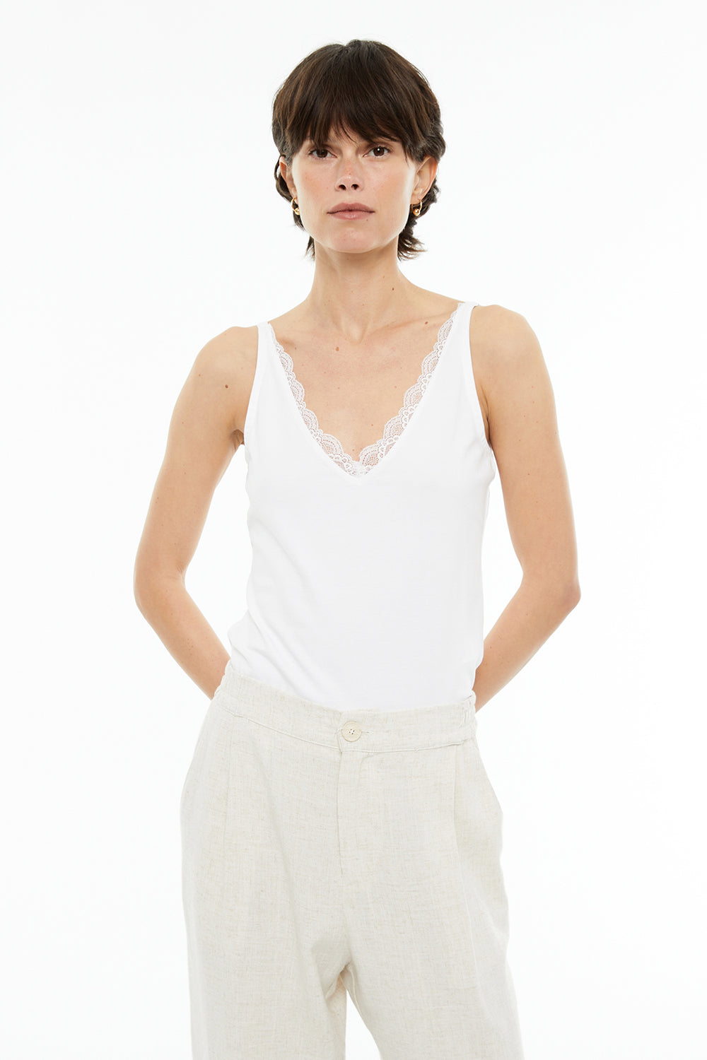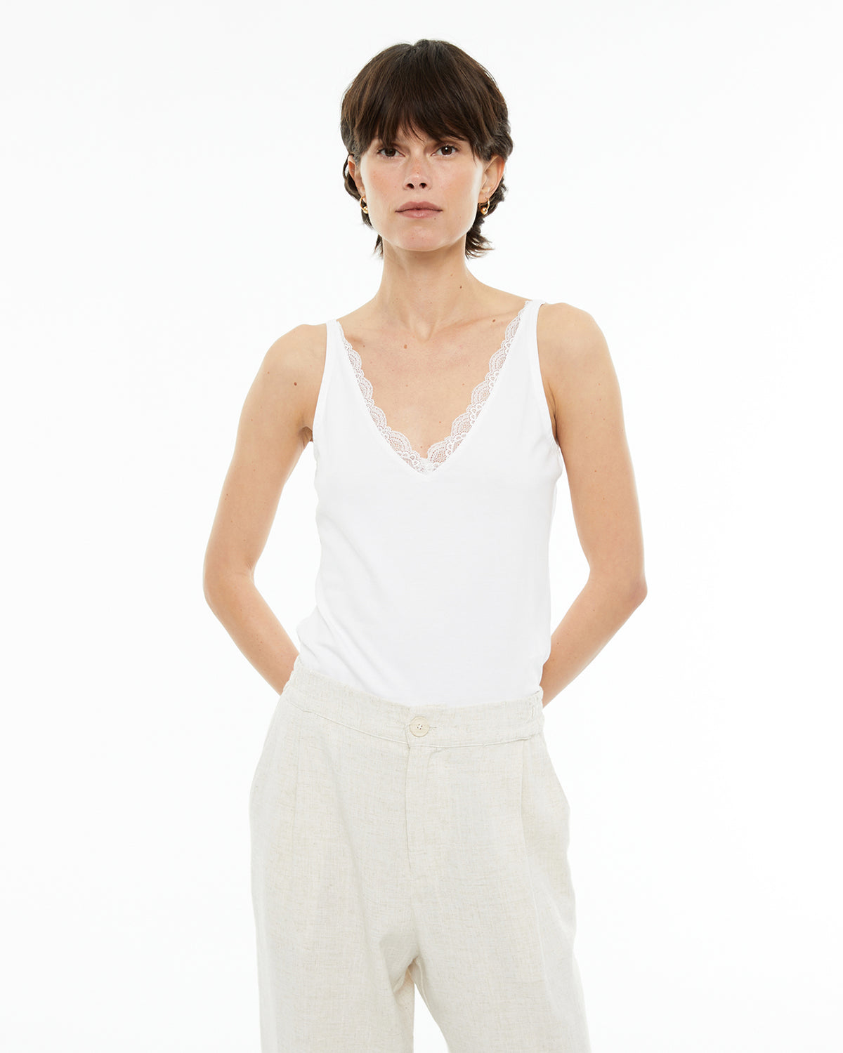 Haut ajusté basique pour femme avec bretelles, décolleté en V et bordure en dentelle. Tissu en coton