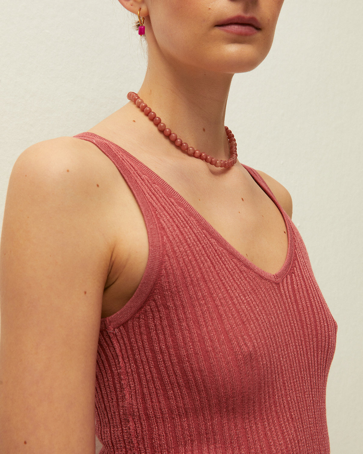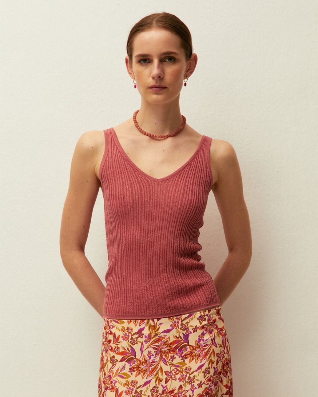 Top con cuello pico y tirantes, confeccionado en tejido de punto con lúrex.