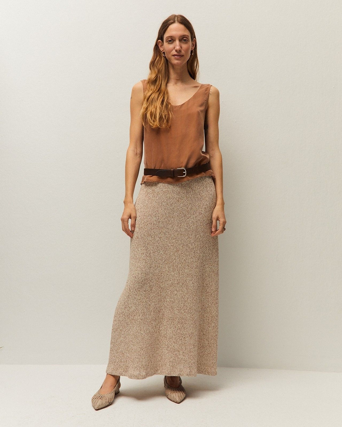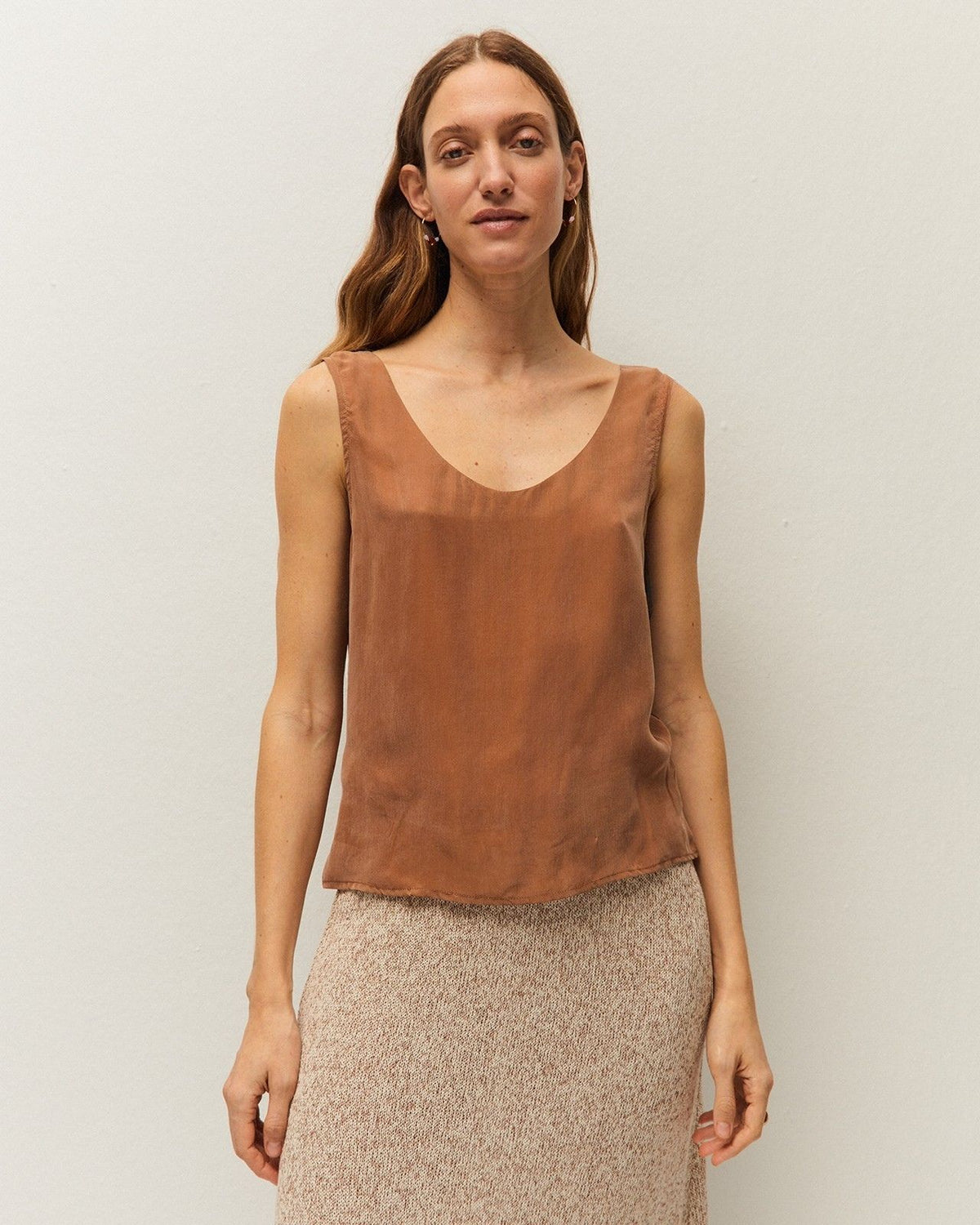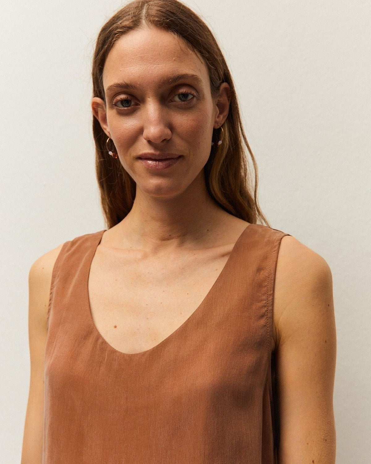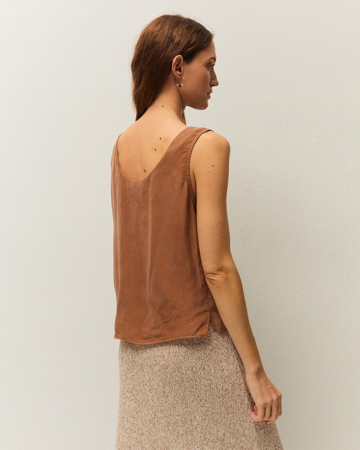 Top de cupro con cuello redondo y tirantes. Detalle de aberturas en los laterales. Prenda sostenible.