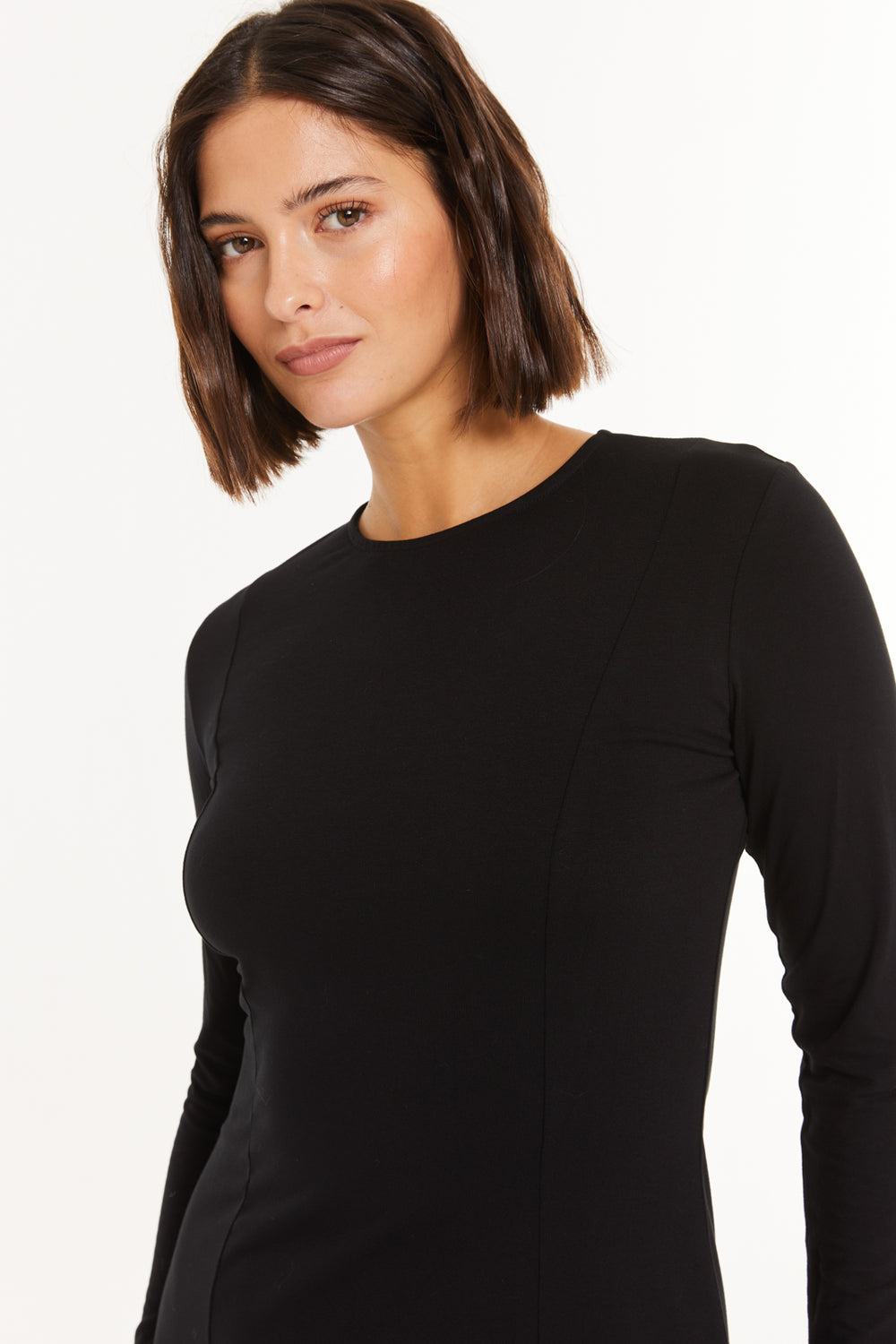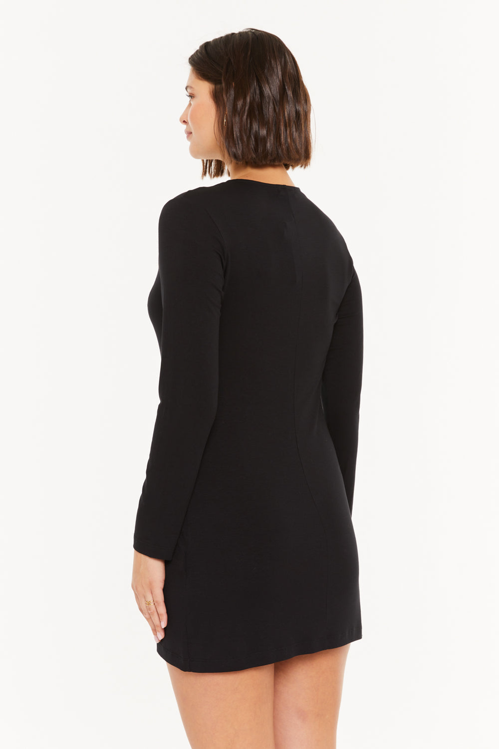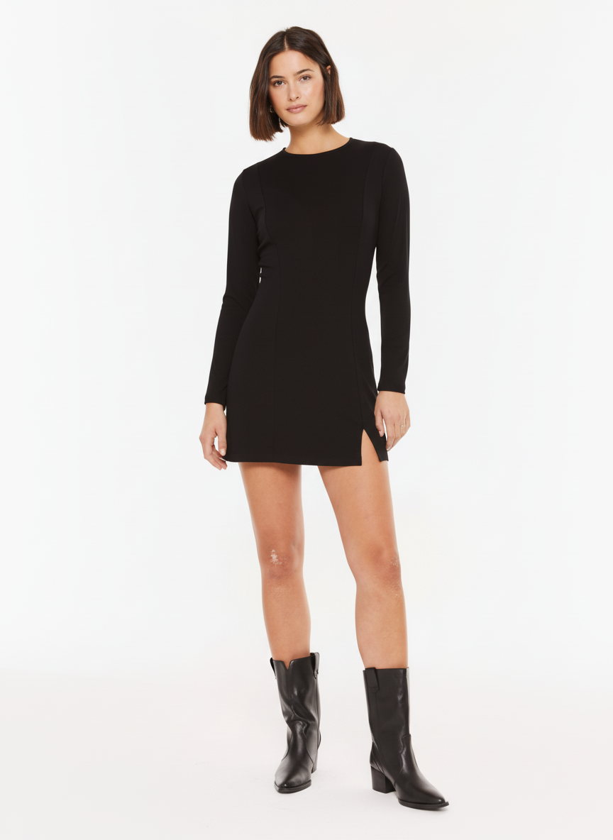 Robe courte pour femme, à encolure ronde, empiècements latéraux et fente sur le devant. Vêtement écoresponsable.