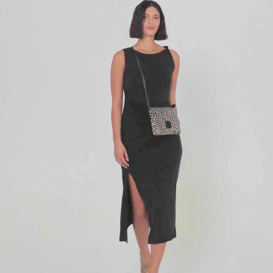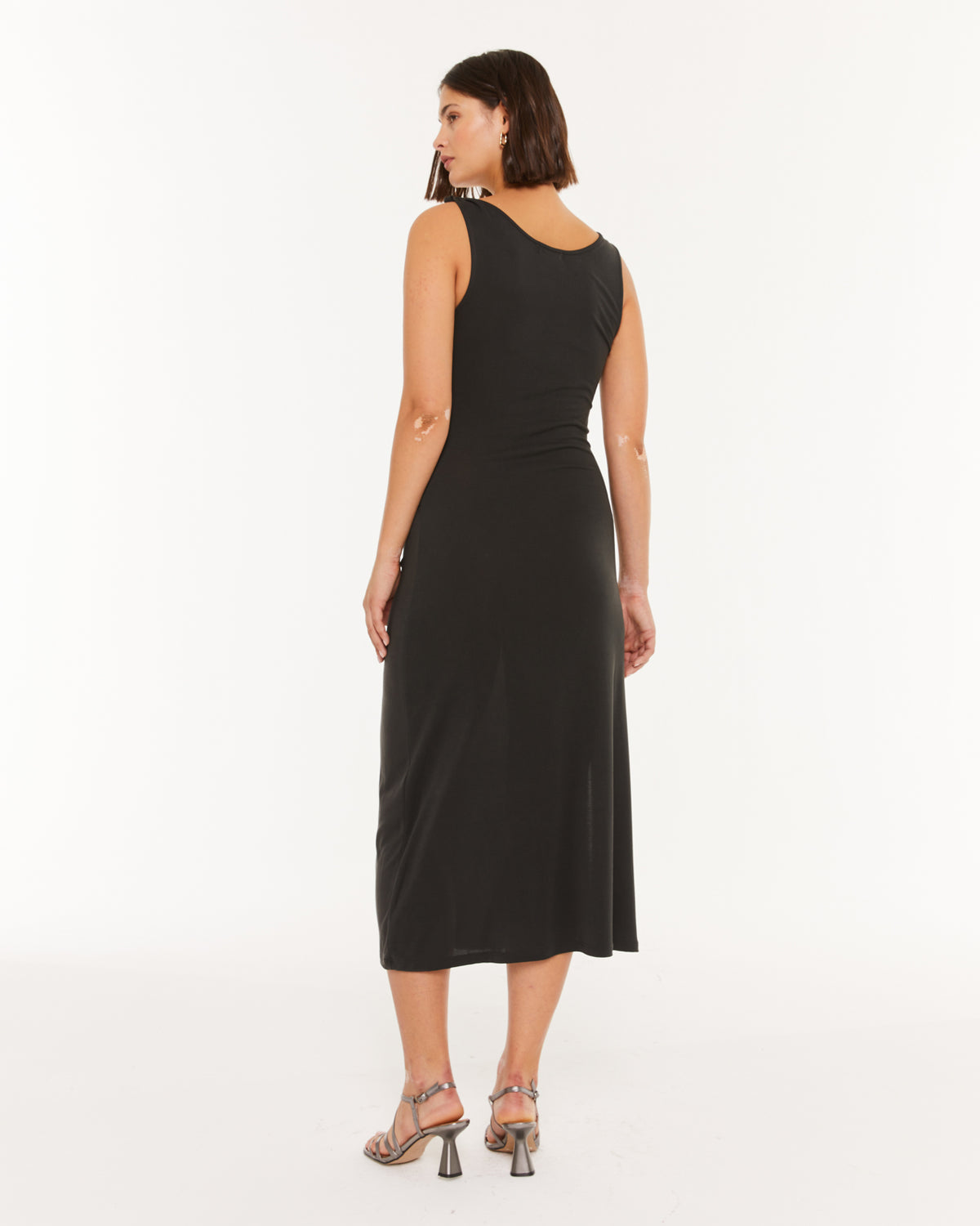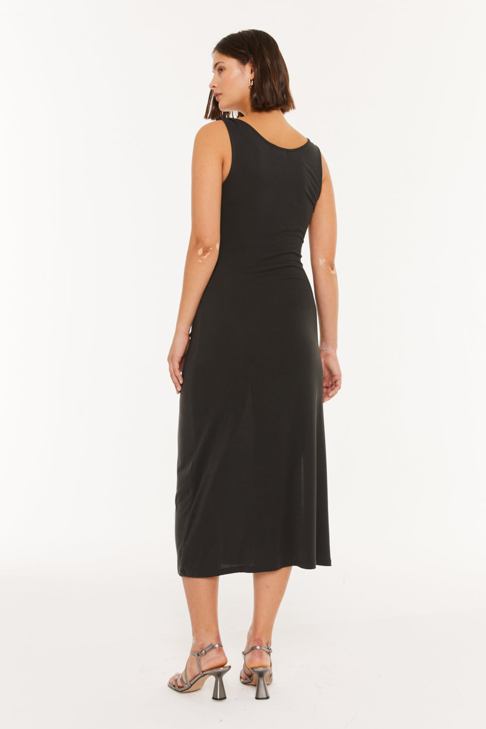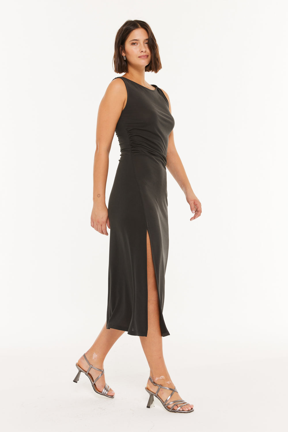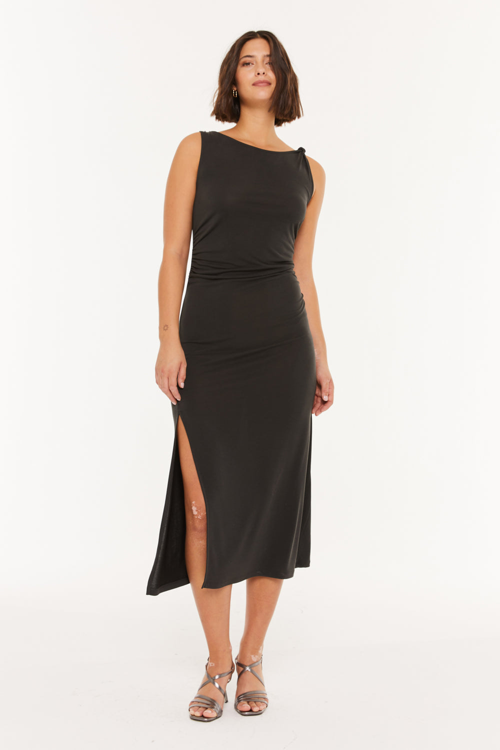 Robe midi pour femme avec encolure ronde, détail nœud sur la bretelle, fronces latérales et fente. Vêtement durable.