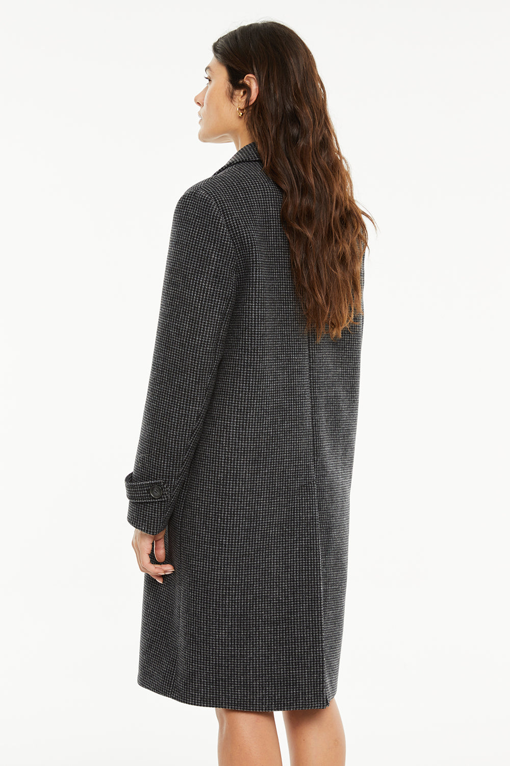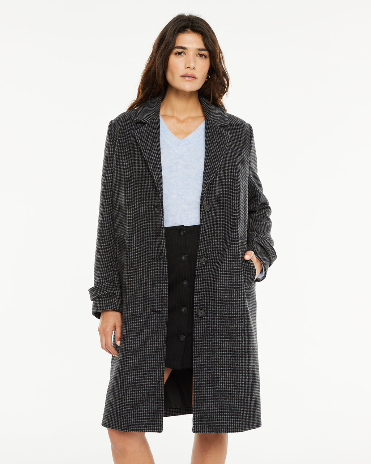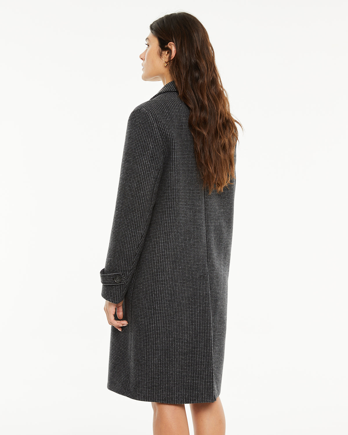 Abrigo de mujer con tejido de fantasía, cuello con solapa, cierre con botones y bolsillos en la parte delantera.