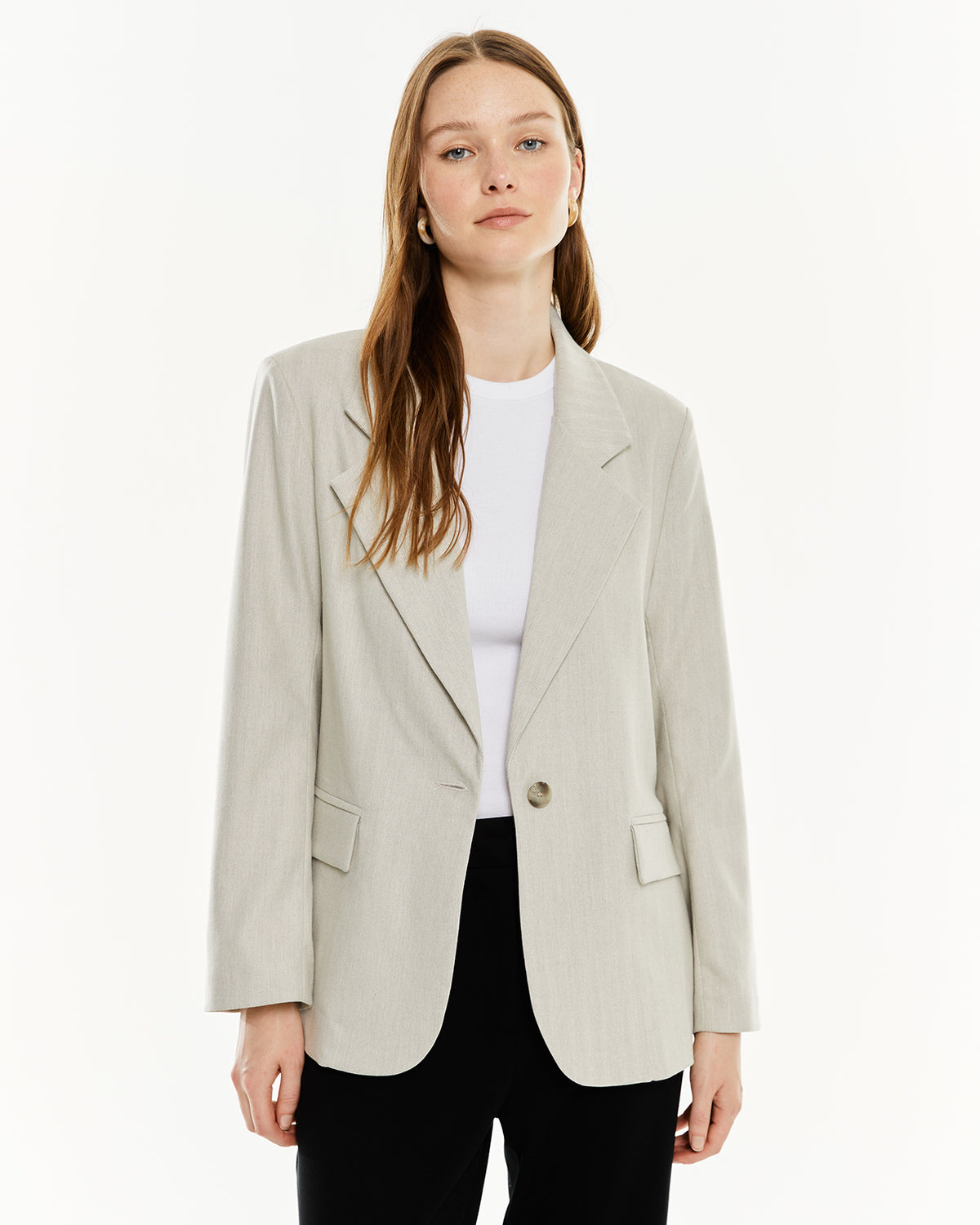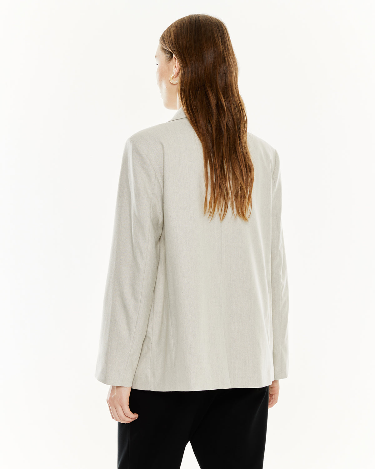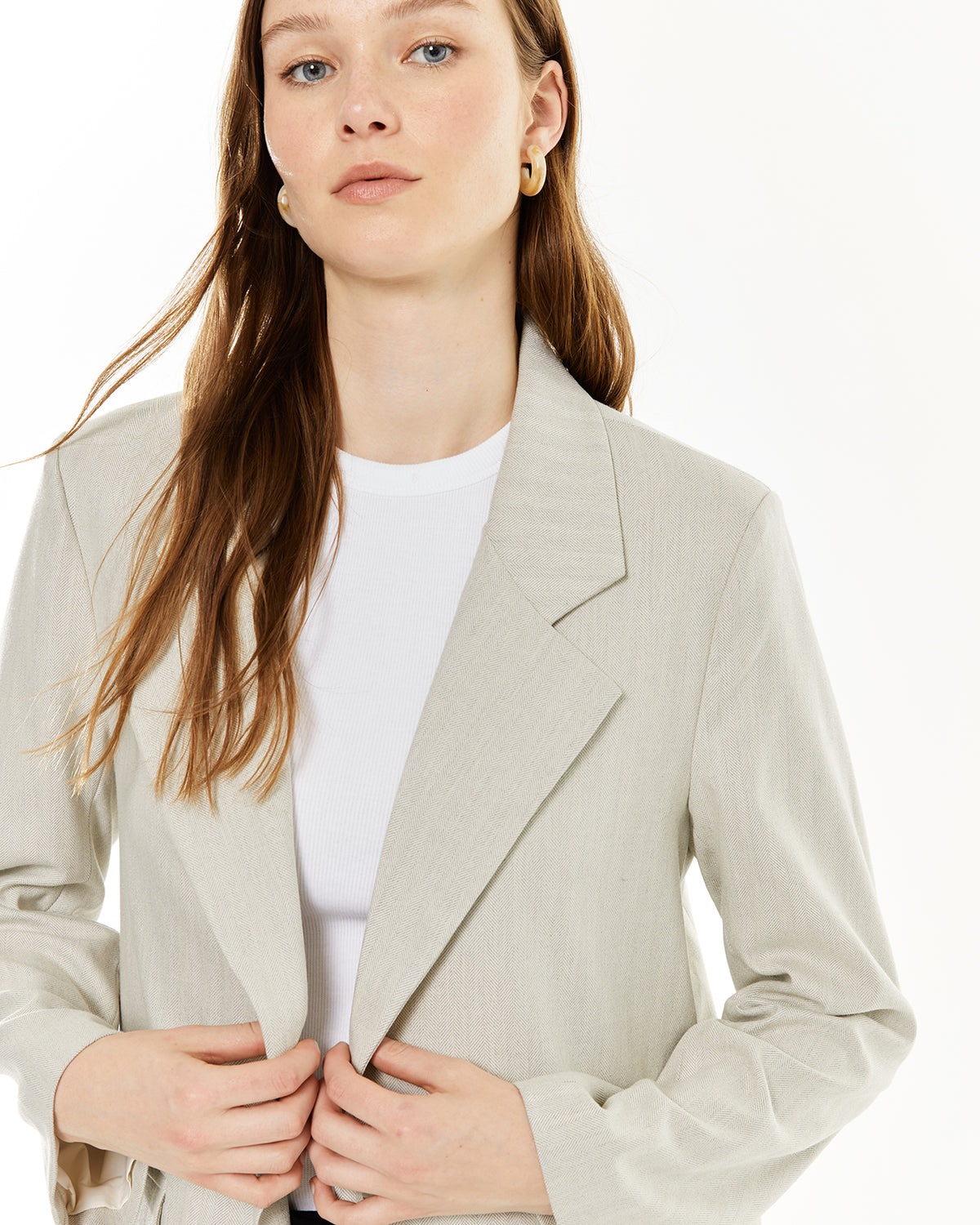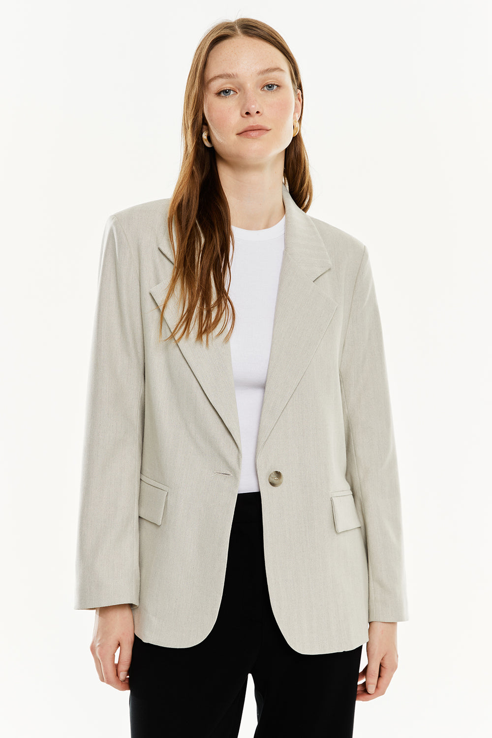 Americana de mujer con tejido de espiga, escote tipo solapa, cierre frontal con botón y bolsillos con tapeta.