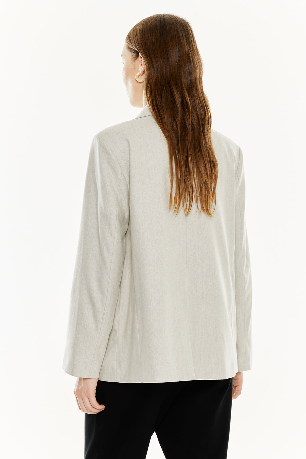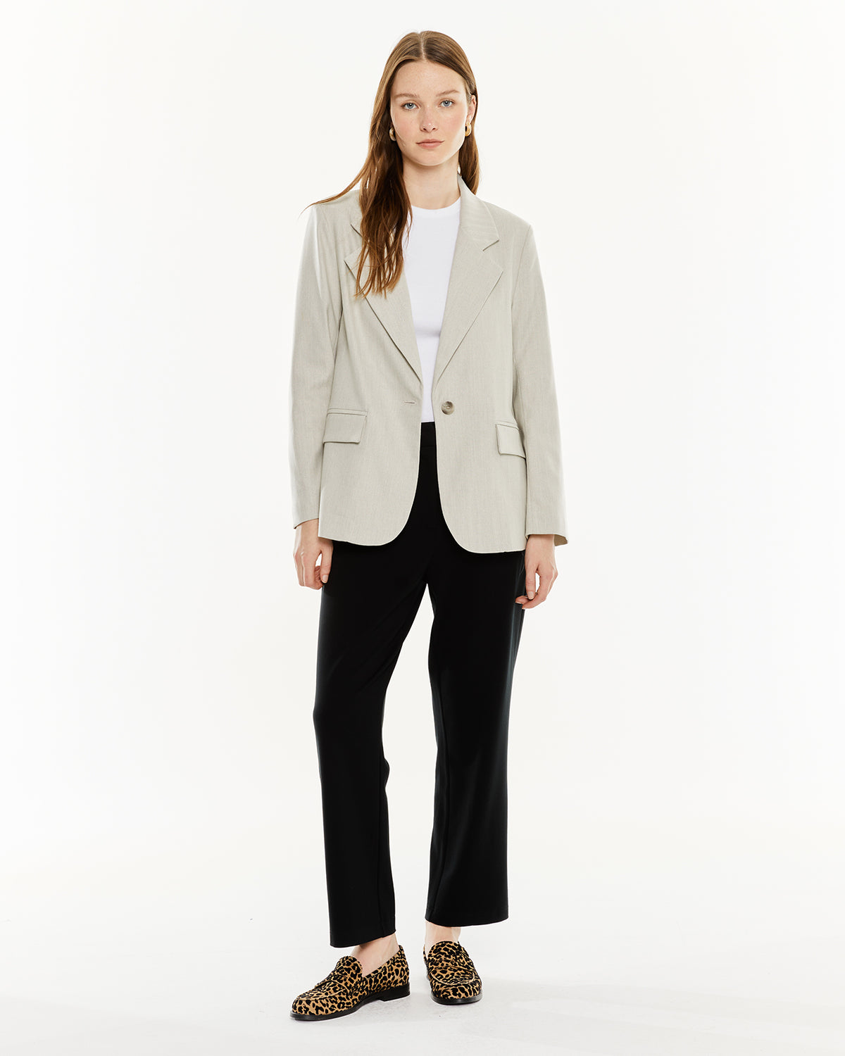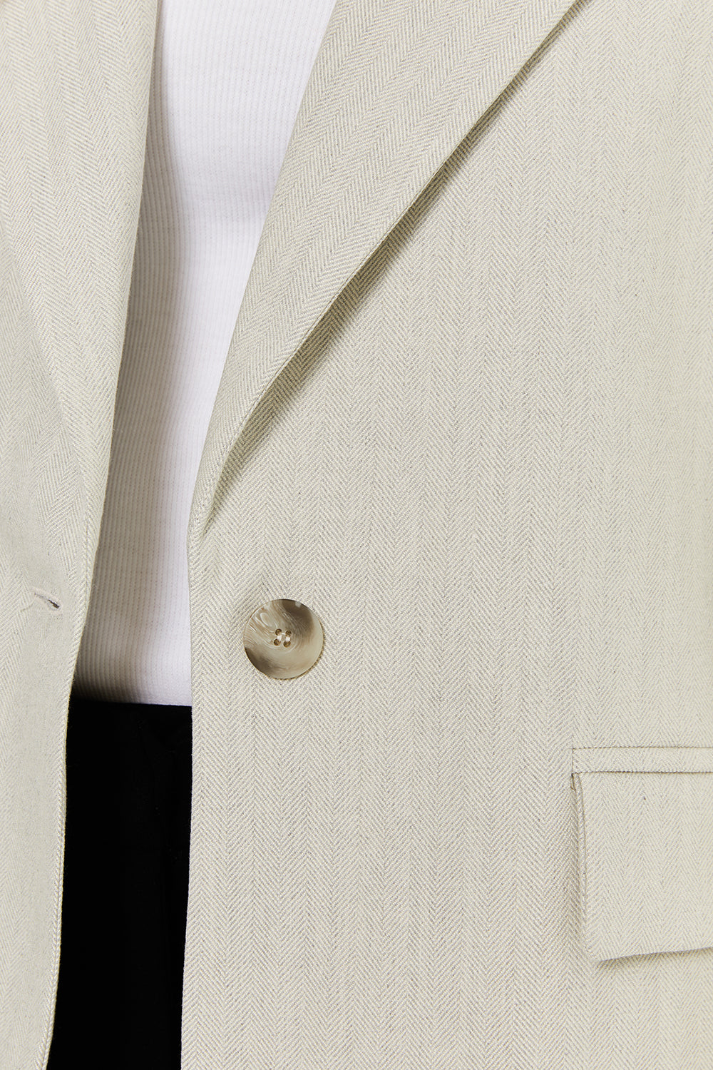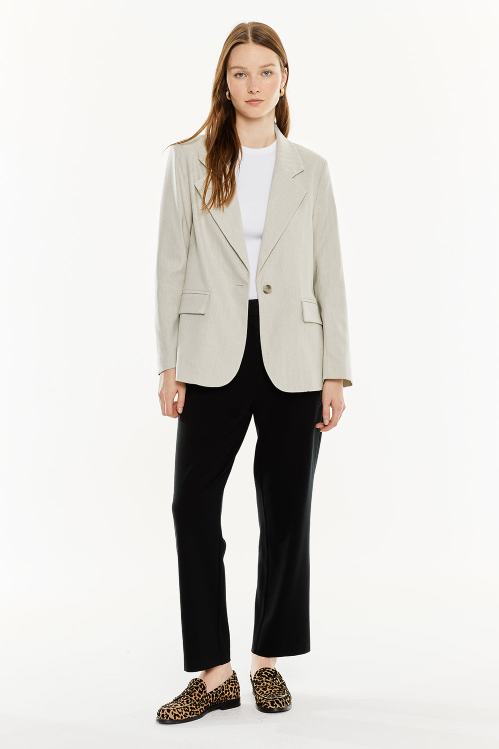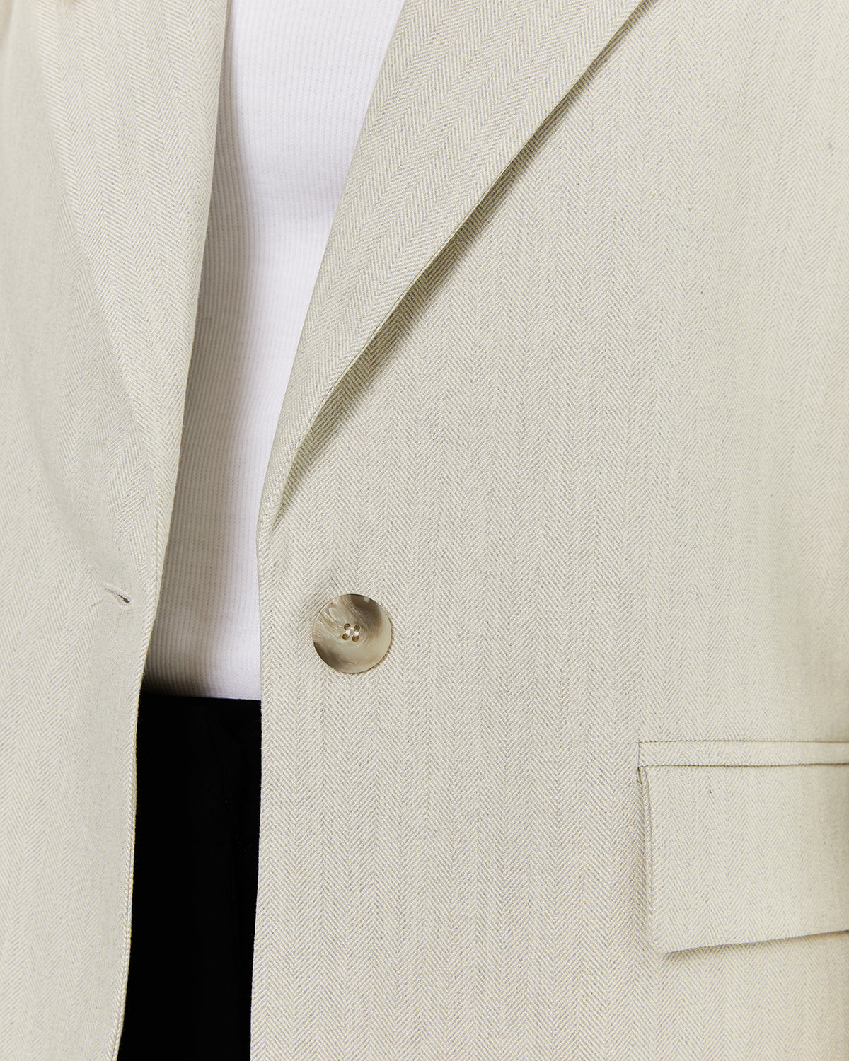 Americana de mujer con tejido de espiga, escote tipo solapa, cierre frontal con botón y bolsillos con tapeta.