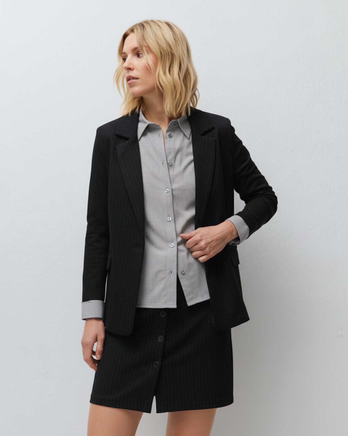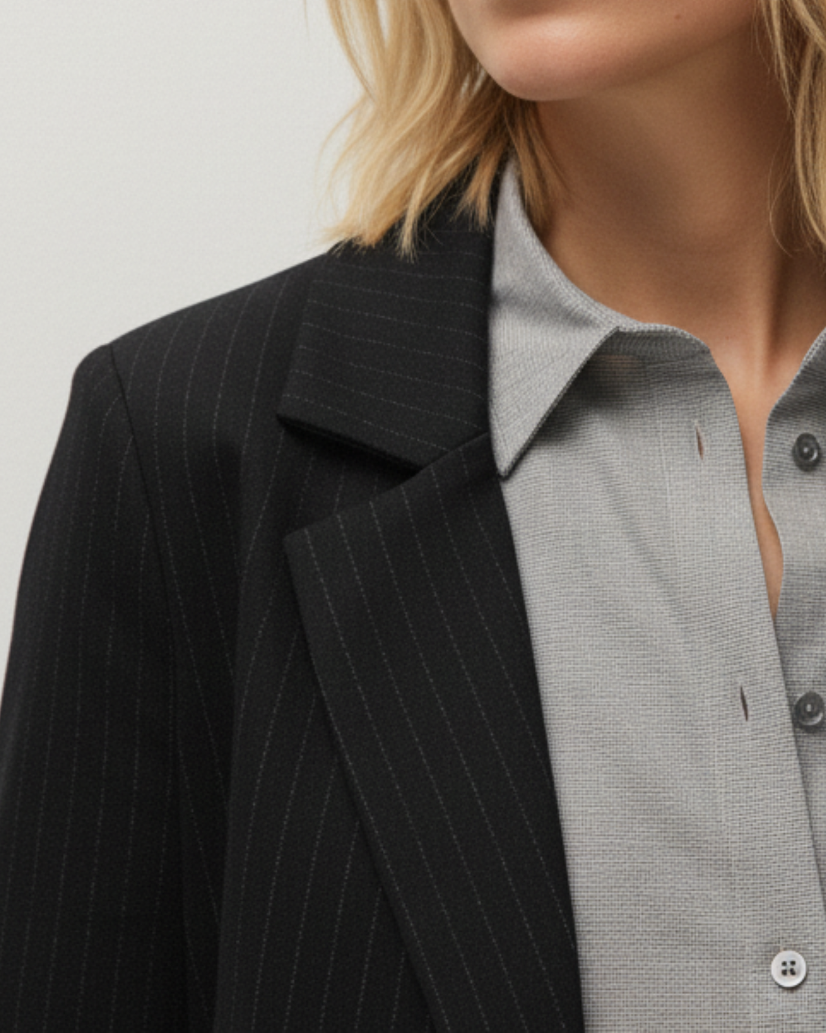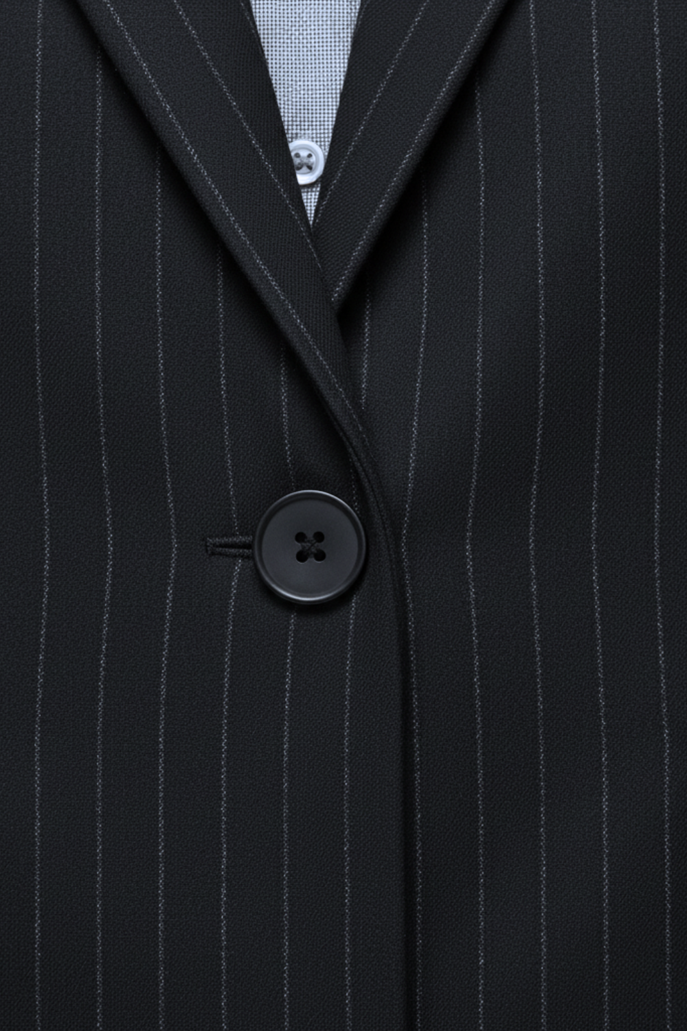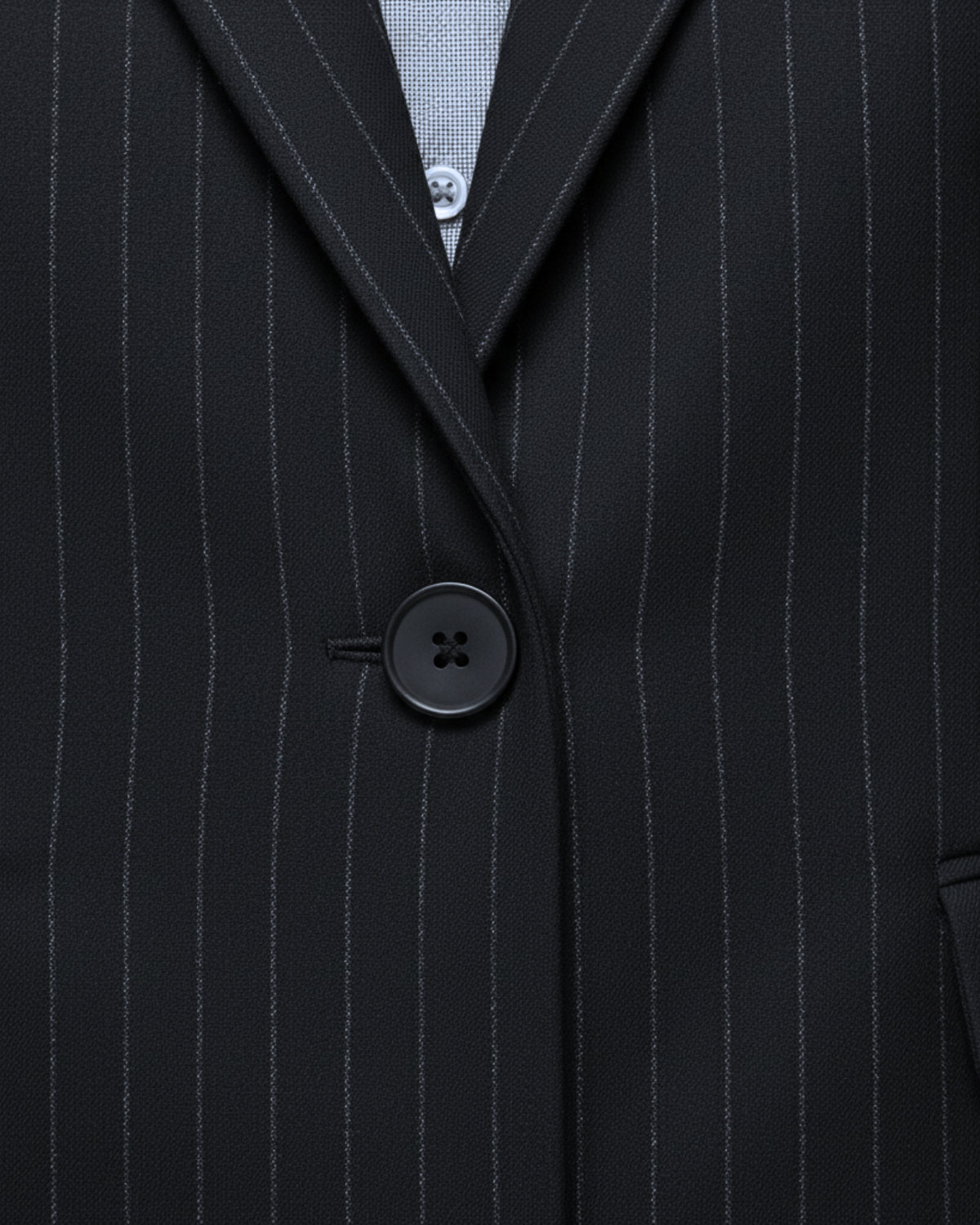 Americana de mujer con raya diplomática, escote con solapa y cierre con botones.