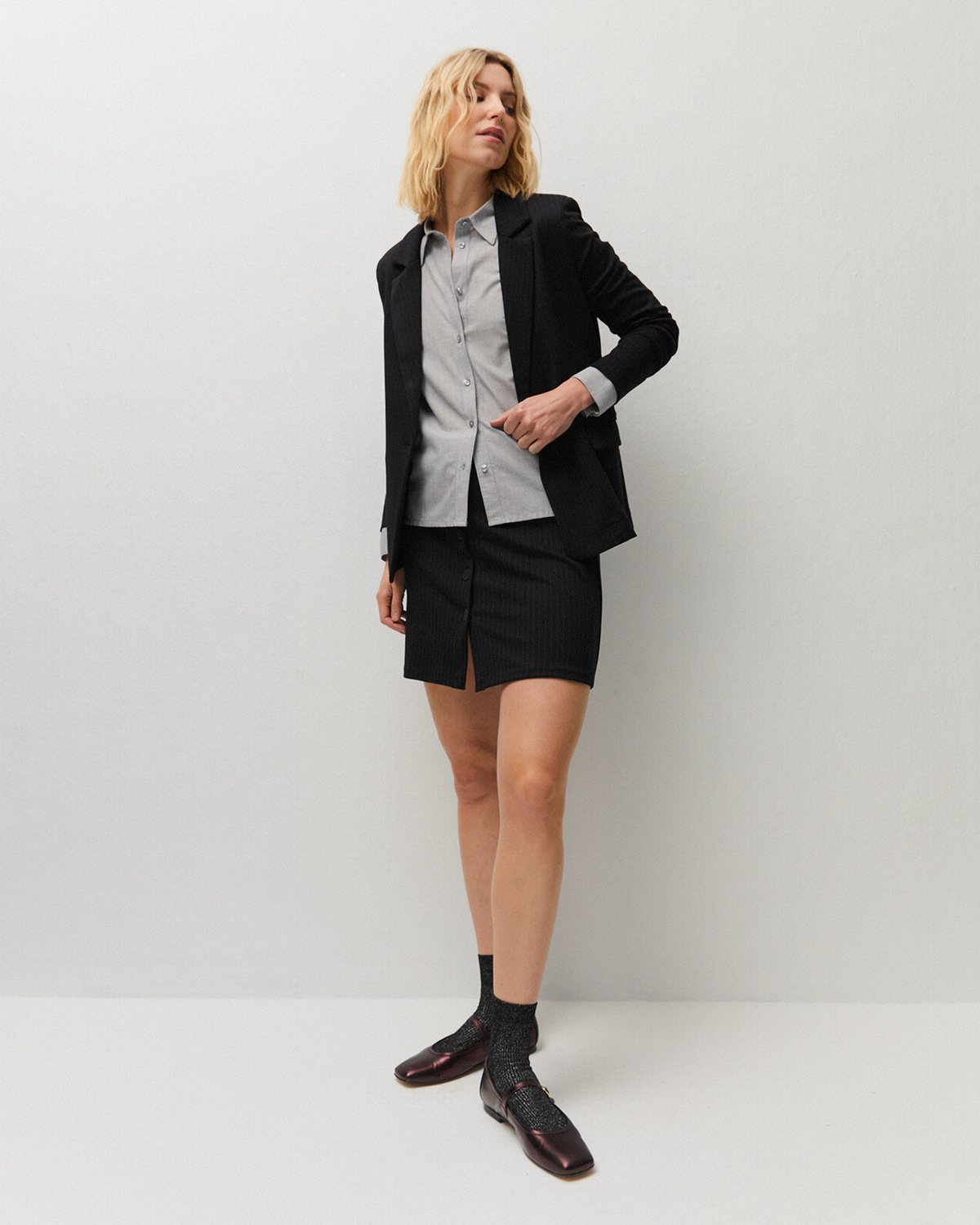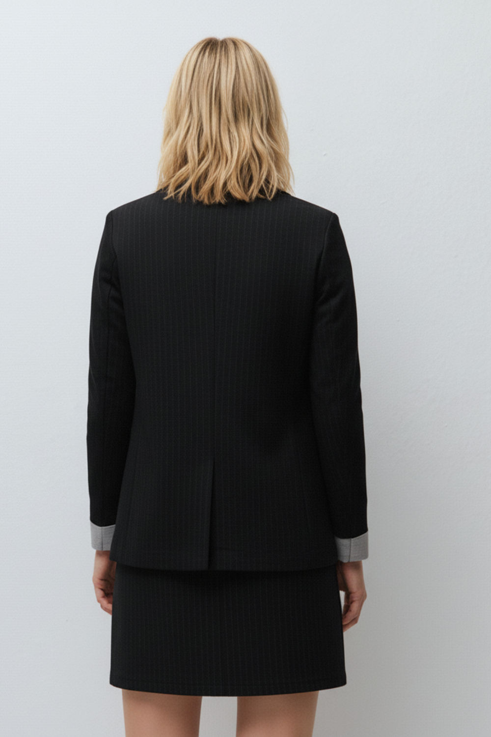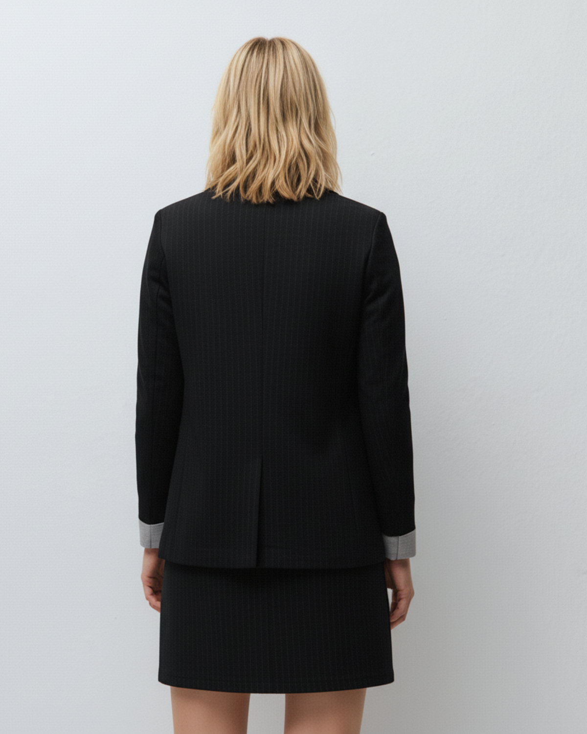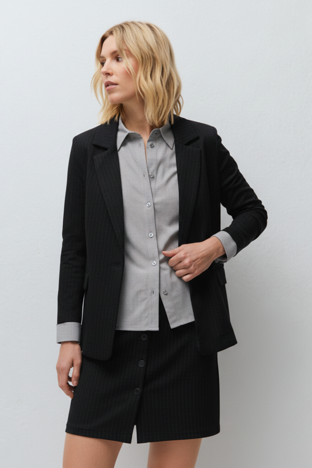 Americana de mujer con raya diplomática, escote con solapa y cierre con botones.