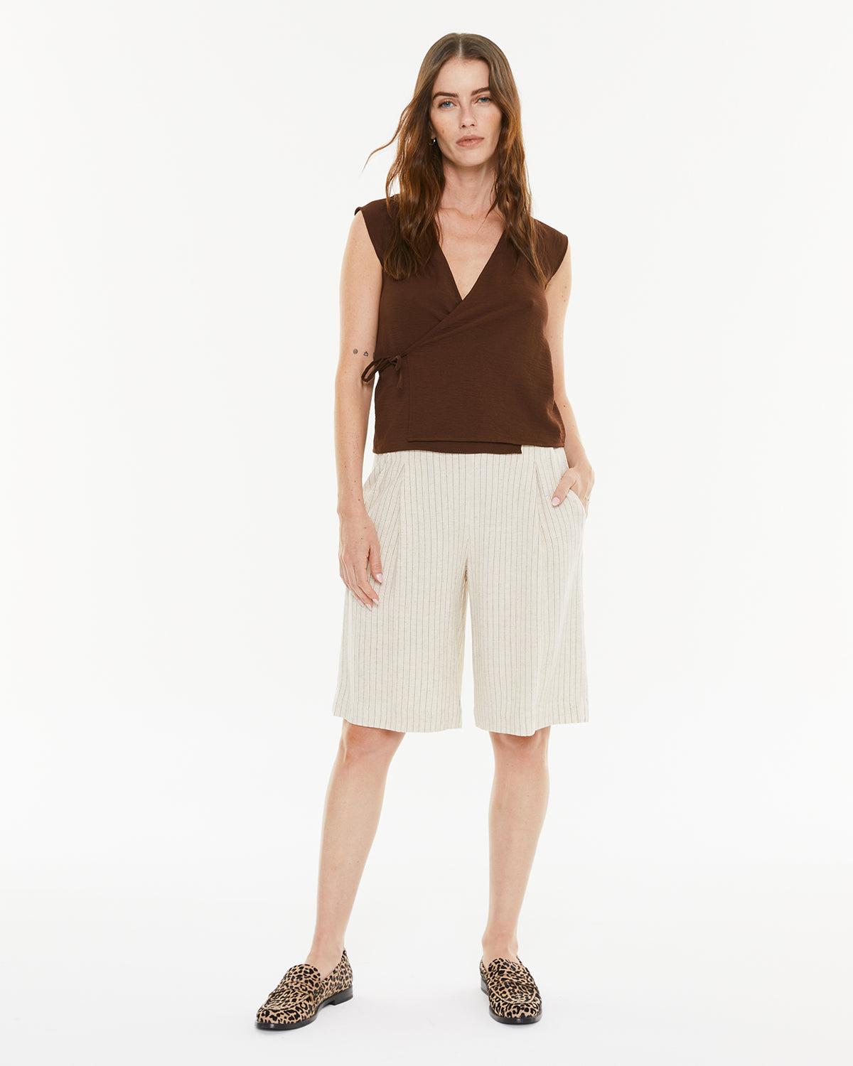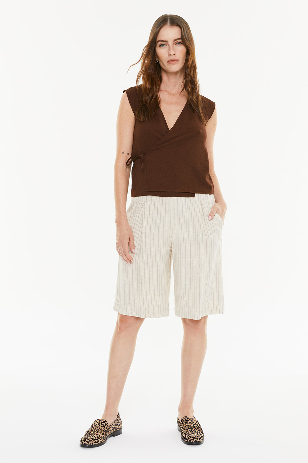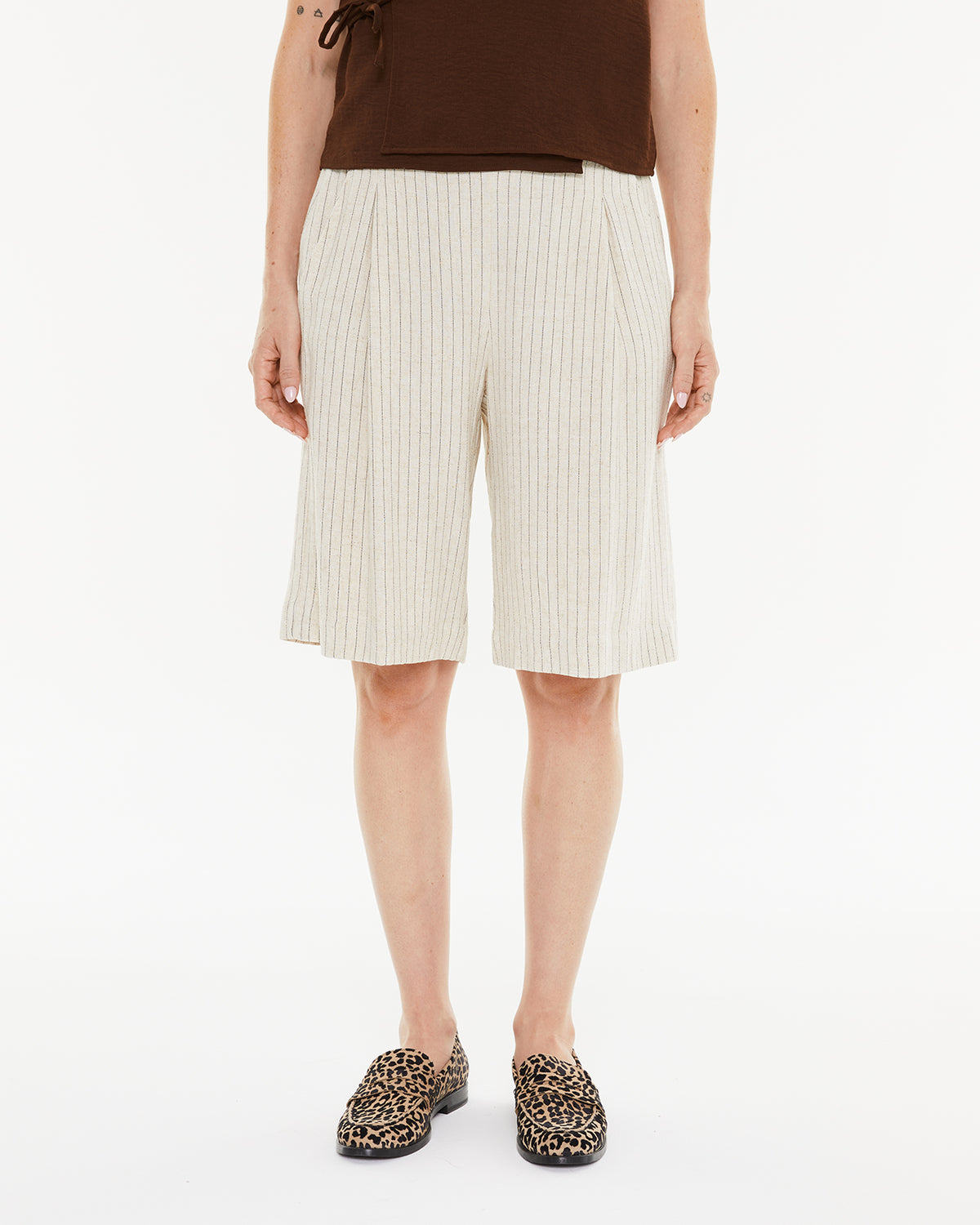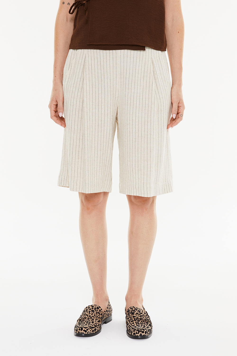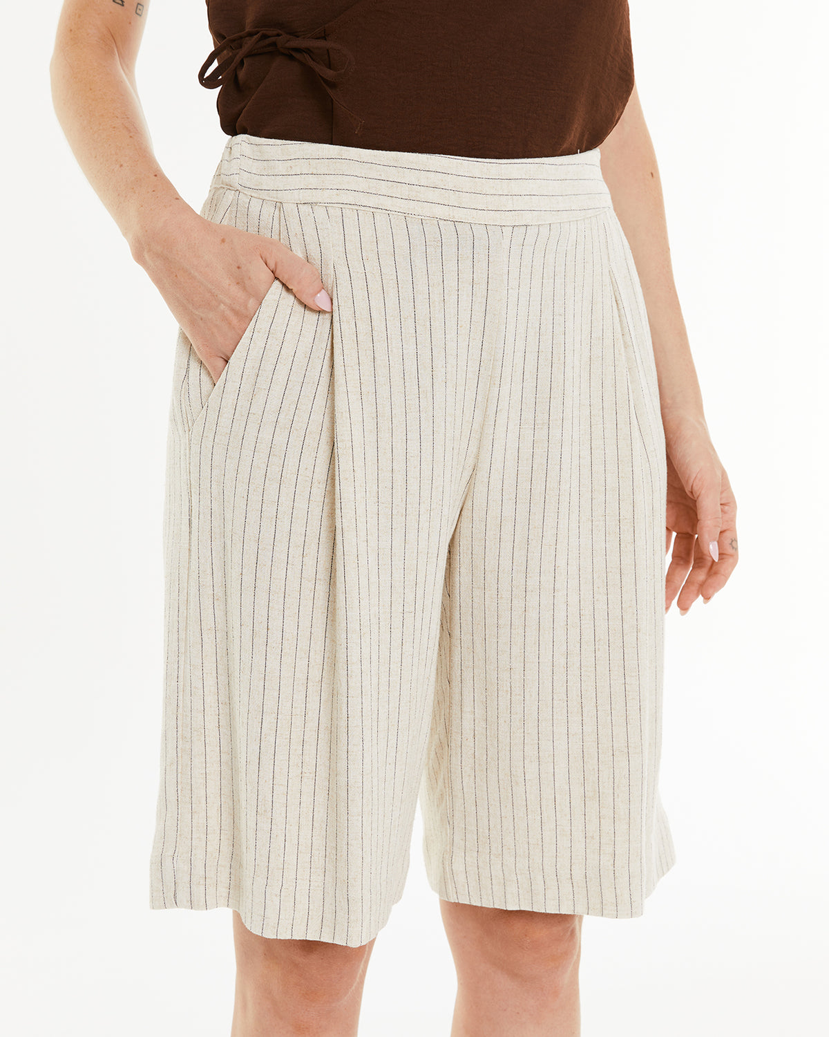 Bermuda de mujer con raya diplomática, goma en la espalda y pinzas delanteras. Prenda sostenible