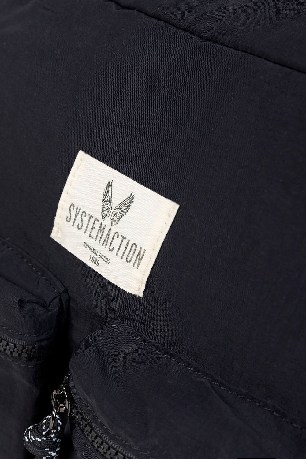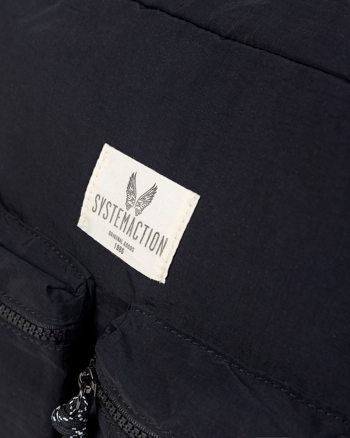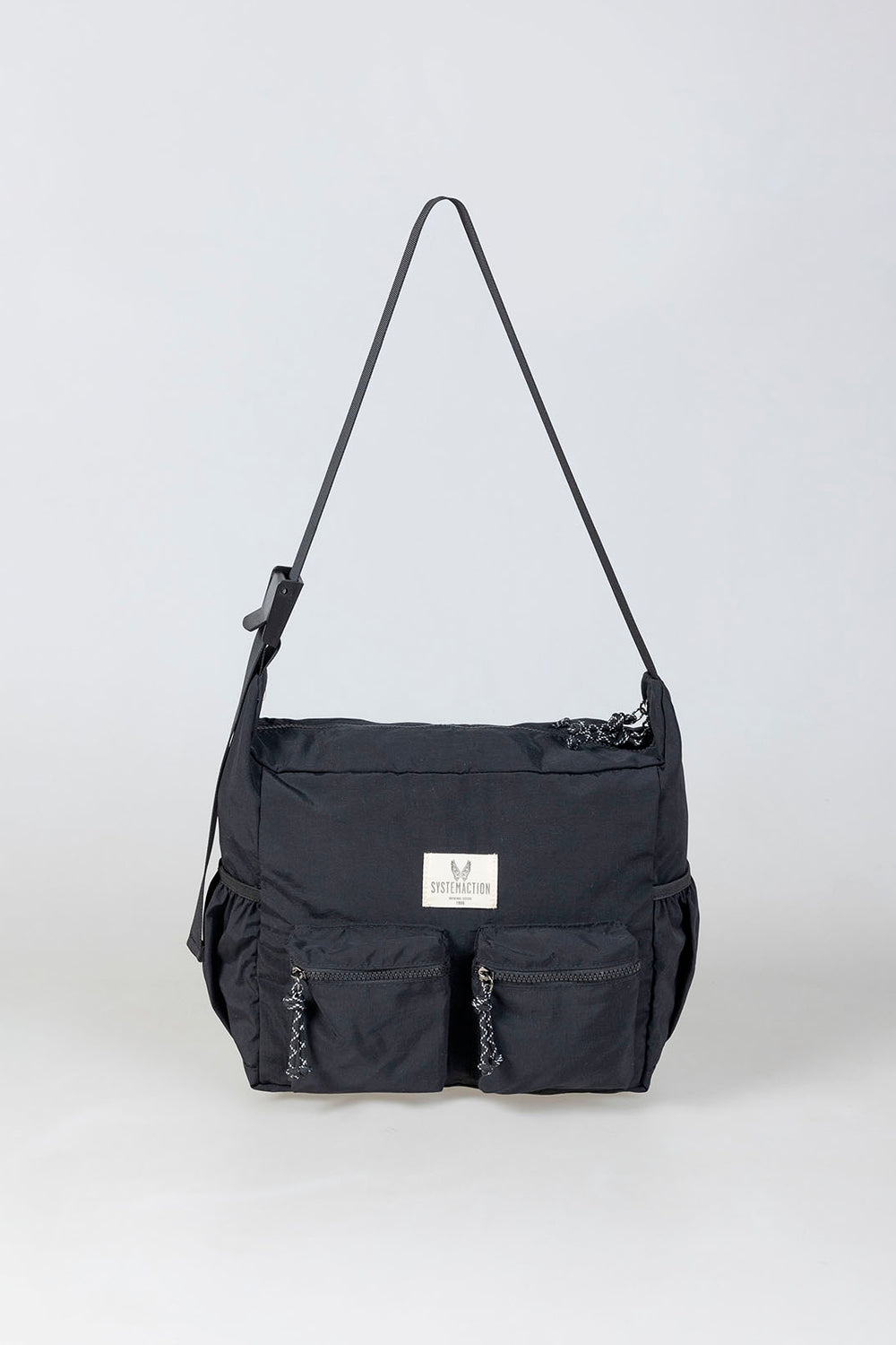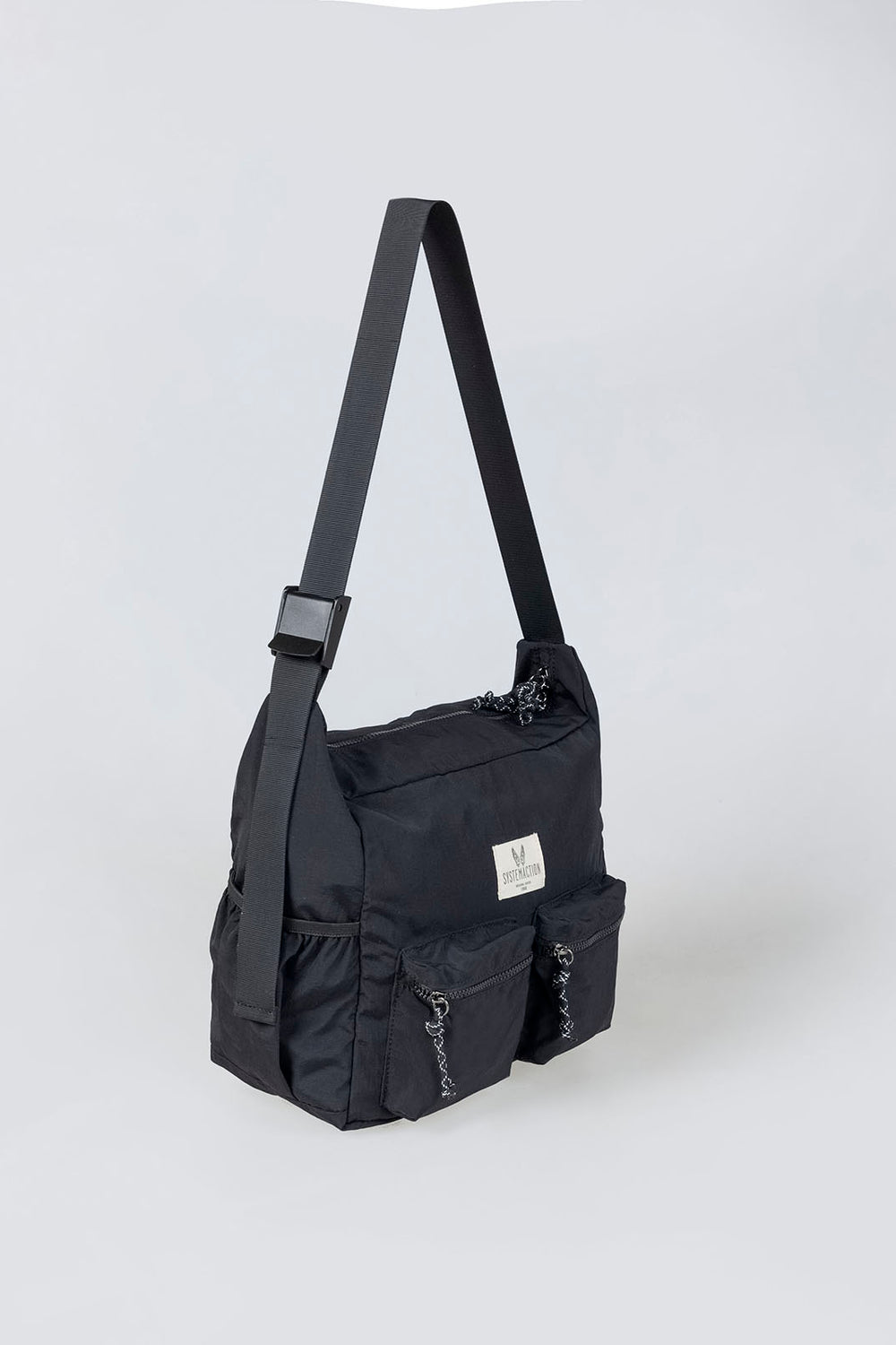 Bolso de mujer tipo bandolera de nylon de color negro con cierre con cremallera, asa regulable, dos bolsillos pequeños exteriores con cierre de cremallera, dos bolsillos laterales con goma y bolsillos interiores.