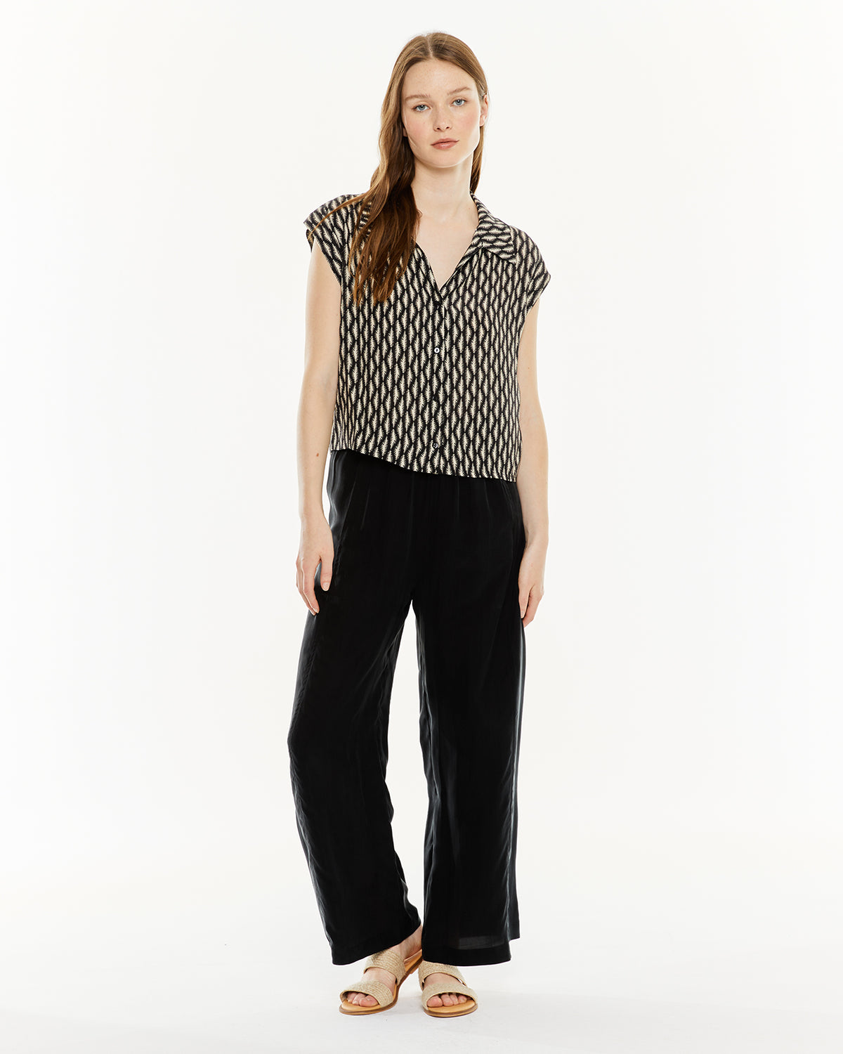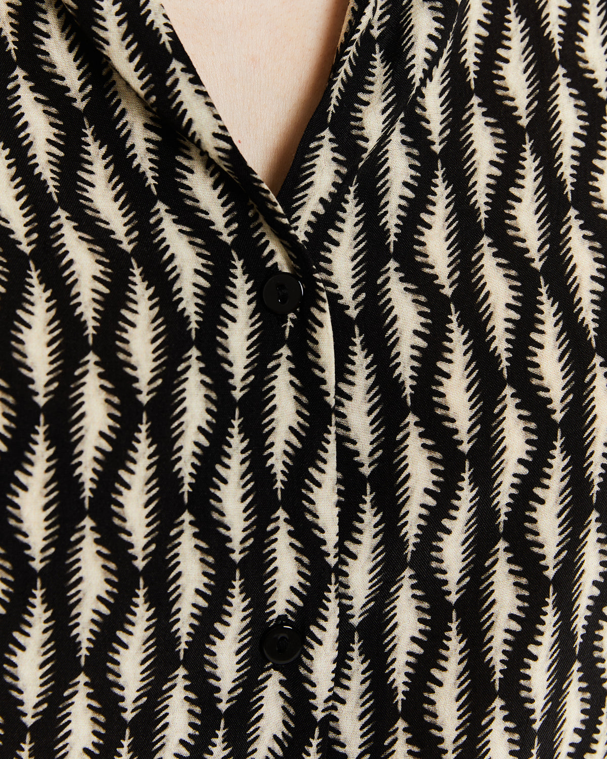 Camisa de mujer con estampado bicolor, escote camisero, cierre de botones en la parte delantera y manga corta. Prenda sostenible.