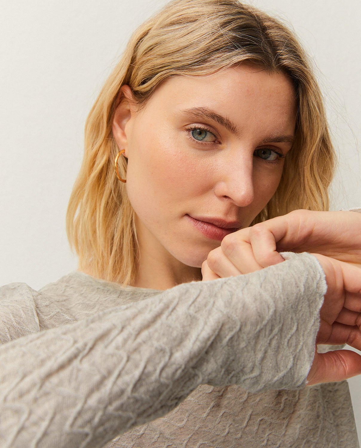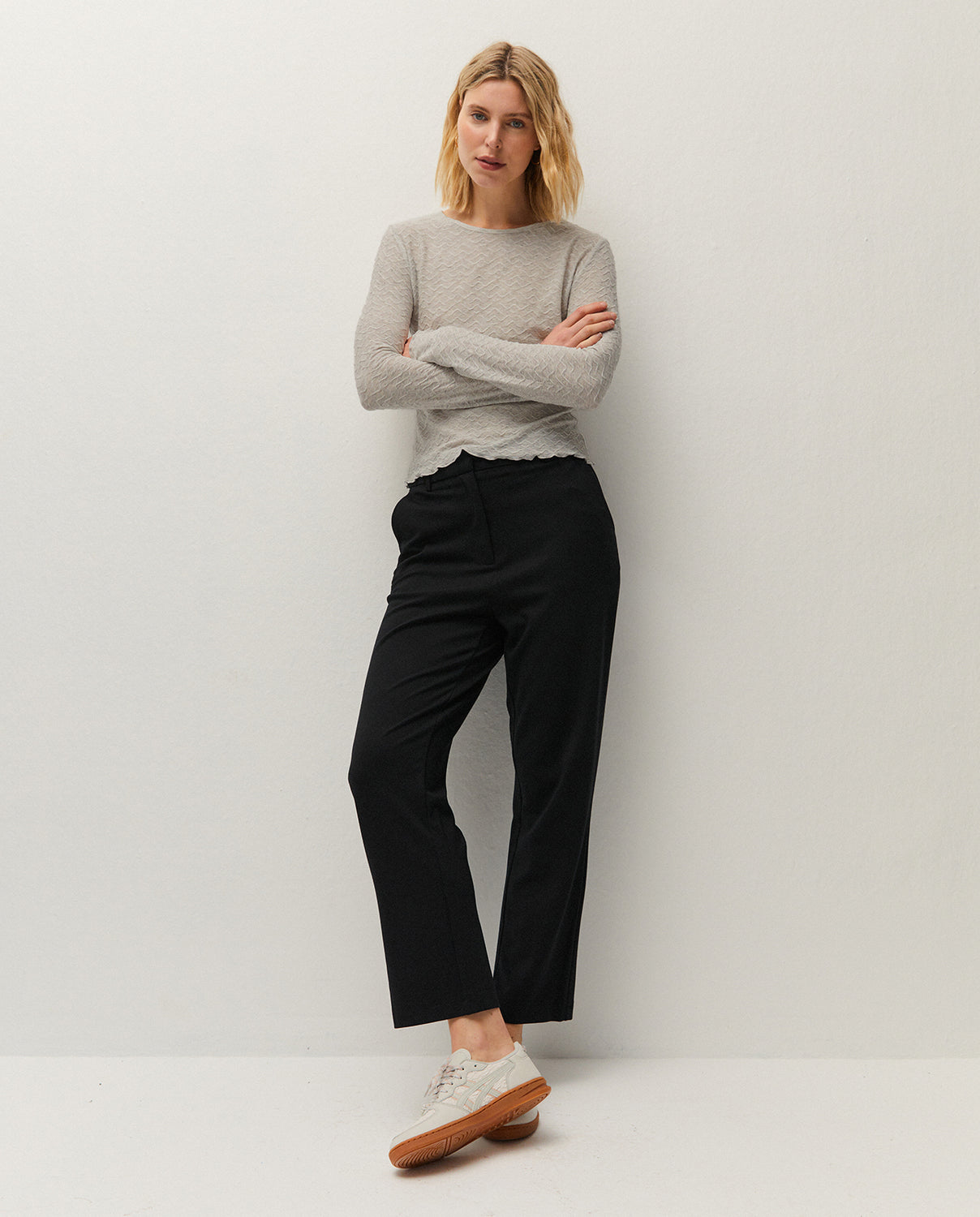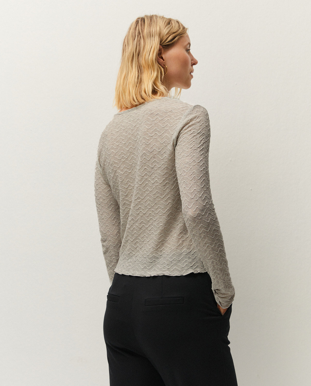 Camiseta de cuello redondo y manga larga, confeccionada en tejido jacquard. Prenda sostenible.