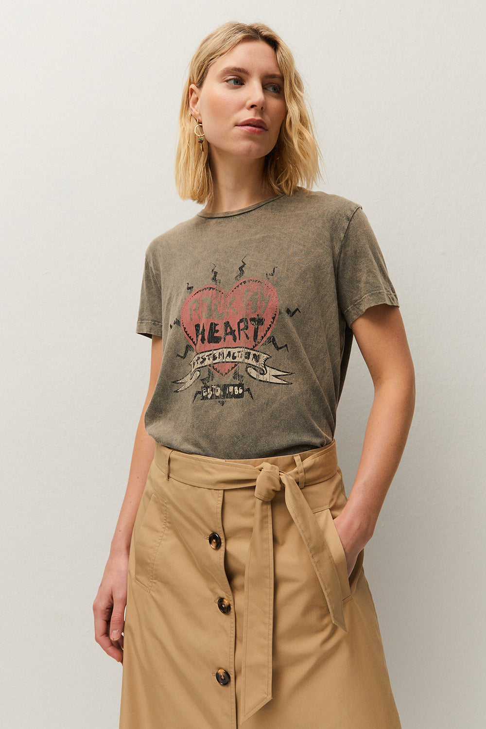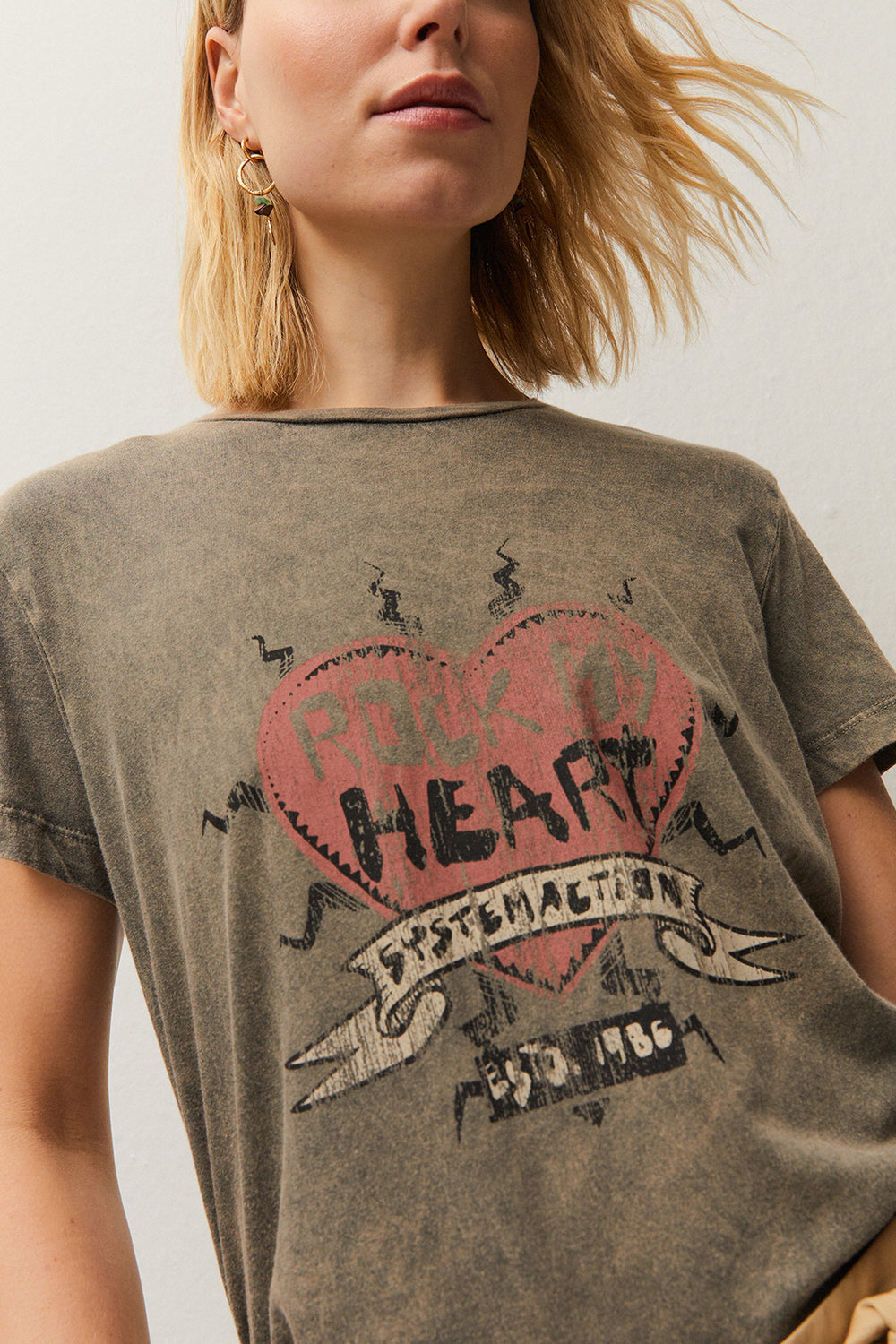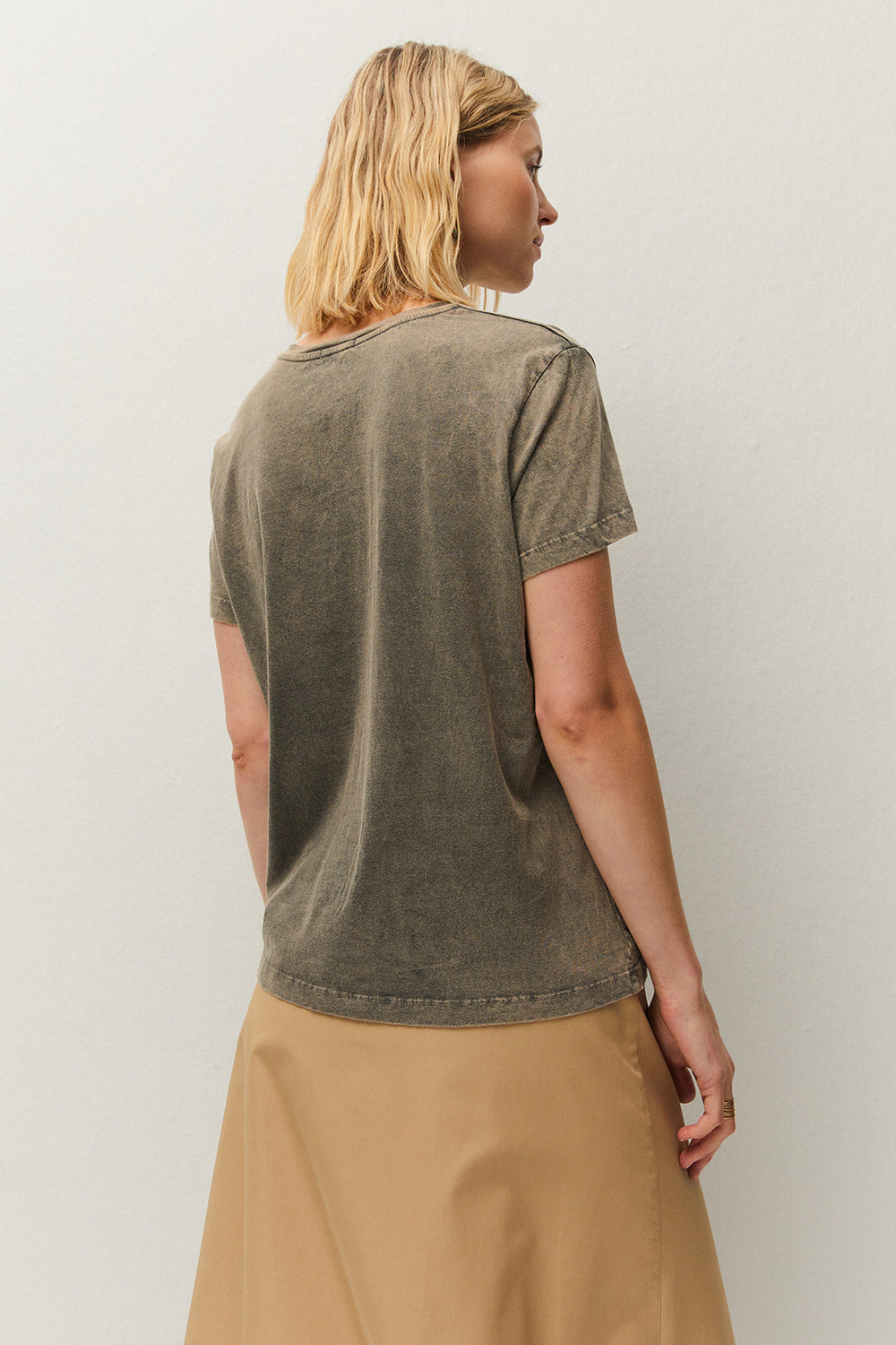 Camiseta de manga corta y cuello redondo, con print posicional en el delantero y tinte corrosivo. Prenda sostenible.