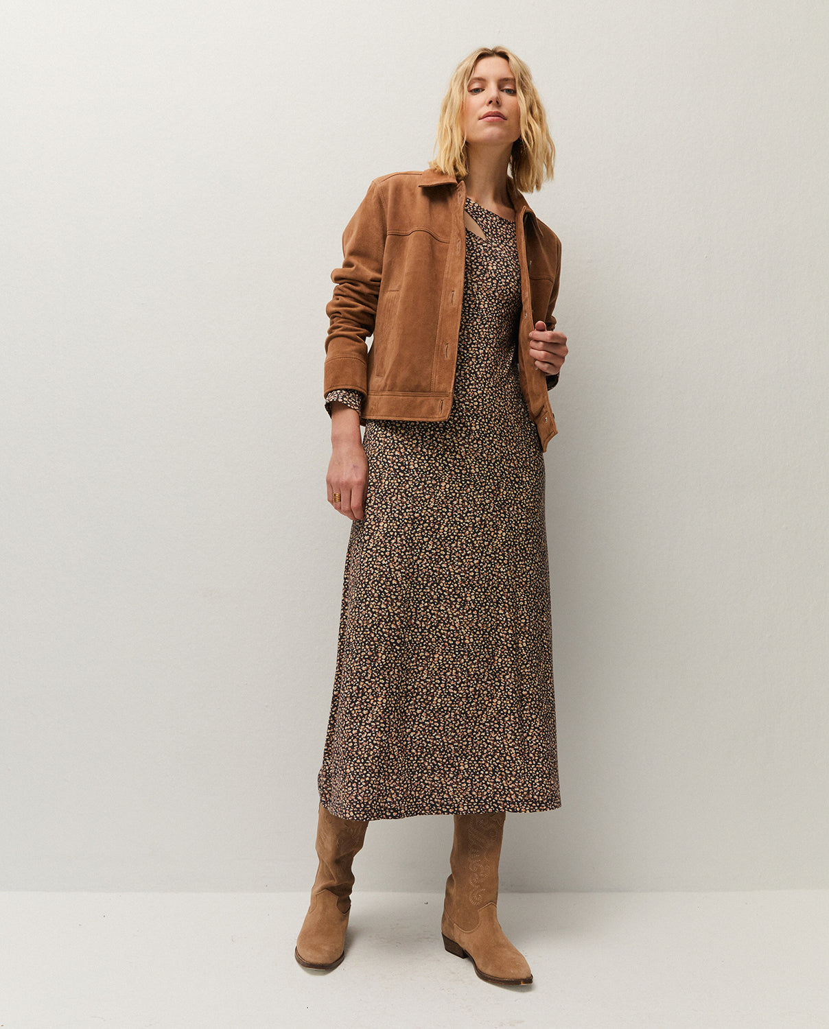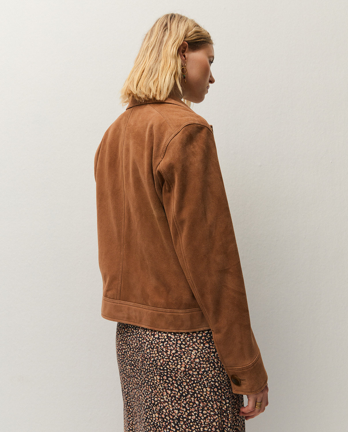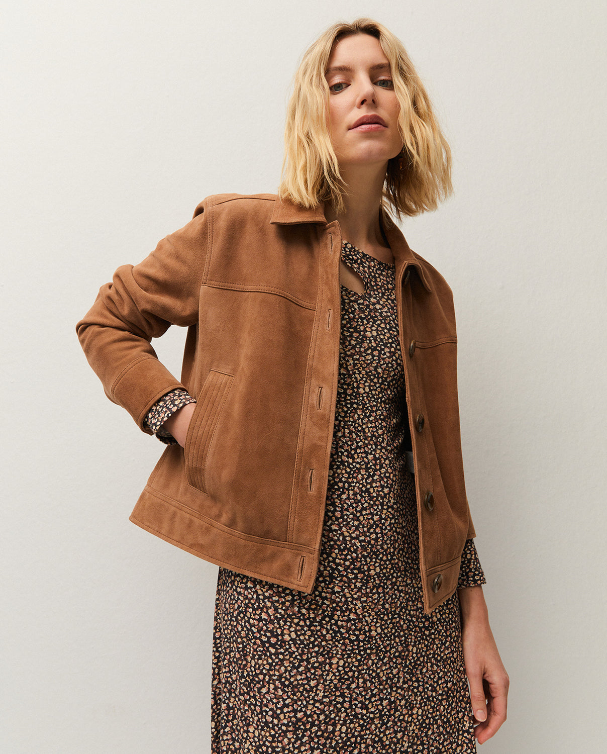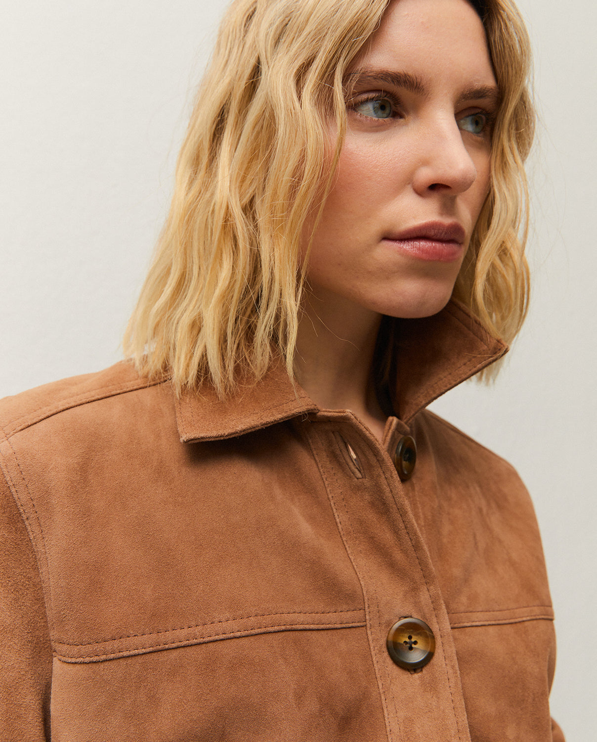 Cazadora de piel con cuello camisero y manga larga. Bolsillos delanteros de vivo. Cierre frontal con botones. Prenda sostenible.
