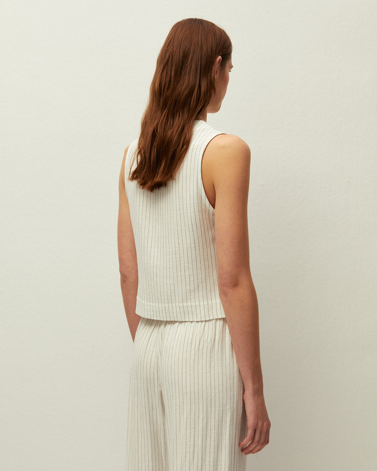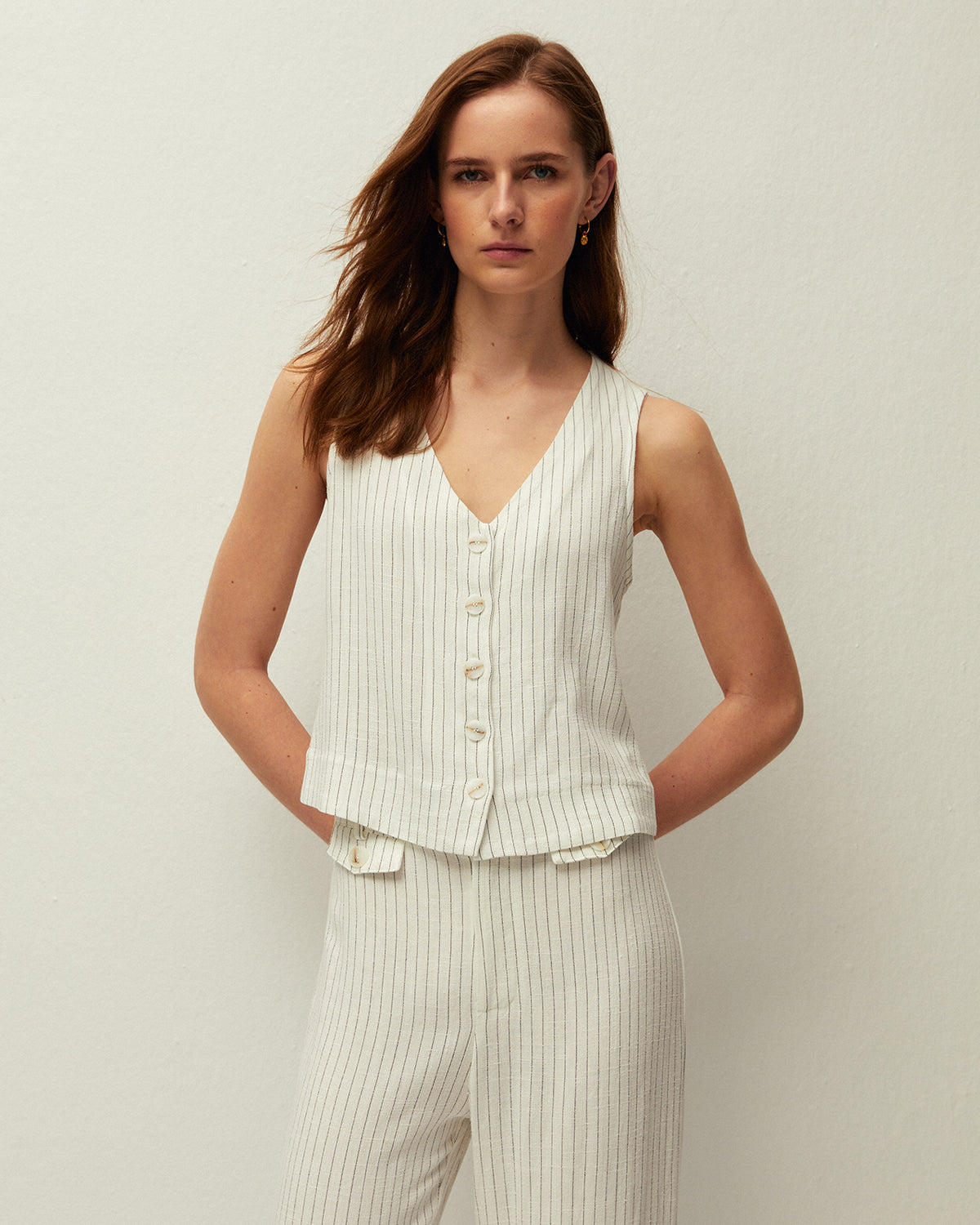 Chaleco de raya diplomática bicolor con escote pico. Detalle de bolsillos de vivo en el delantero. Cierre con botones. Prenda sostenible.
