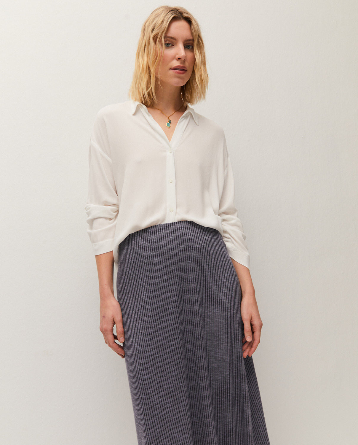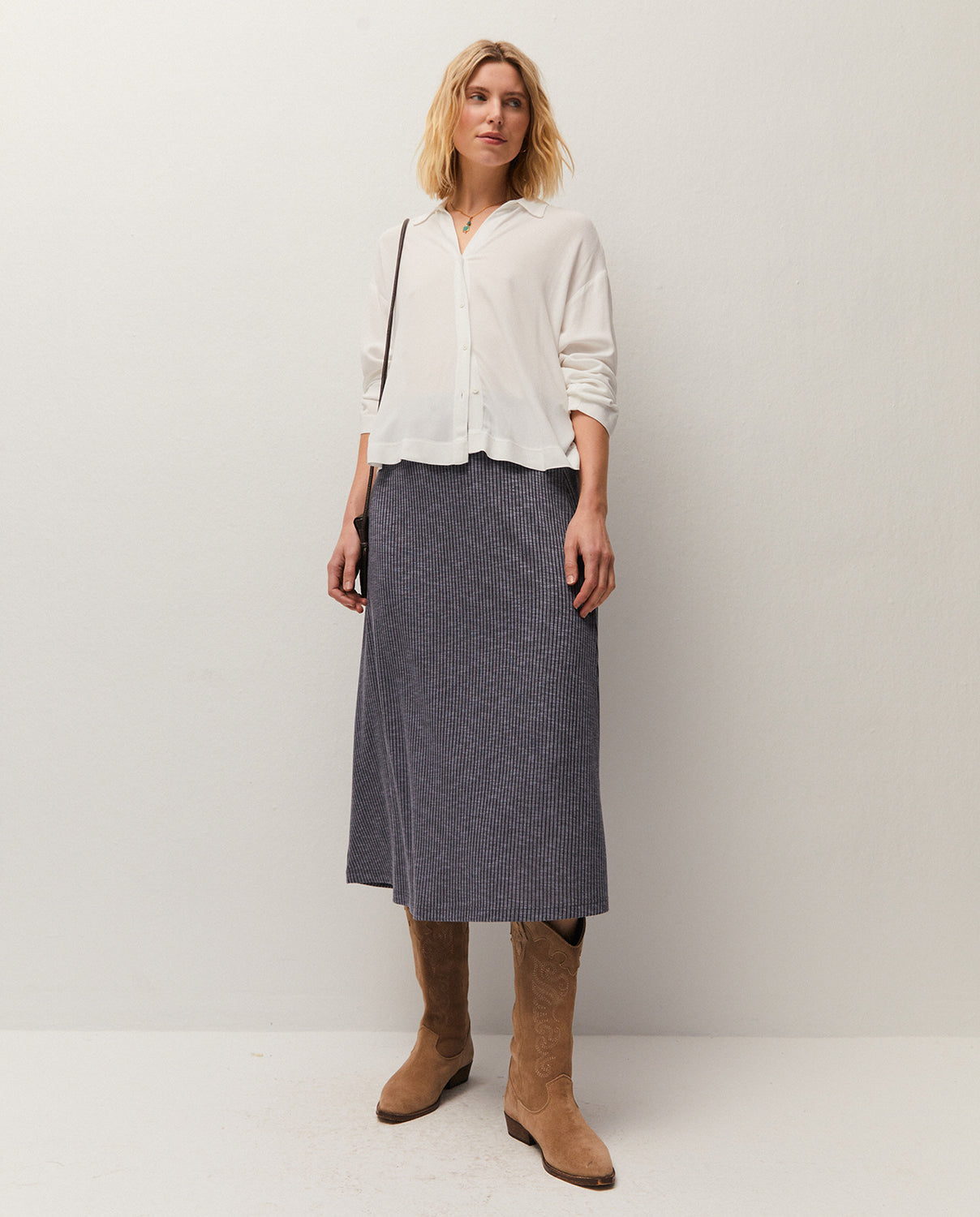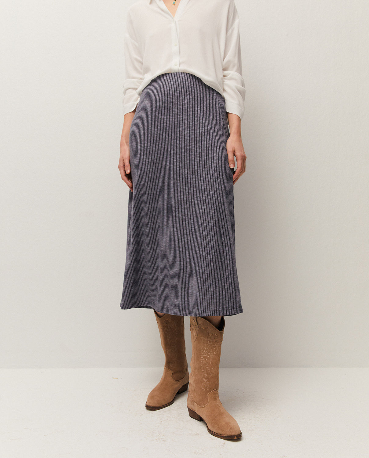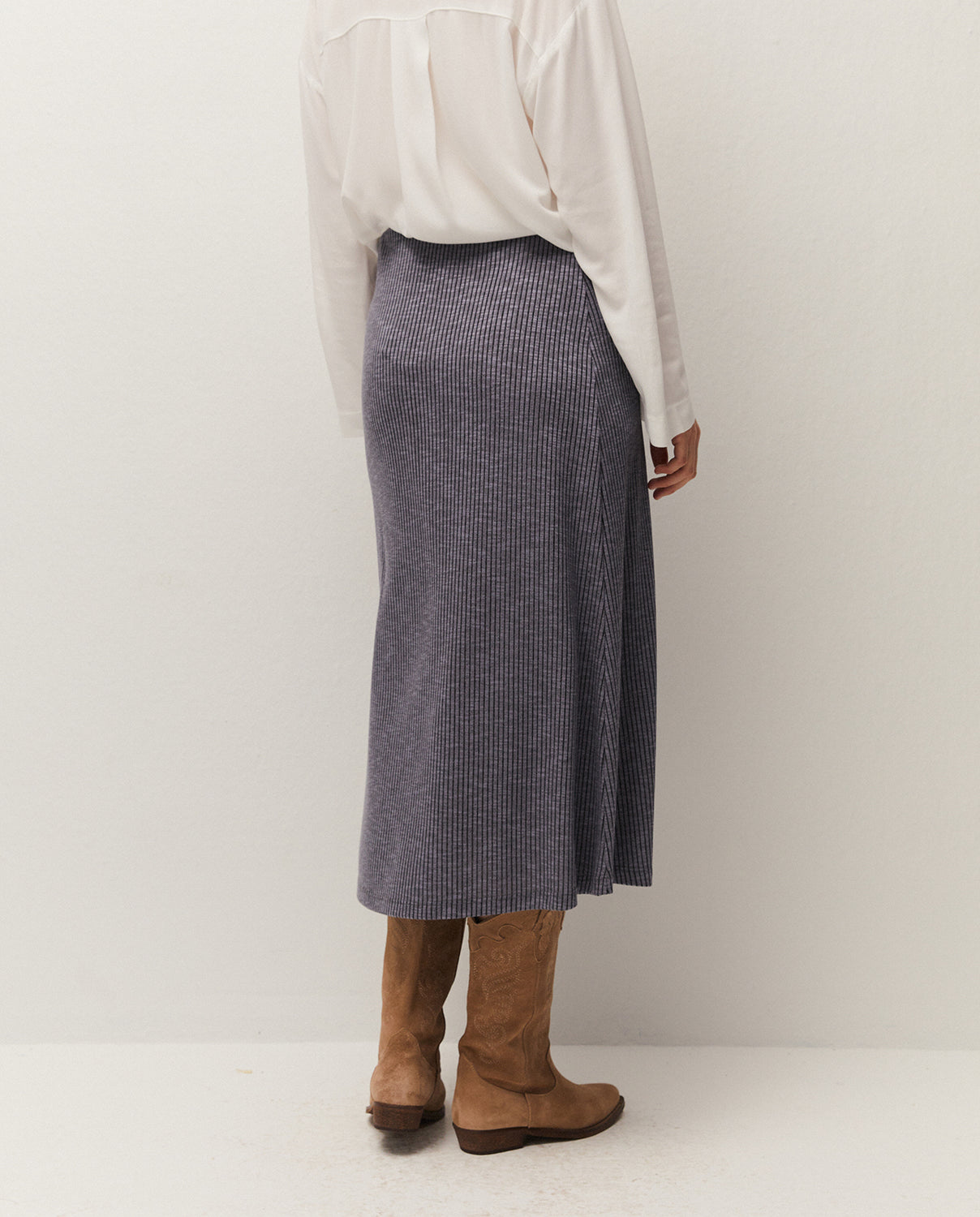 Falda midi con goma en la cintura, confeccionada en tejido de canalé. Prenda sostenible.