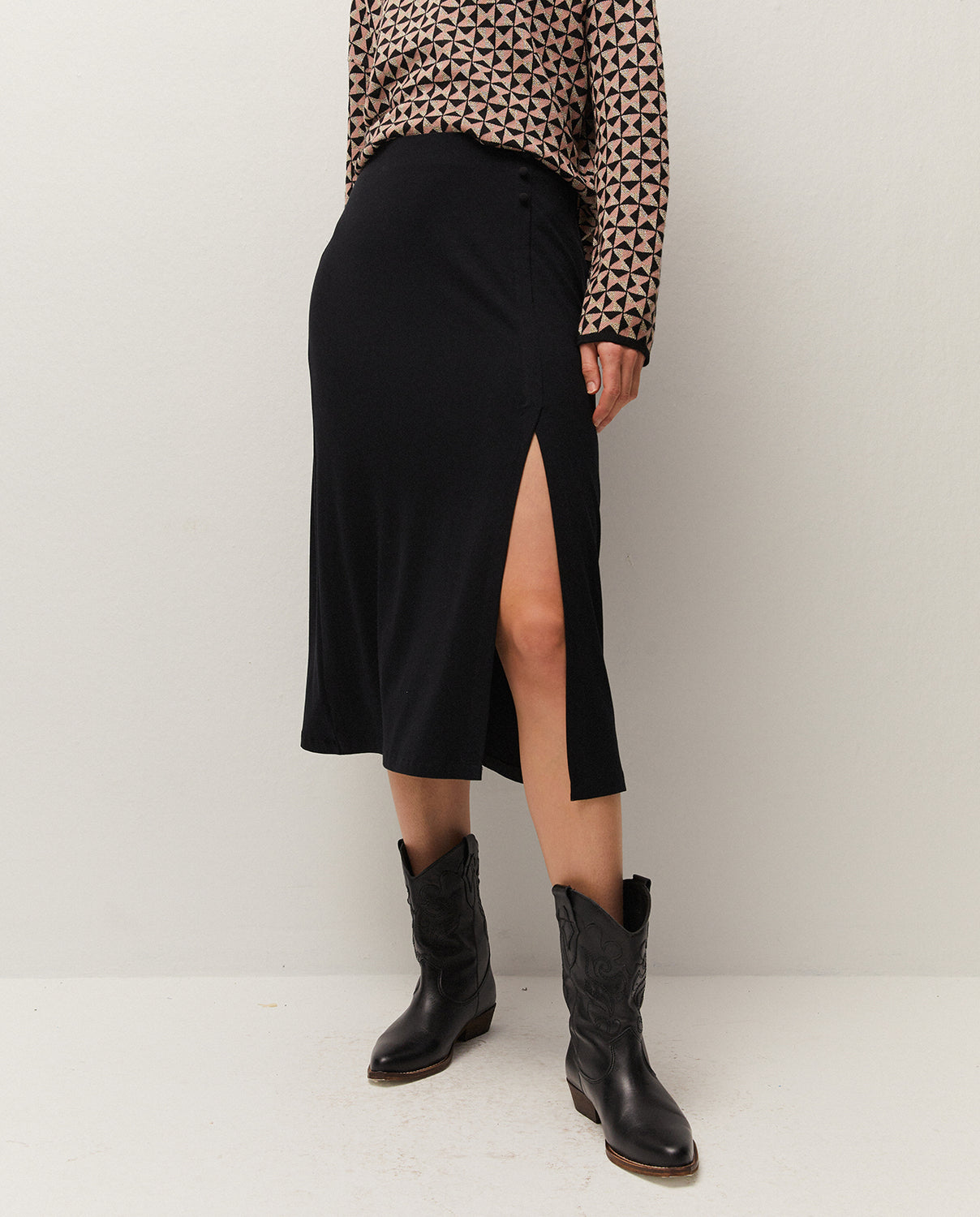 Falda midi con detalle de botones en el delantero. Goma en la cintura. Prenda sostenible.