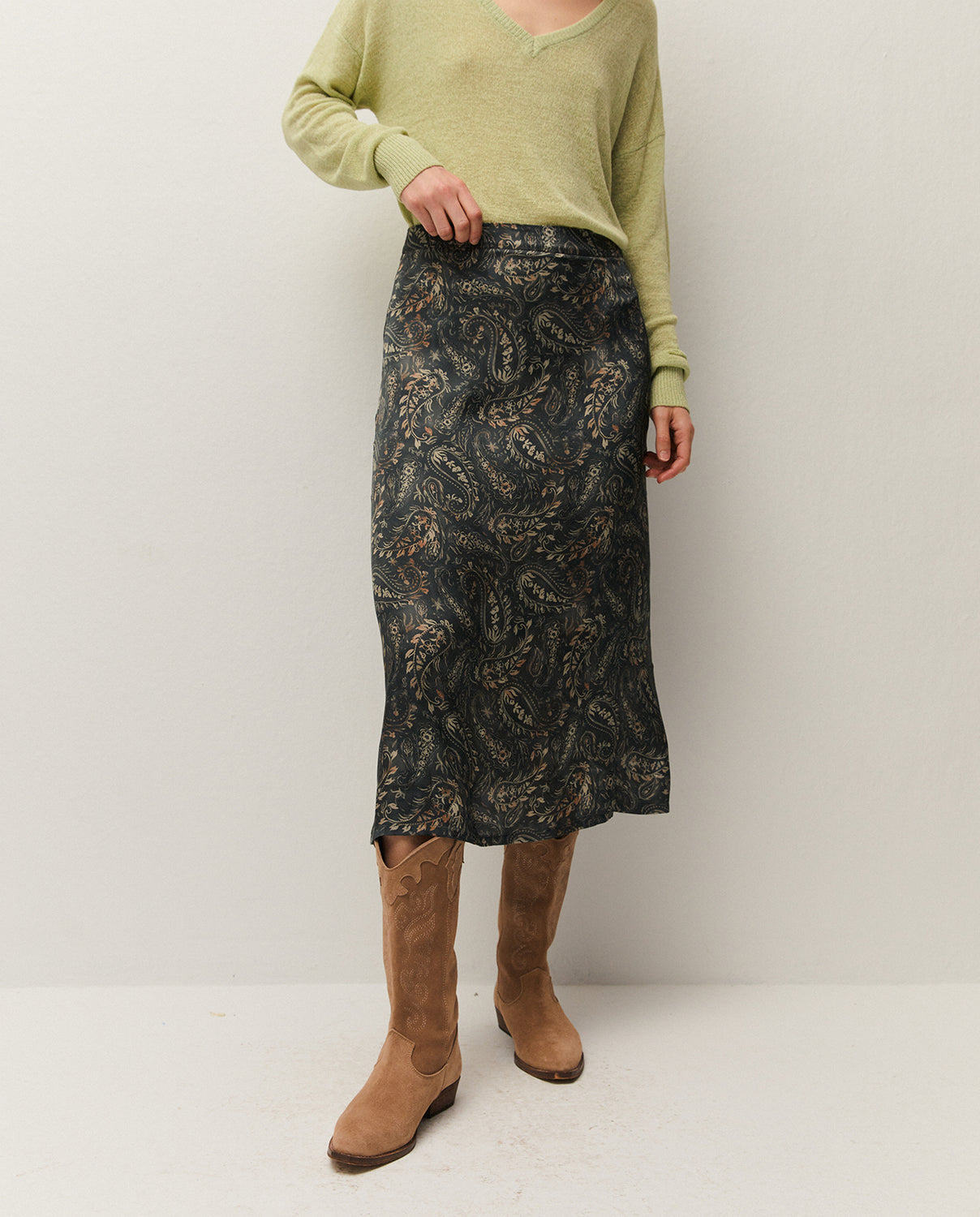 Falda midi evasé de mujer con estampado pashley y con cremallera lateral. Prenda sostenible.