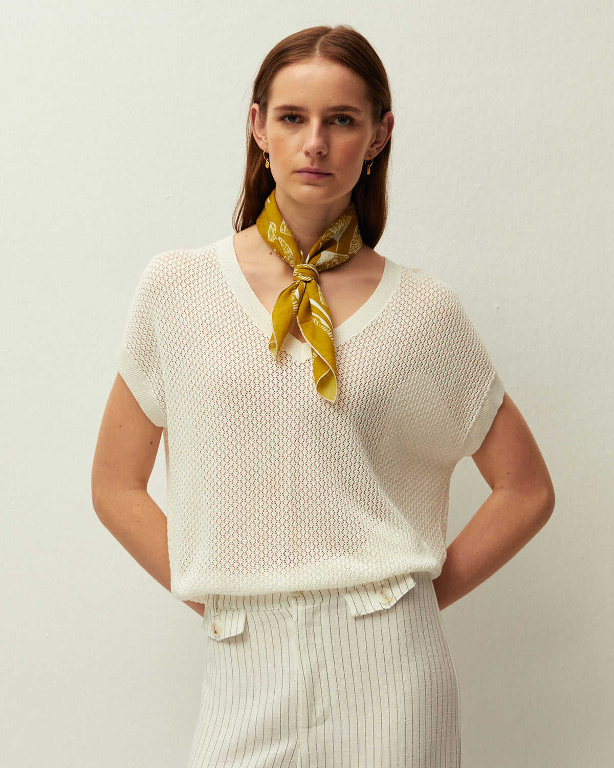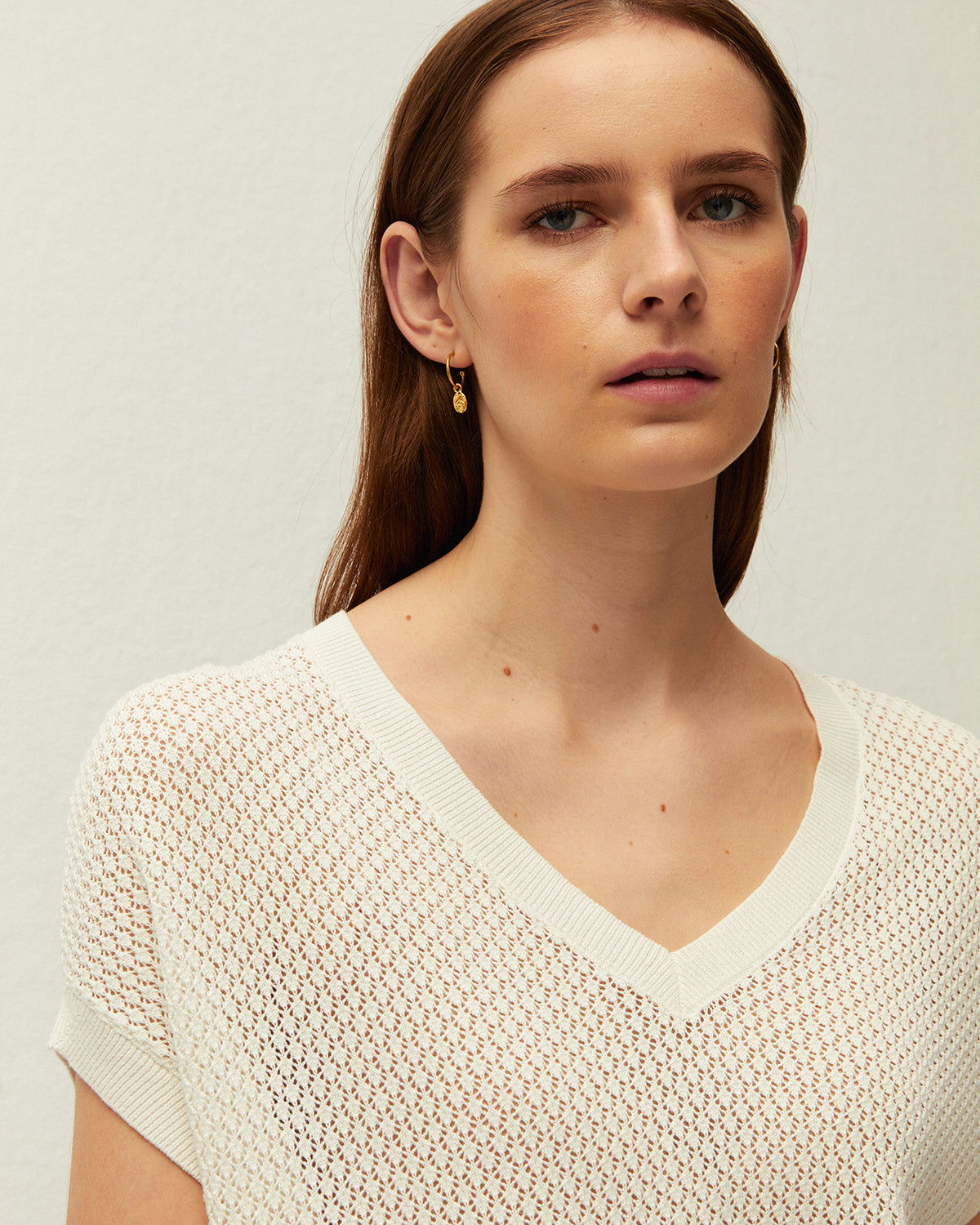 Jersey con escote pico y manga corta, confeccionado en tejido de punto calado. Acabados en rib.