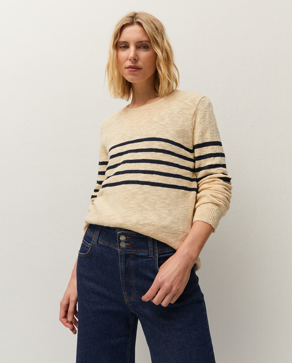 Jersey de rayas con cuello redondo y manga larga. Prenda sostenible.