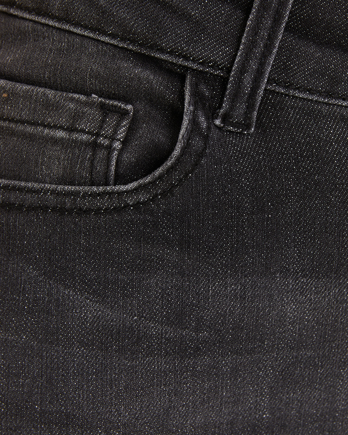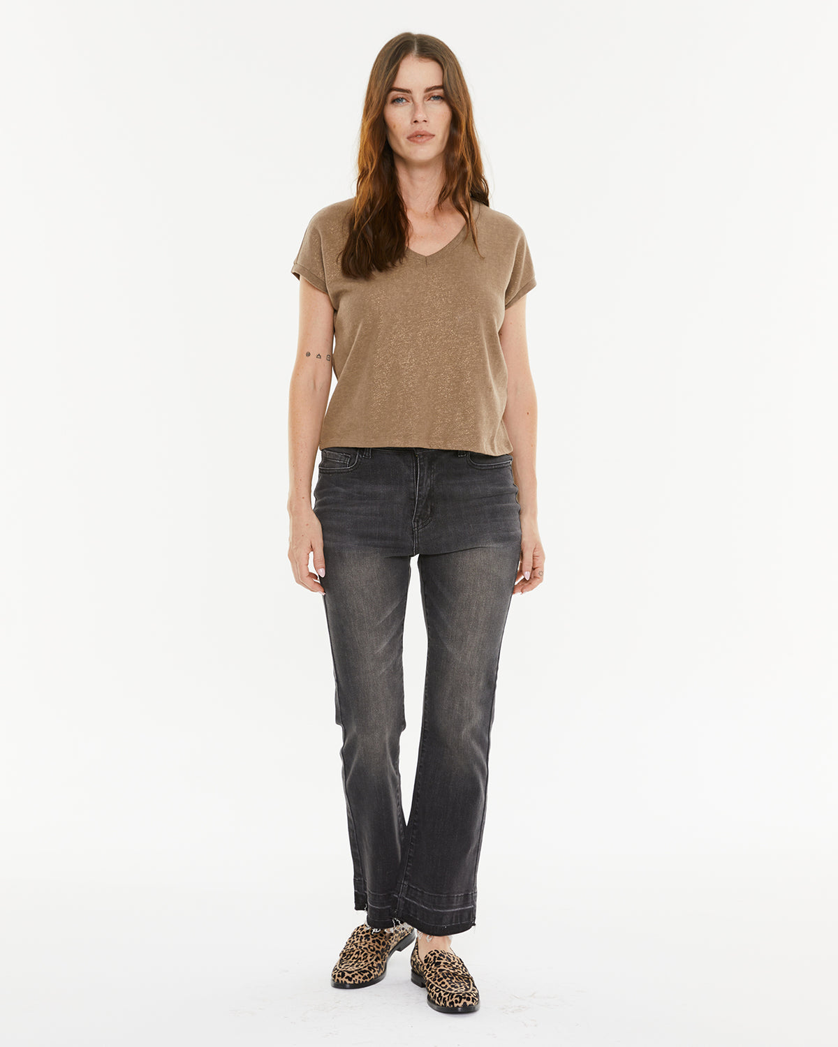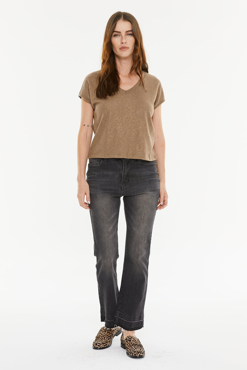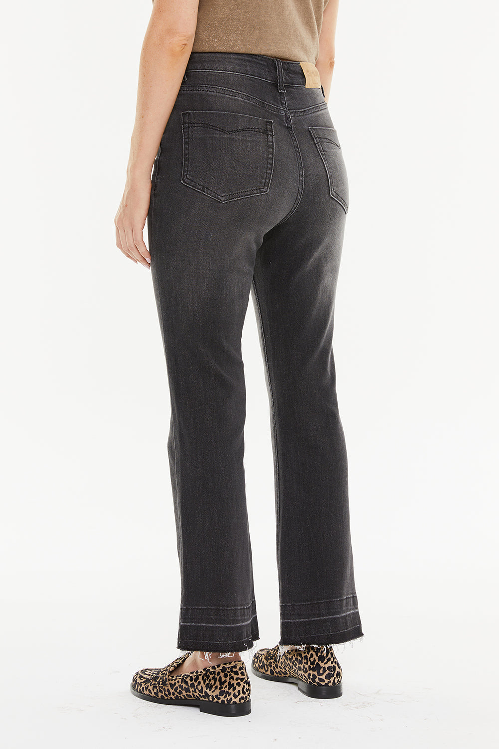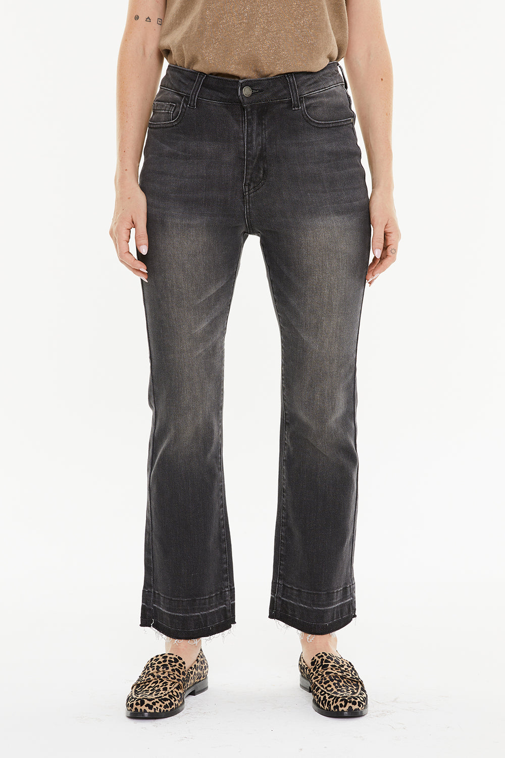 Pantalón denim de mujer tipo flare, con cierre de botón.