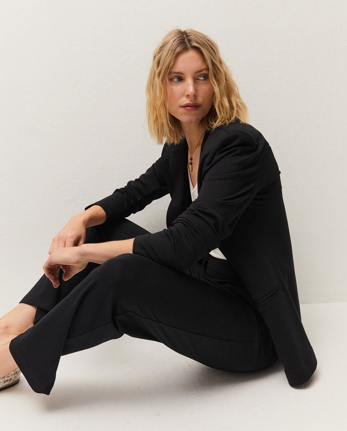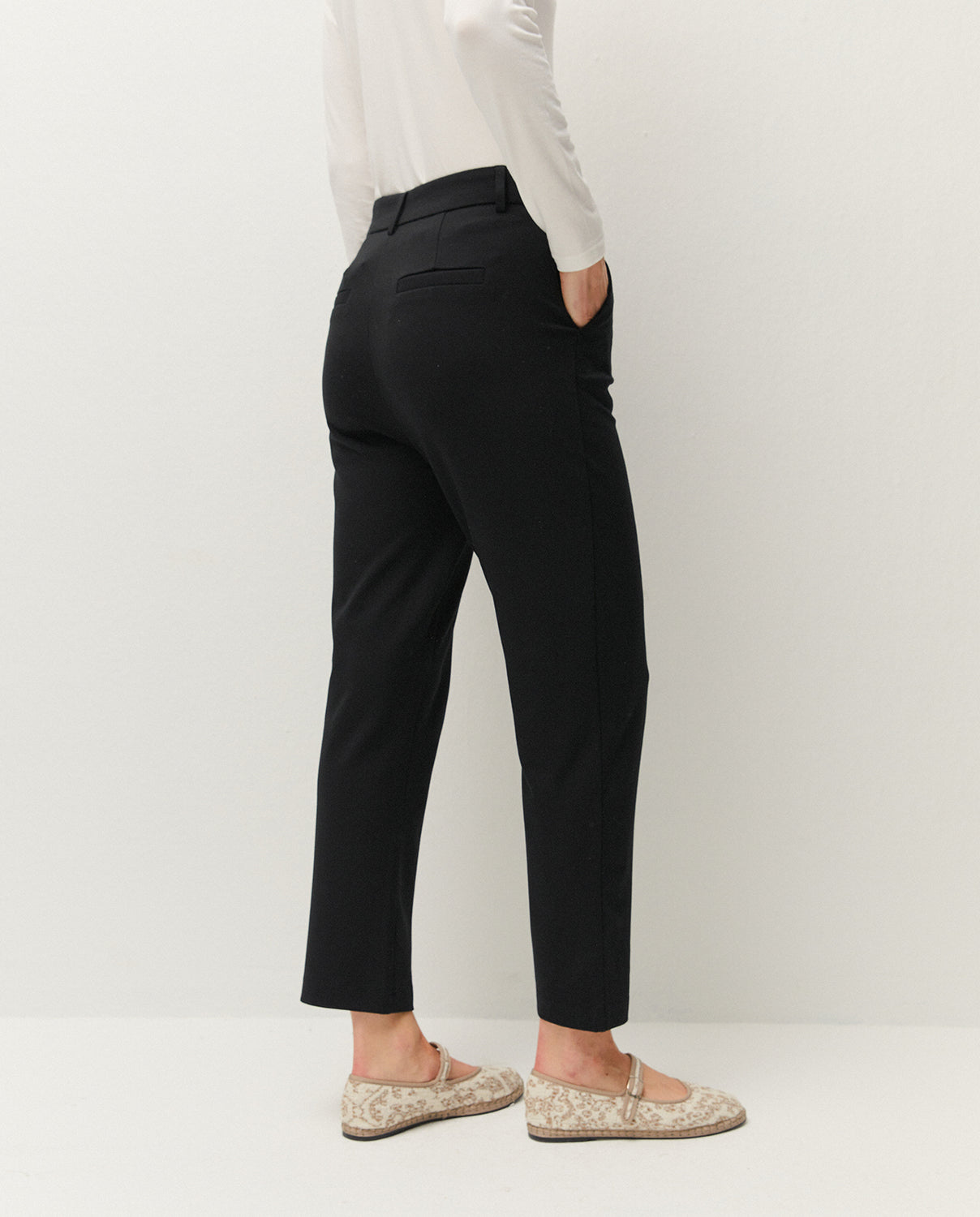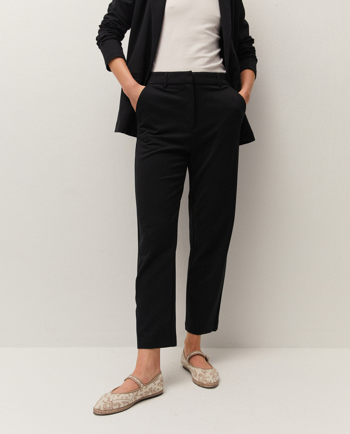 Pantalón fluido de traje con pinzas en el delantero y bolsillos laterales. Cierre con botón. Prenda sostenible.