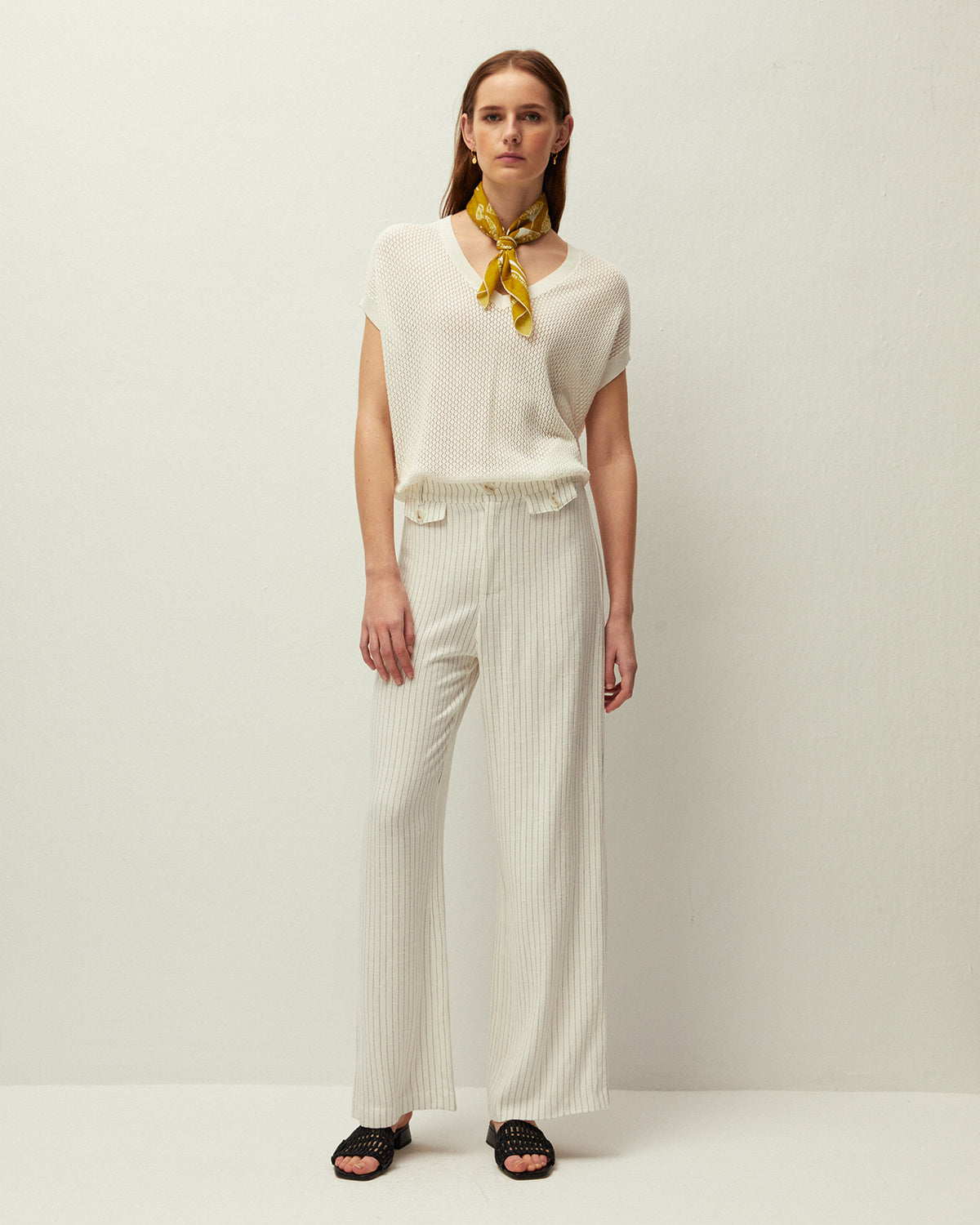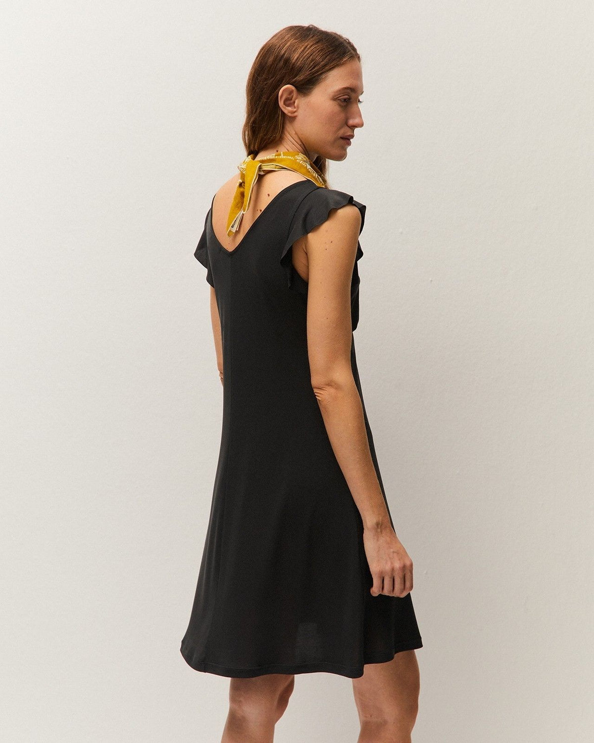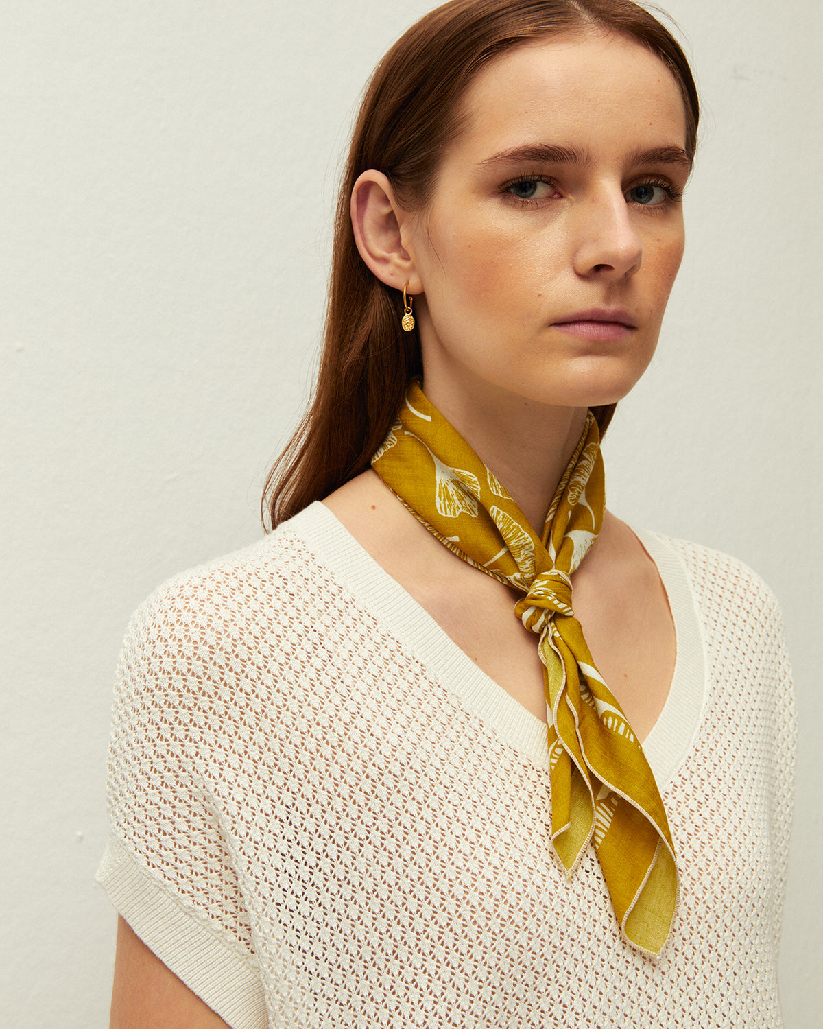 Pañuelo pequeño de color amarillo con estampado floral. Tejido de algodón