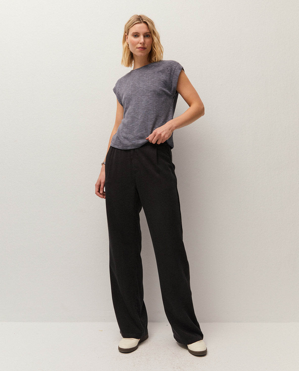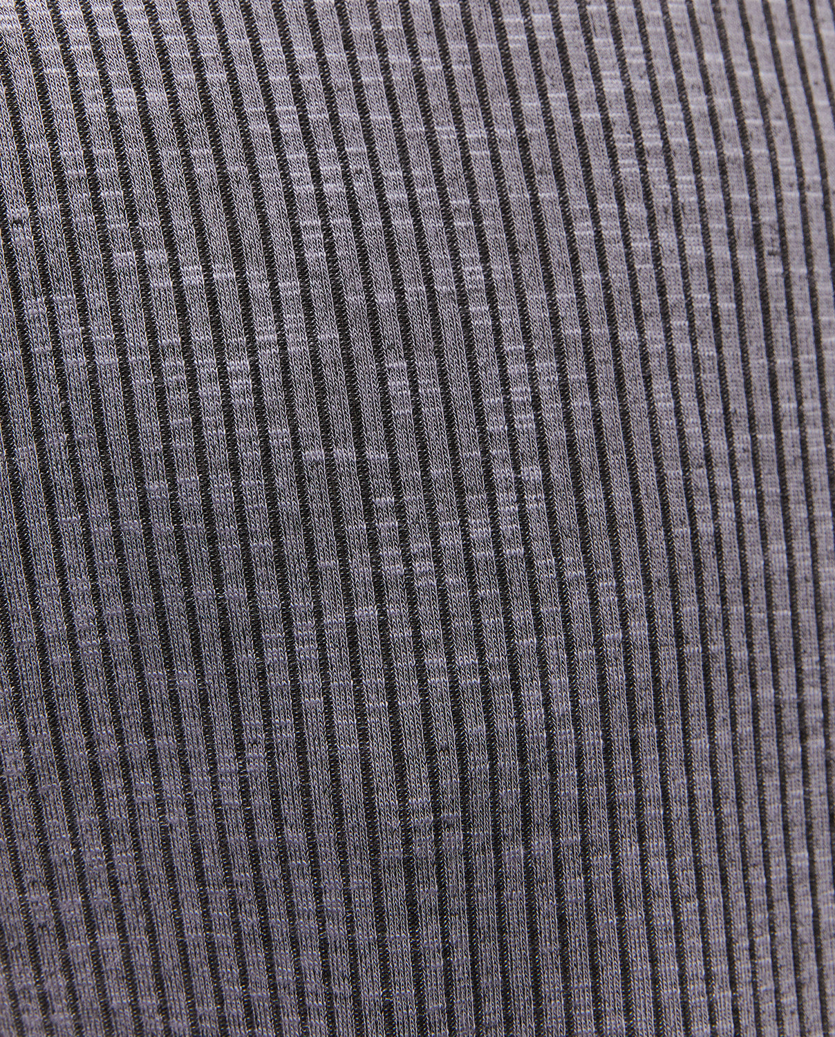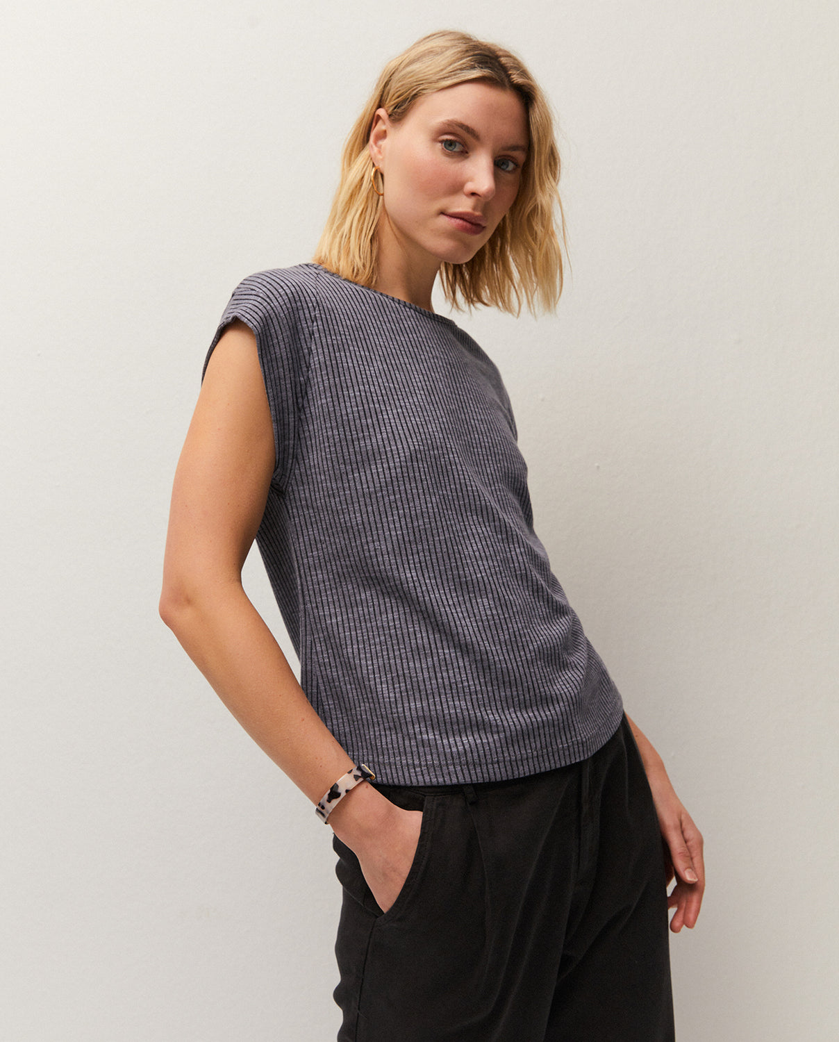 Camiseta de mujer de cuello redondo y manga corta, confeccionada en tejido de canalé. Prenda sostenible.