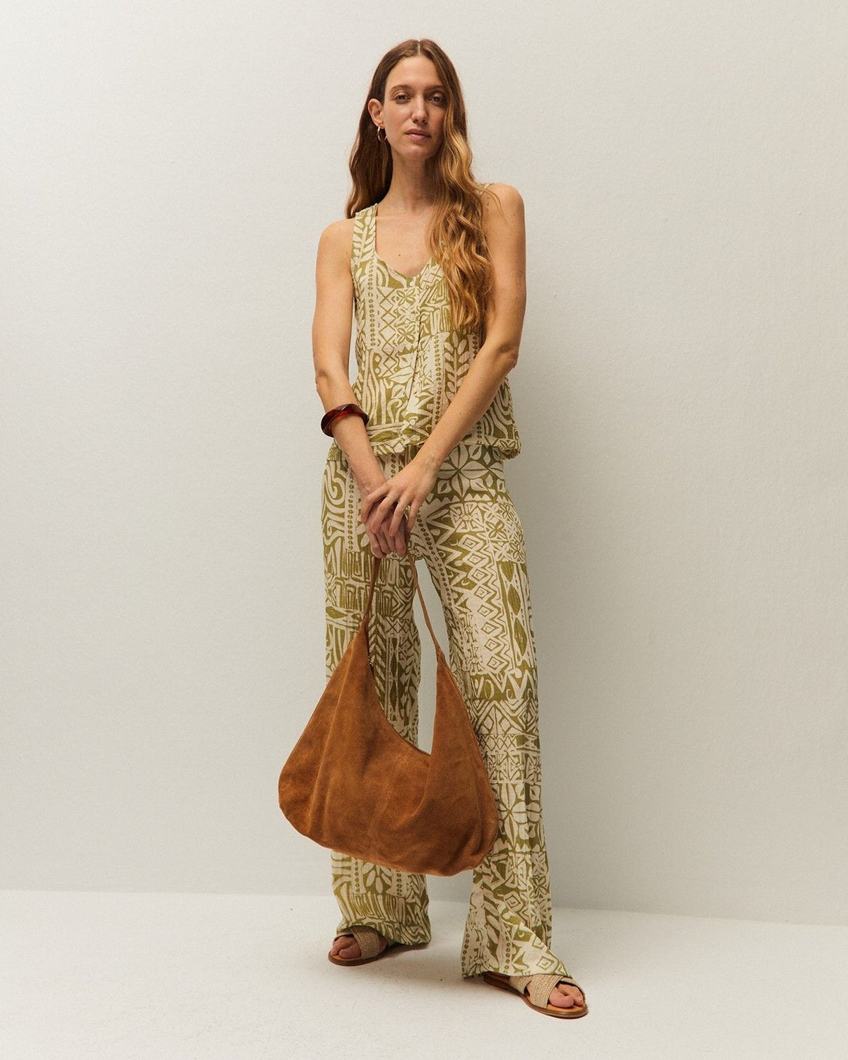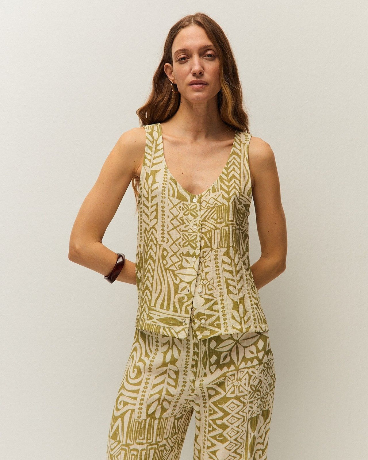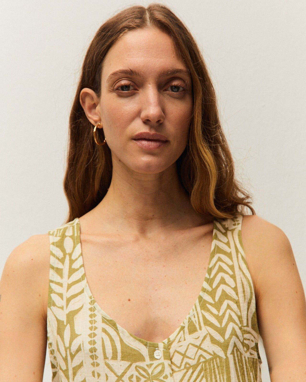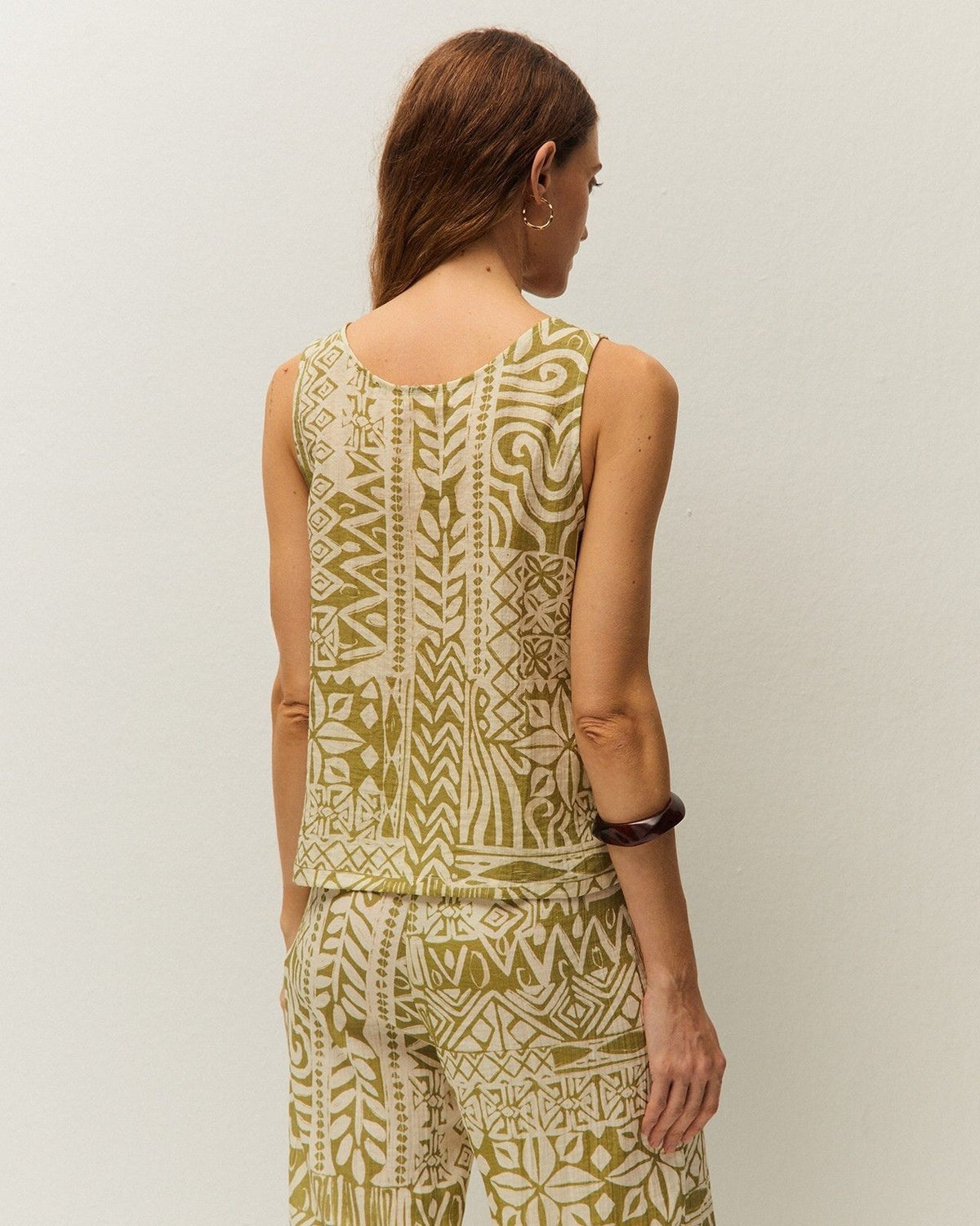 Top estampado con cuello redondo y tirantes. Cierre frontal con botones. Prenda sostenible.