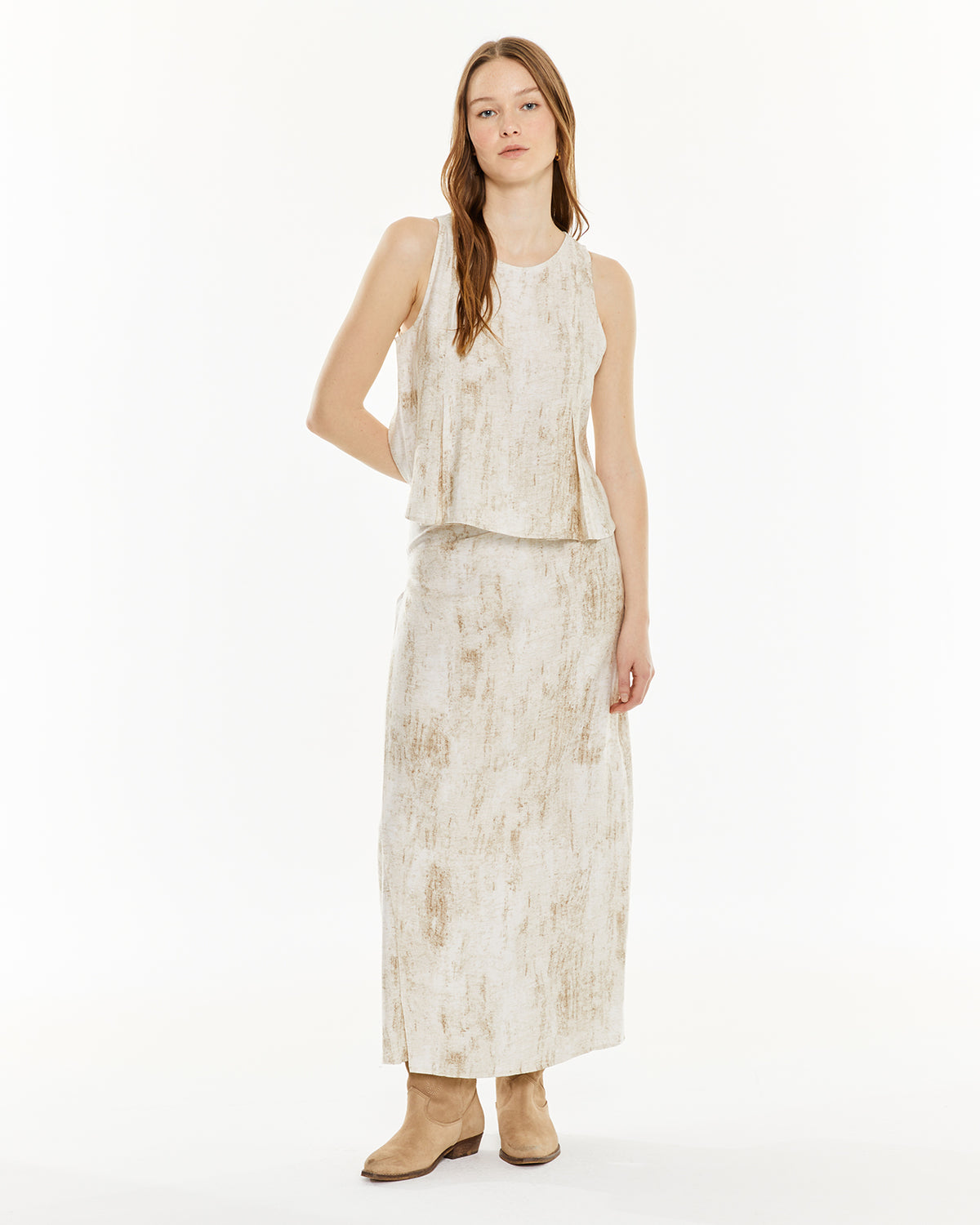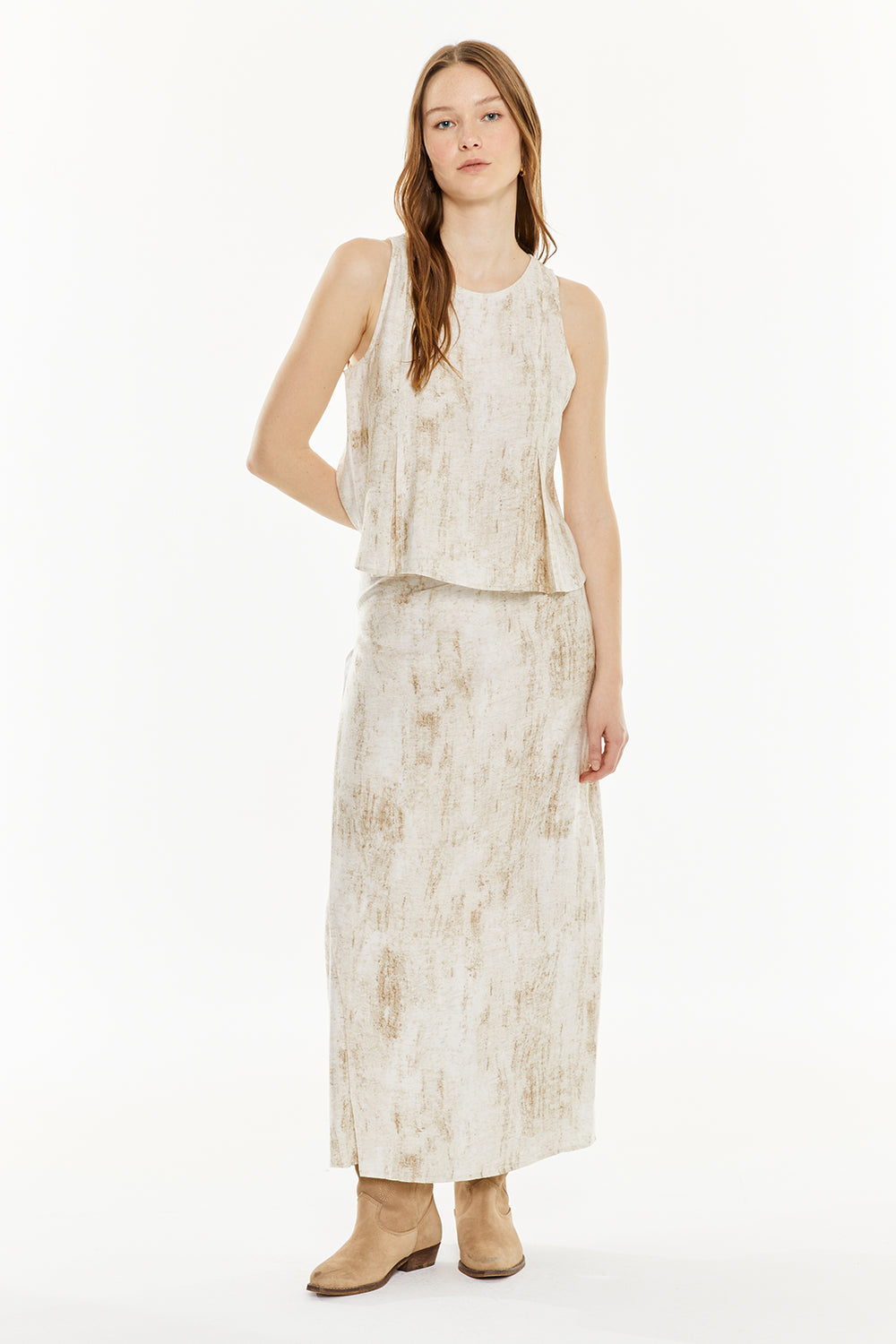 Top sin mangas de mujer con estampado tie-dye, escote redondo y detalle de fuelles en el bajo. Prenda sostenible.