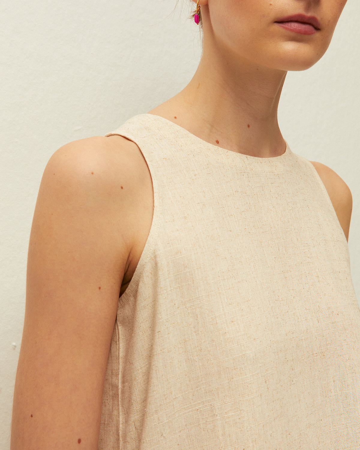 Top con cuello redondo y tirantes, confeccionado en tejido de foil dorado. Prenda sostenible.