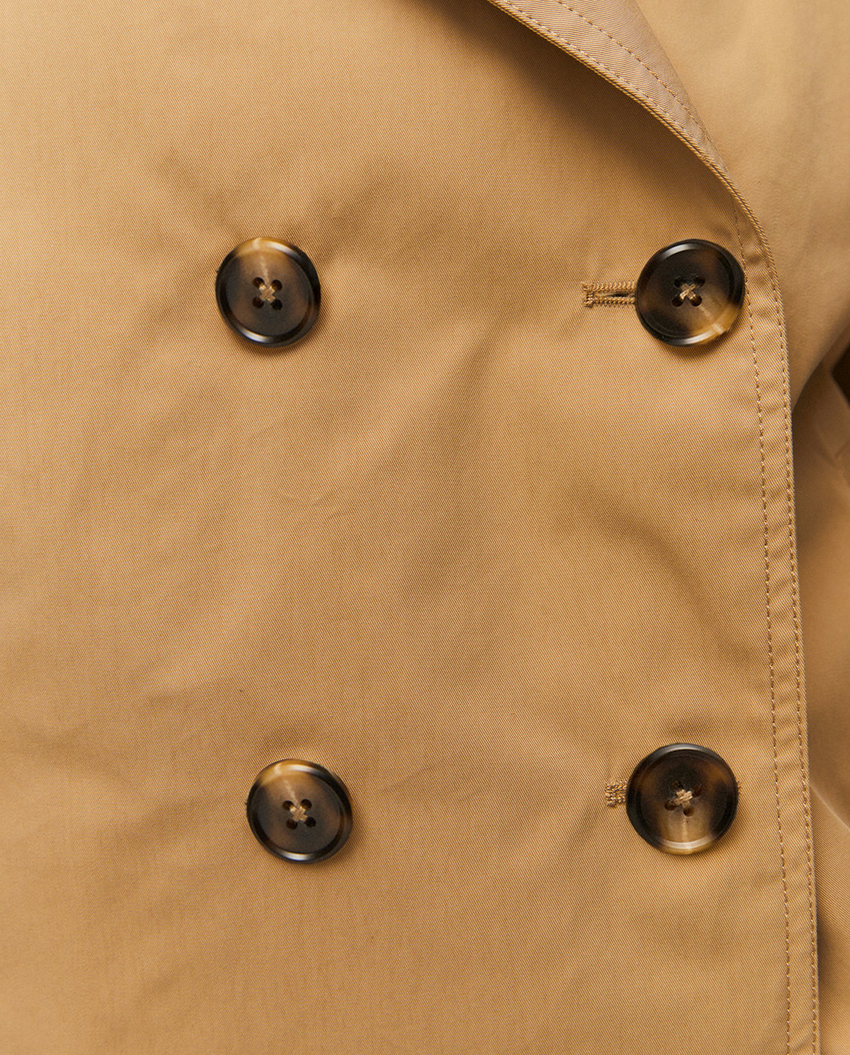 Trench corto de mujer con cuello camisero y manga larga con trabilla y botón. Bolsillos delanteros. Forro interior estampado. Cierre frontal con botones.