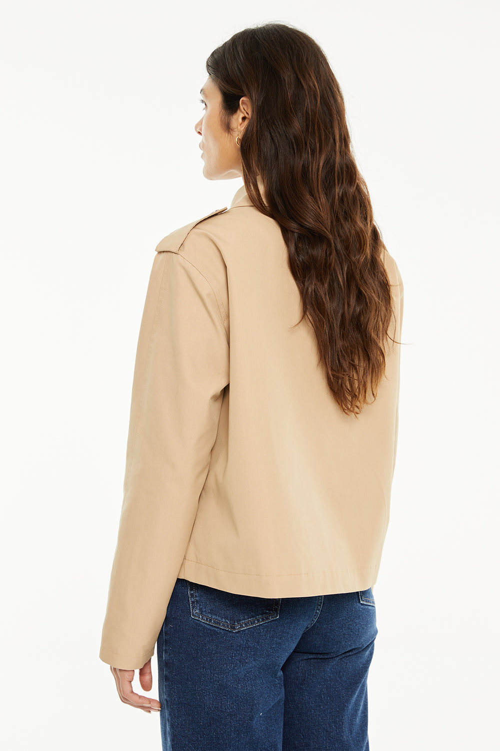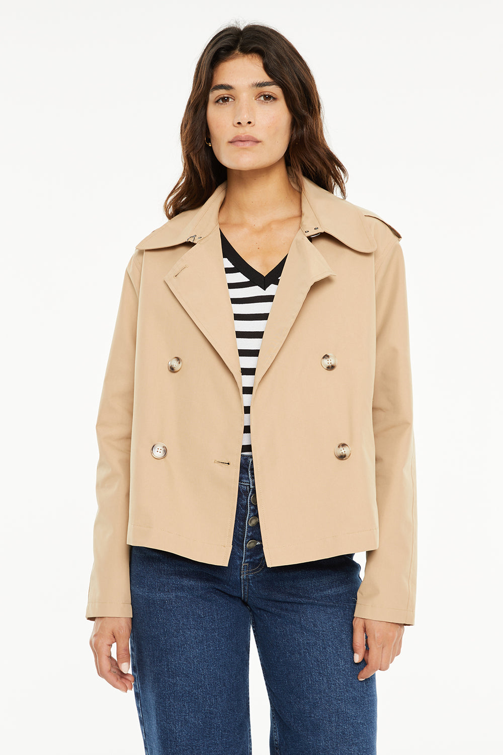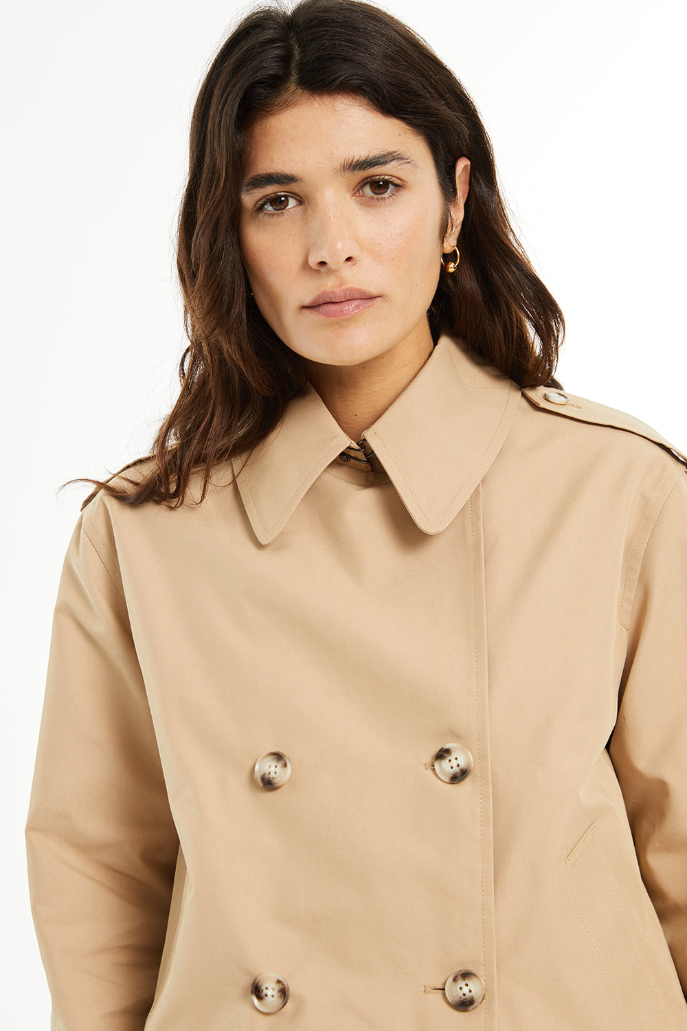 Trench corto de mujer, con cuello camisero, cierre delantero con botones y bolsillos delanteros.