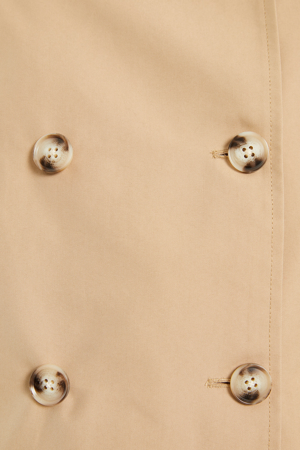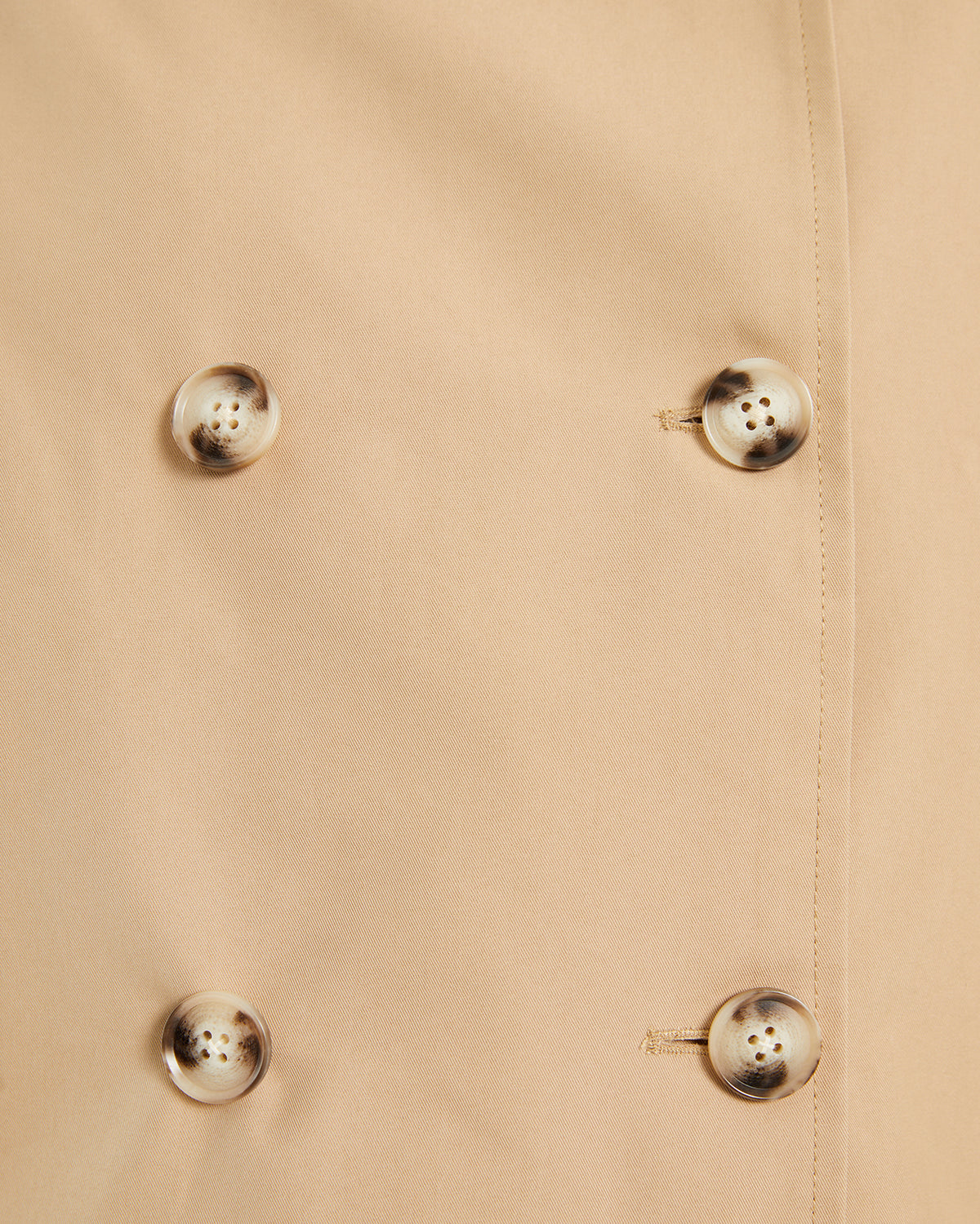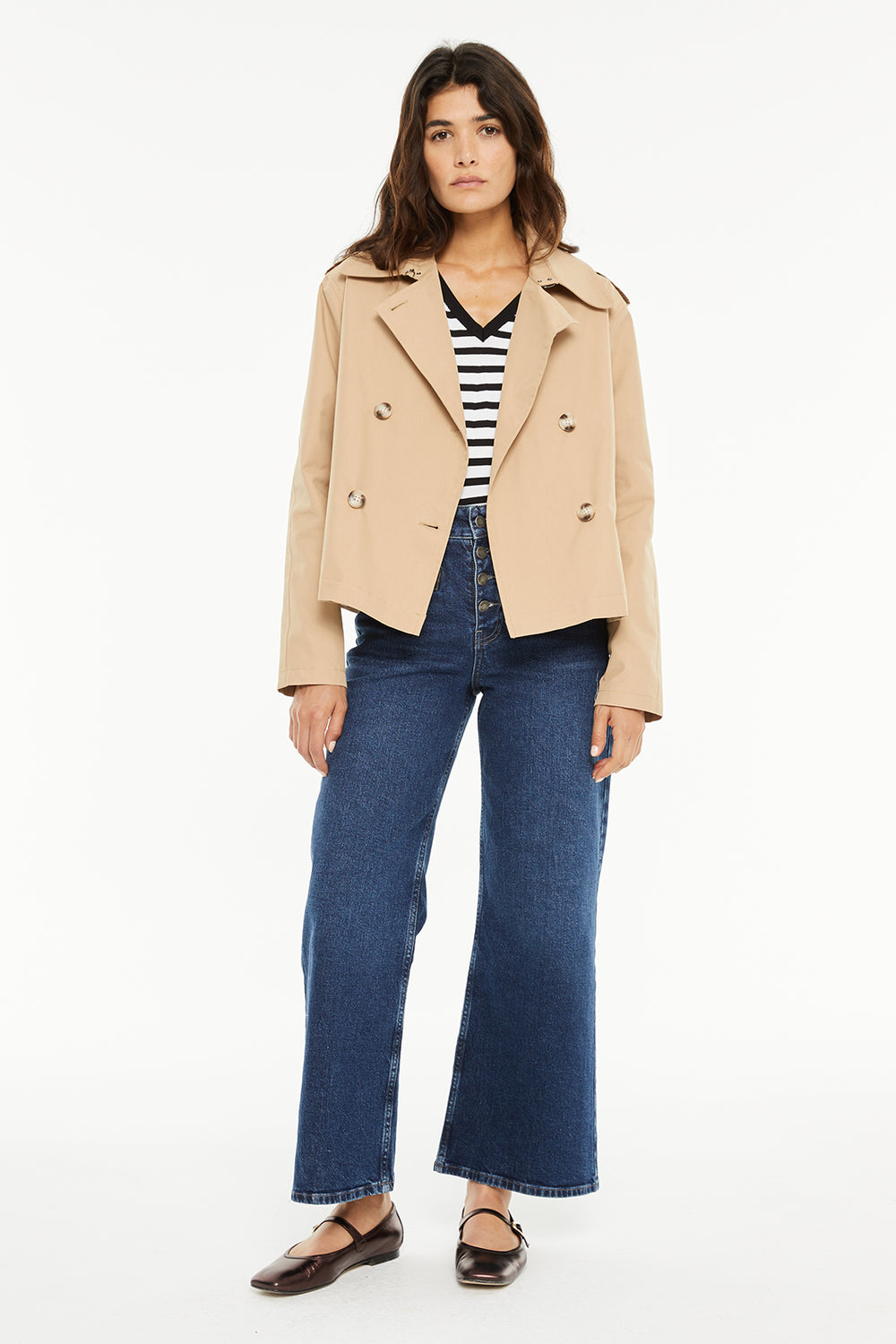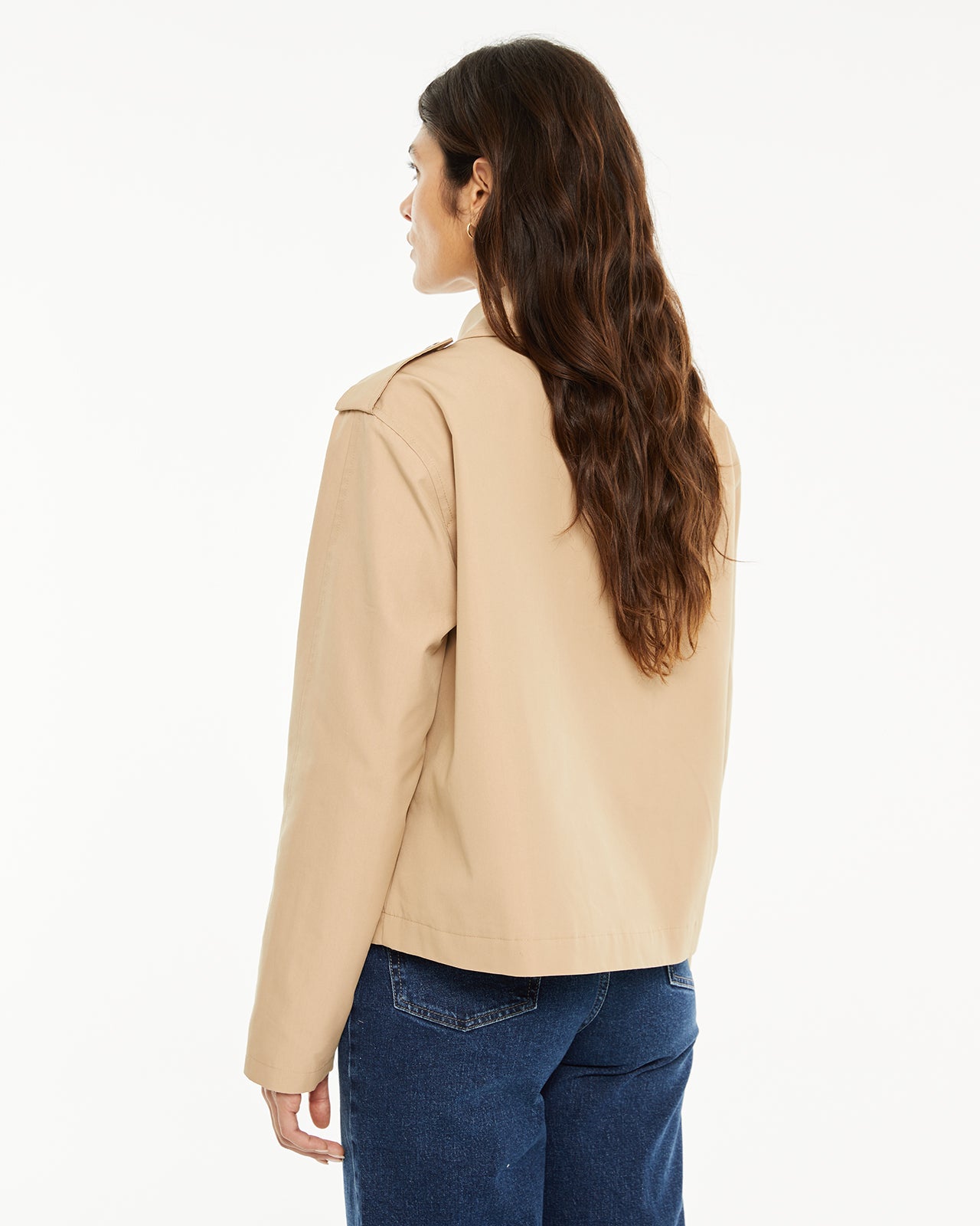 Trench corto de mujer, con cuello camisero, cierre delantero con botones y bolsillos delanteros.